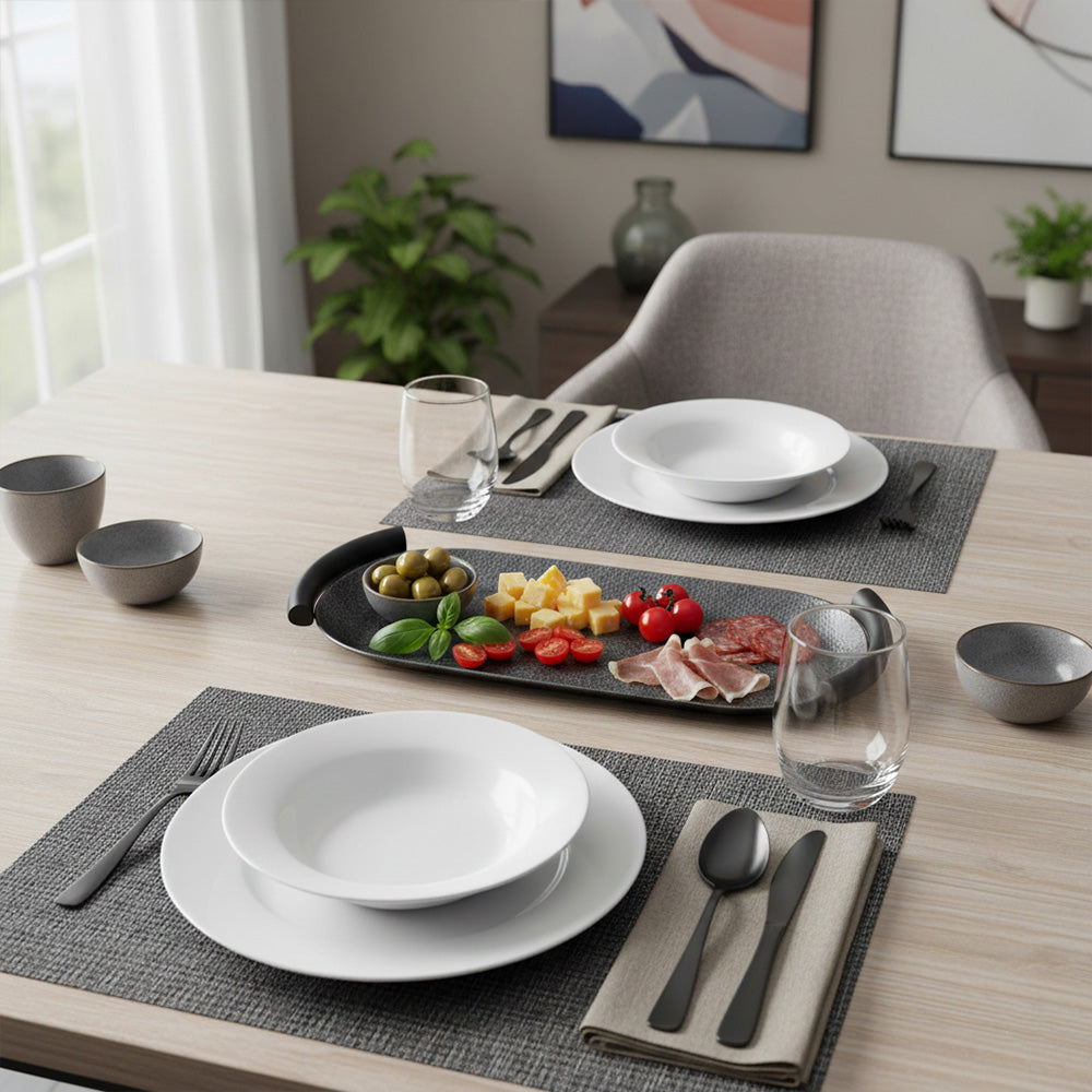 تتوفر الصينية بثلاثة ألوان رائعة: الأسود غير اللامع، واللون الجميل، واللون الفاخر. تتميز بمقابض أنيقة ومريحة بألوان متباينة من الأسود أو البني لمزيد من الأناقة والراحة. يسهل تصميم المقابض الفريد حمل الصينية، كما أنه يكمل جمالها العصري.