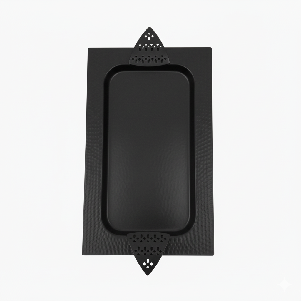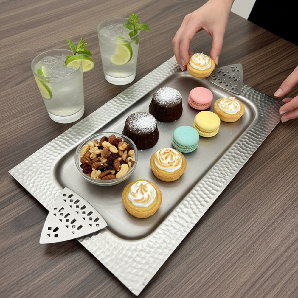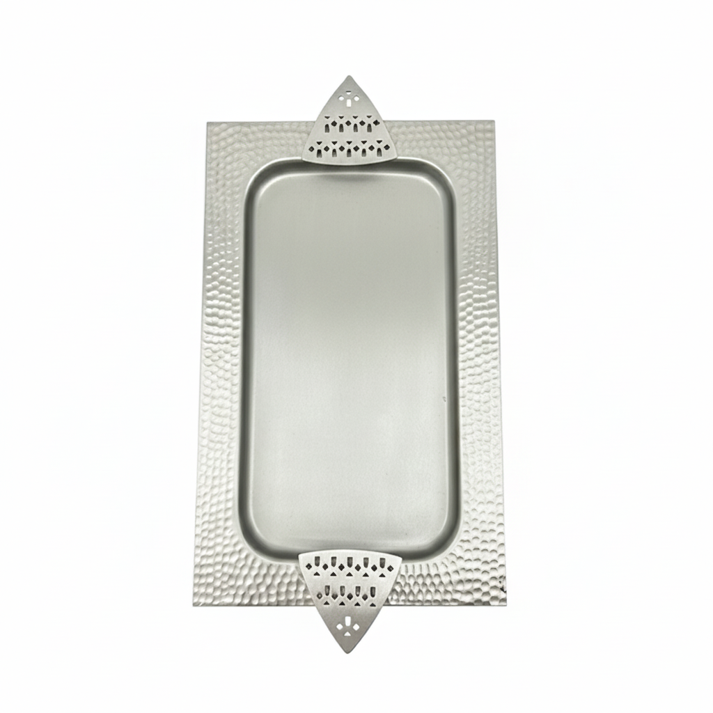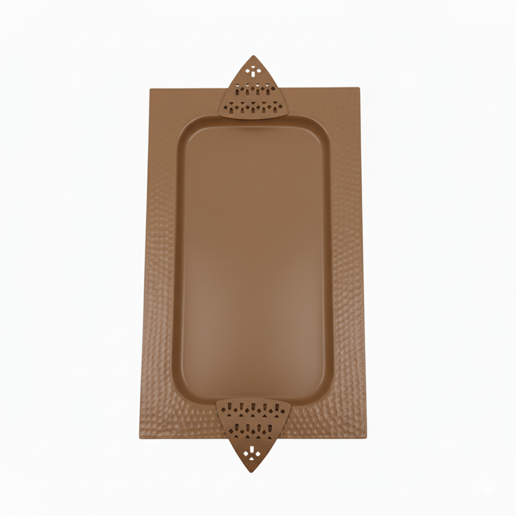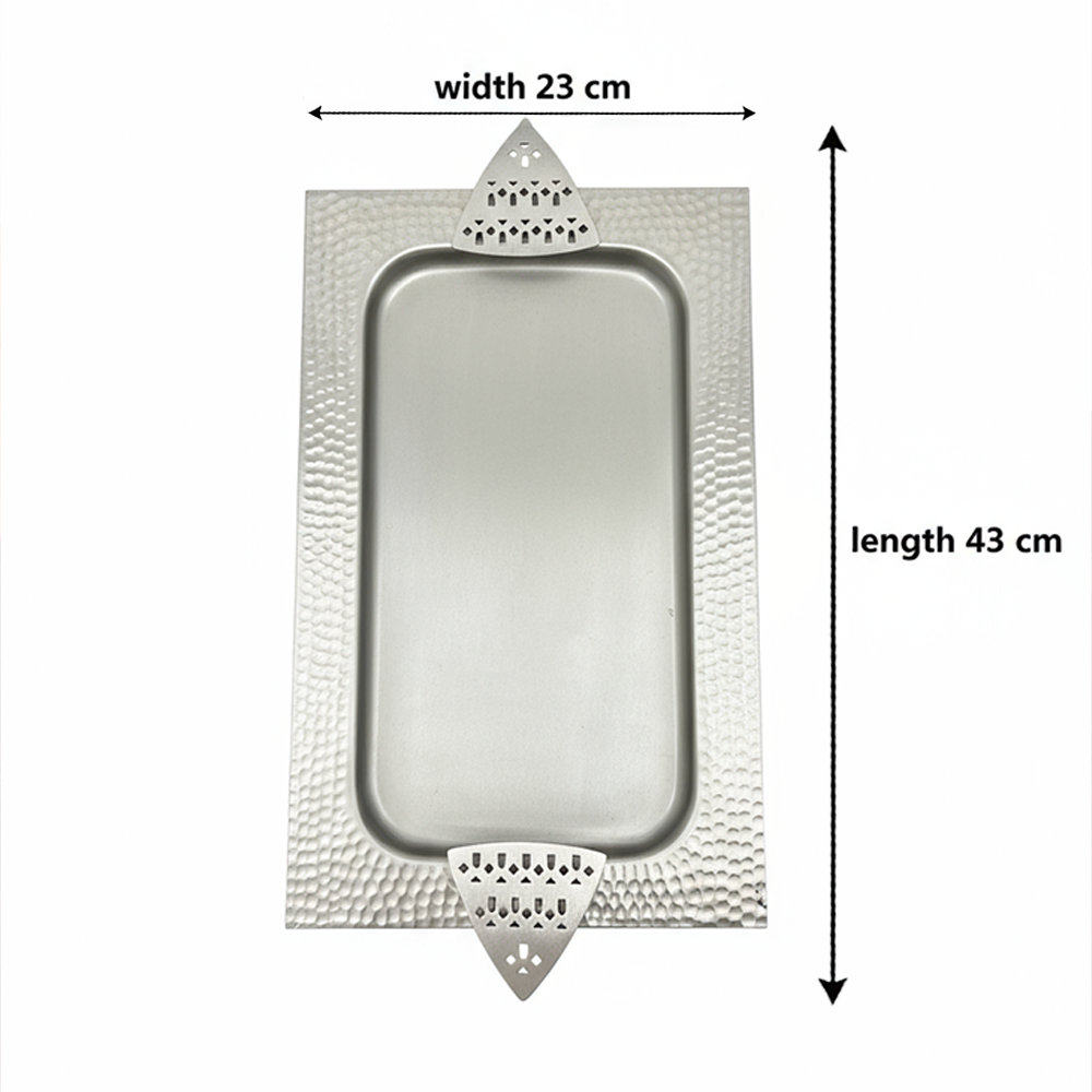 أضيفي لمسة من الفخامة والرقي إلى ضيافتك مع صينية التقديم المعدنية الفاخرة بتصميم مستطيل مميز (الطول 43 سم × العرض 23 سم).