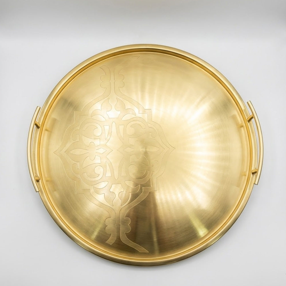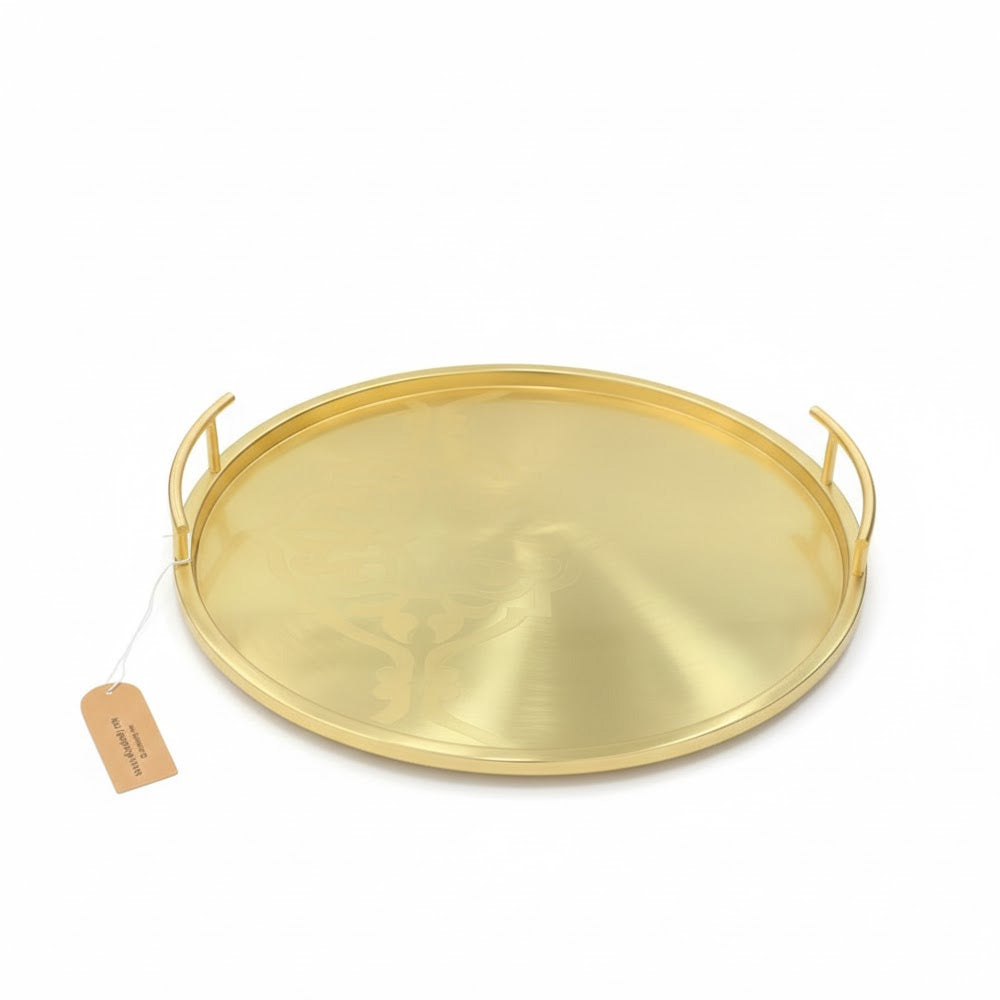 أضف لمسة من الأناقة إلى ديكور منزلك مع صينية التقديم المعدنية الدائرية الأنيقة هذه. مصنوعة من معدن عالي الجودة، تتميز هذه الصينية العصرية بسطح أملس وحواف مرتفعة ومقابض جانبية متينة لسهولة الحمل وأمانه.