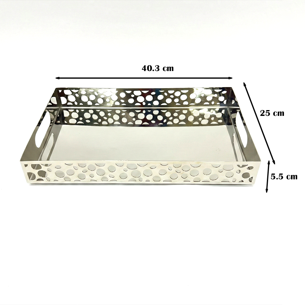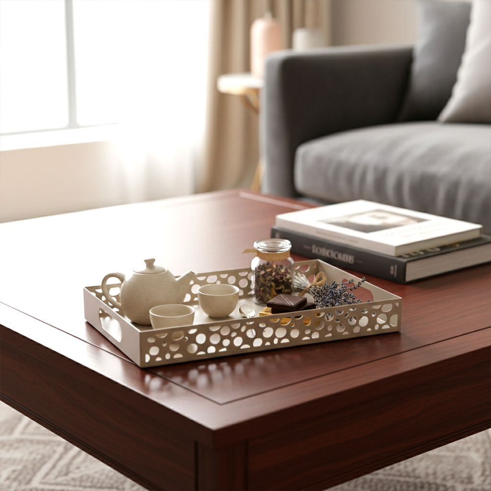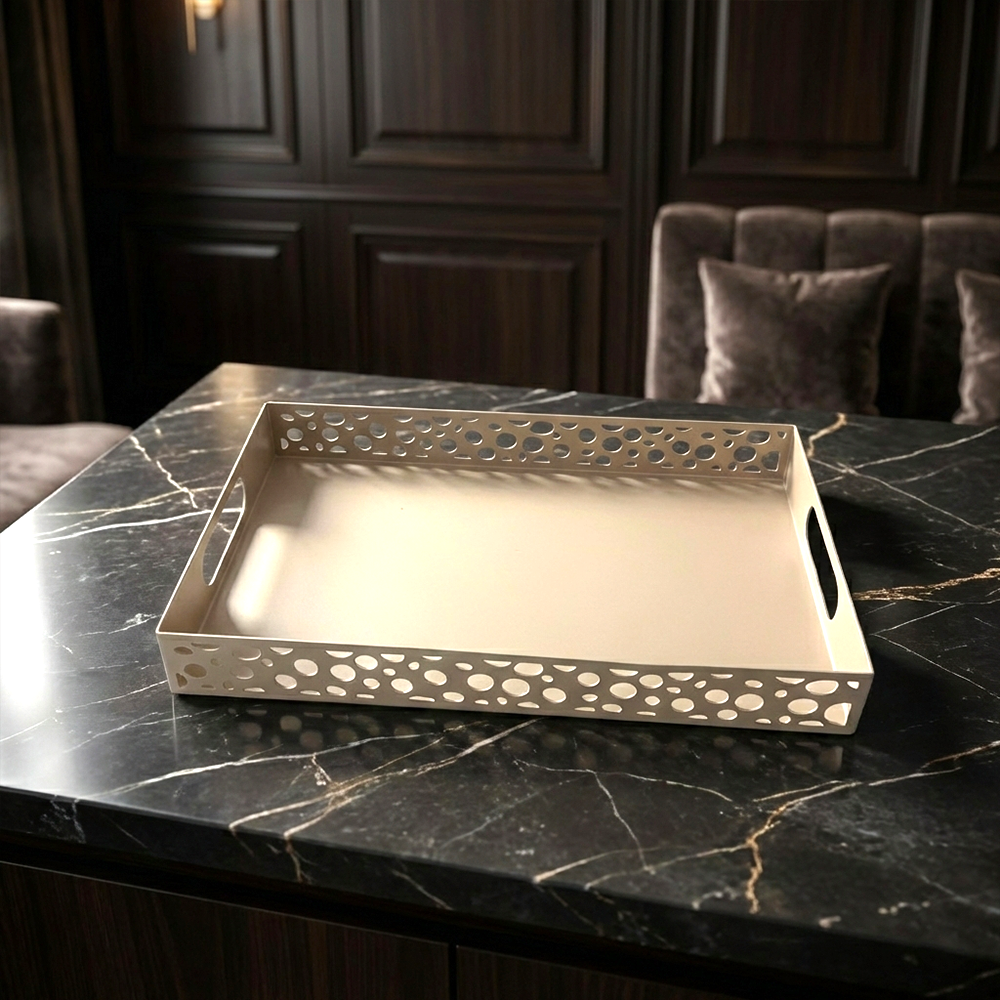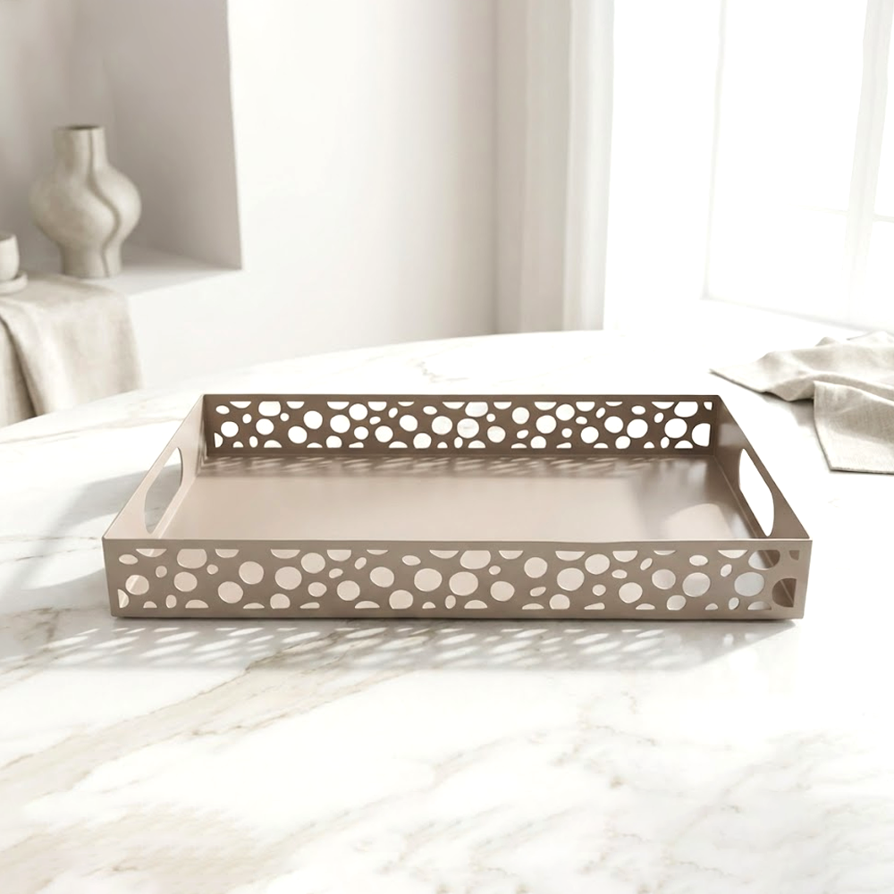 أضِف لمسة فخامة لترتيب ضيافتك مع صينية تقديم معدنية بتصميم عصري بنقشة الدوائر وحواف مرتفعة تمنح ثباتًا وأناقة على الطاولة. تأتي باللونين الفضي اللامع والبيج الراقي لتناسب ديكورات المجالس والصالونات، مثالية لتقديم الشاي والقهوة والتمر والحلويات أو لتنظيم العطور والإكسسوارات على طاولة القهوة.