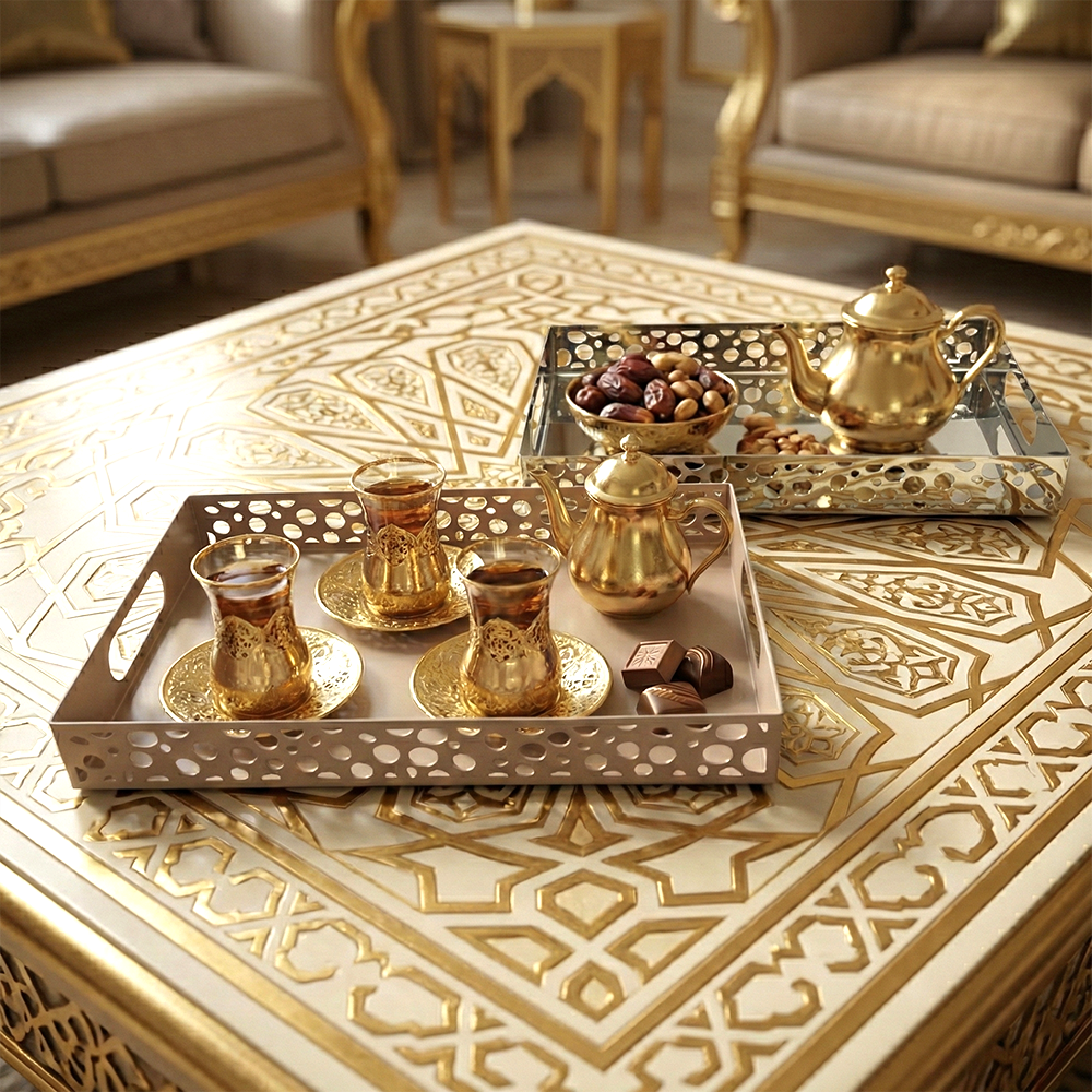 تنظيم أدوات الضيافة على طاولة القهوة.