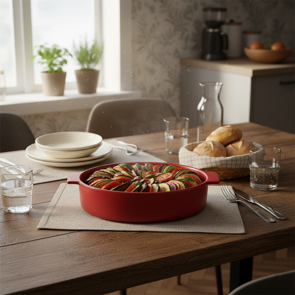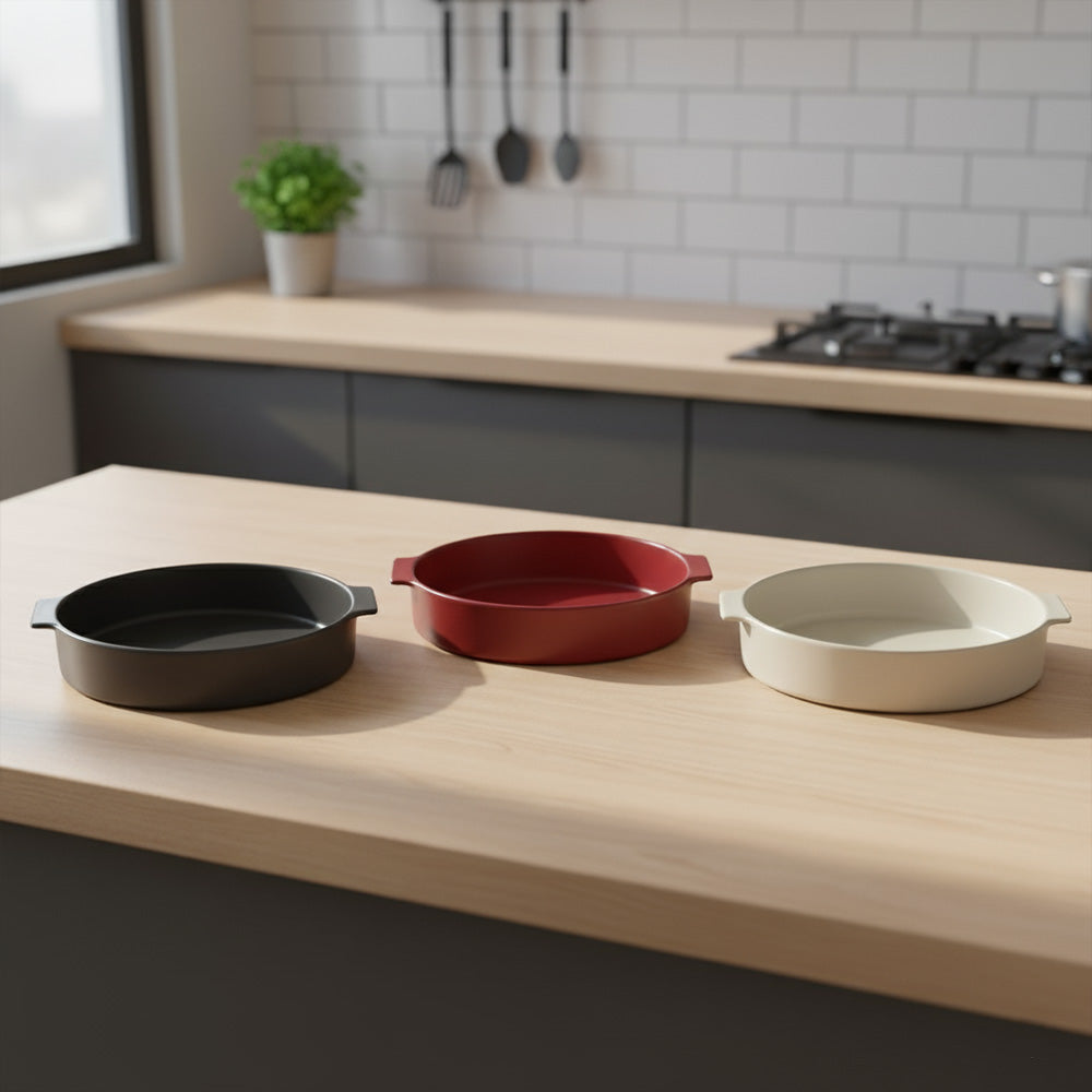 يتوفر هذا الطبق بثلاثة ألوان أنيقة: البيج، والأحمر، والأسود، ليضفي لمسة عصرية وأنيقة على مطبخك وطاولة طعامك. مقابضه العريضة تُسهّل رفعه حتى عندما يكون الطبق ساخنًا. تضمن مادة البورسلين توزيعًا متساويًا للحرارة لطهي مثالي في كل مرة.