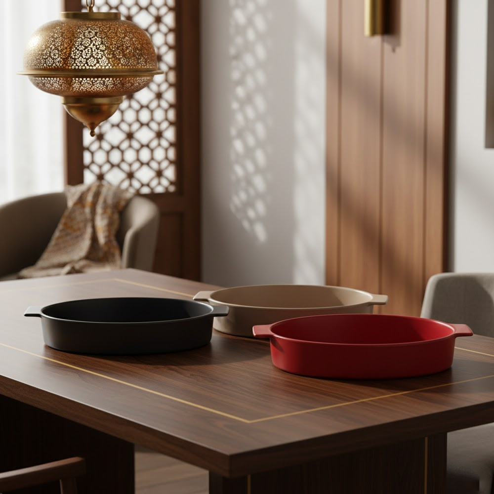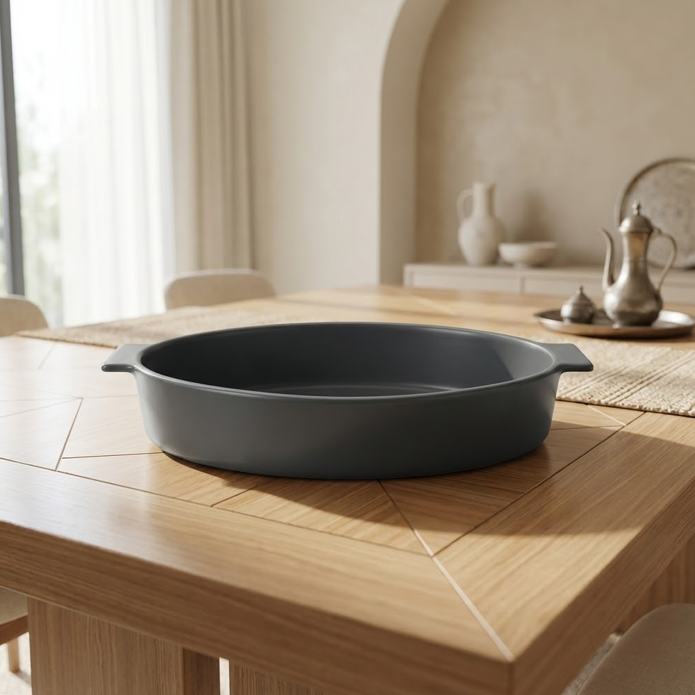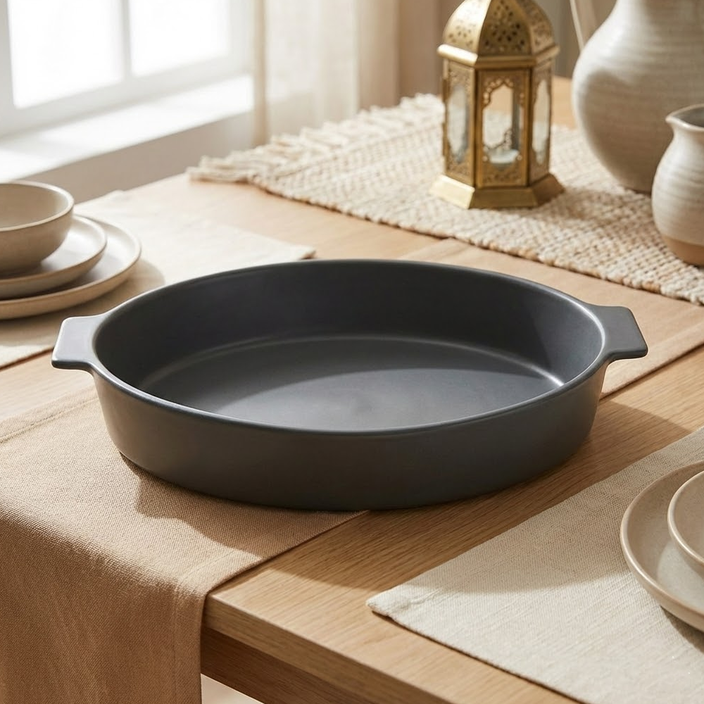 أضف لمطبخك ولمائدتك لمسة من الأناقة العملية مع صينية الفرن السيراميك الدائرية المصممة بعناية لتناسب الطهي اليومي والتقديم الراقي.