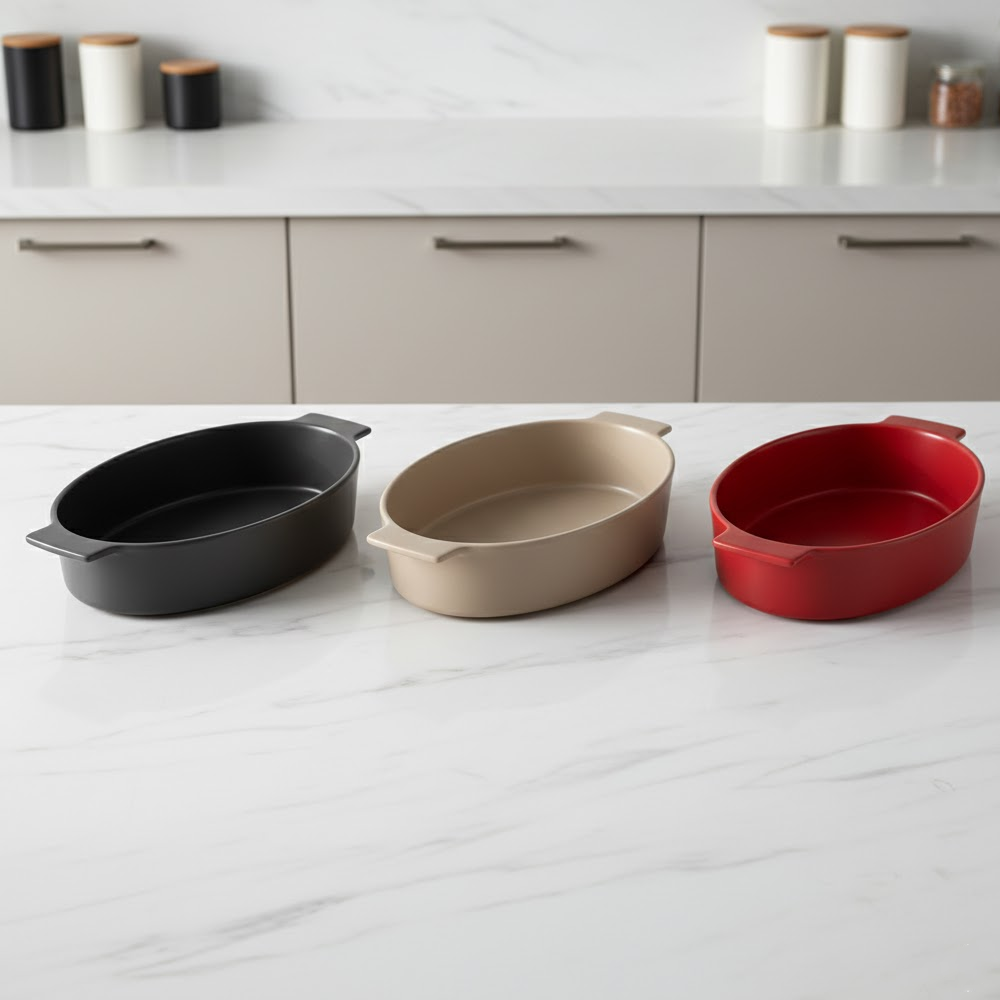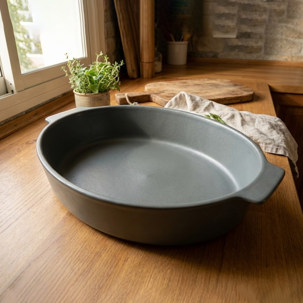 مصنوعة من سيراميك (Stoneware) عالي الجودة يتحمل درجات الحرارة المرتفعة، مما يجعلها مثالية للاستخدام في الفرن ثم التقديم مباشرة دون الحاجة لنقل الطعام.