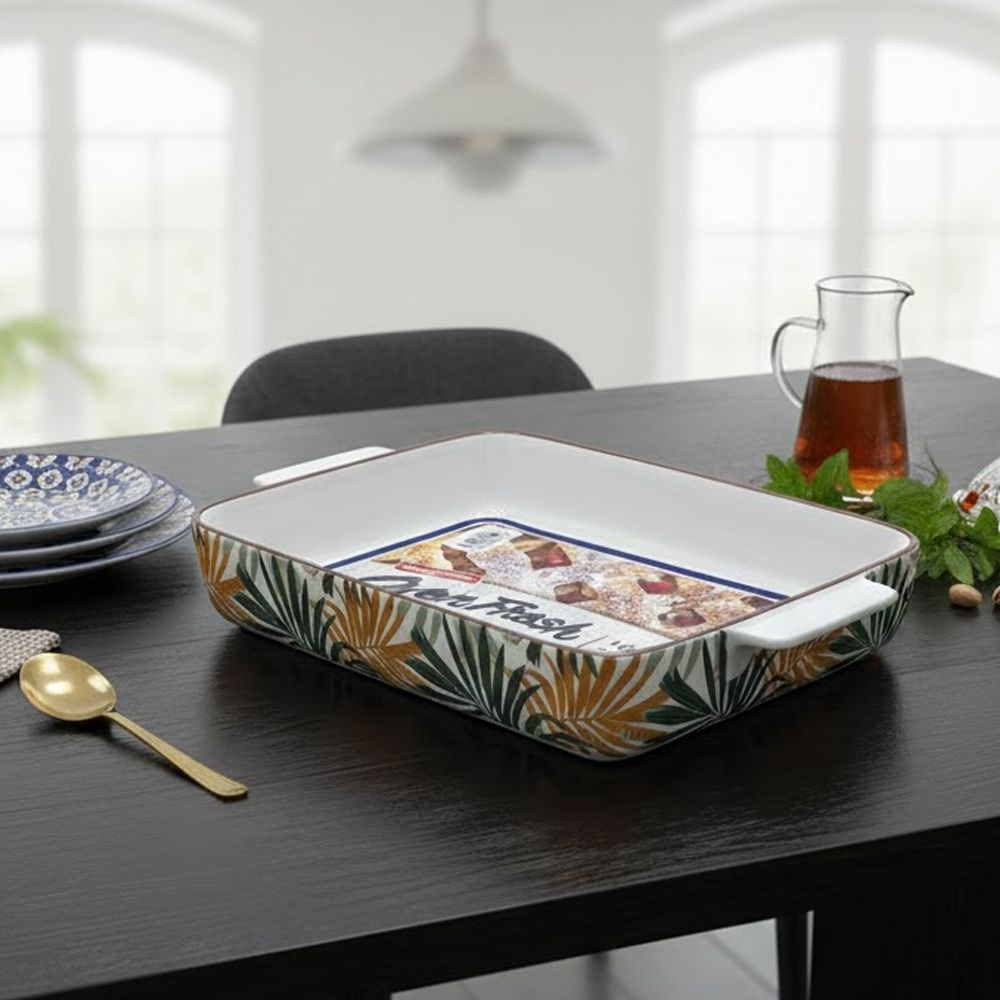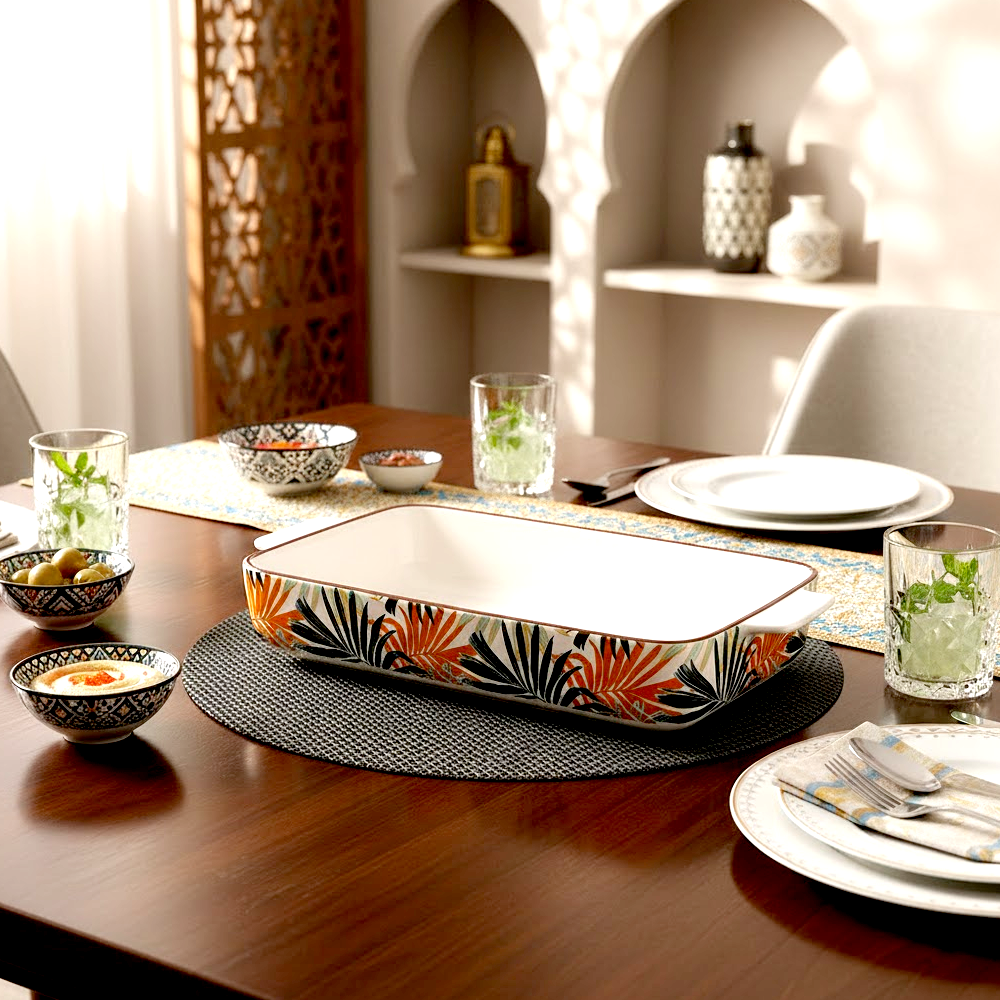 ارتقِ بتجربة الطهي والتقديم مع صينية الفرن السيراميك المستطيلة ذات التصميم المزخرف الأنيق المستوحى من الطبيعة.