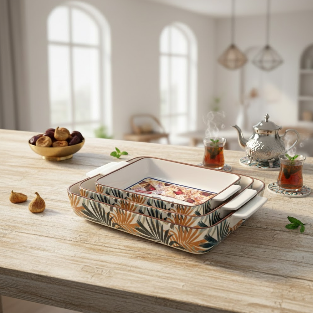 صواني فرن سيراميك مزخرفة بنقشة أوراق – 3 قطع متعددة الأحجام مقاومة للحرارة