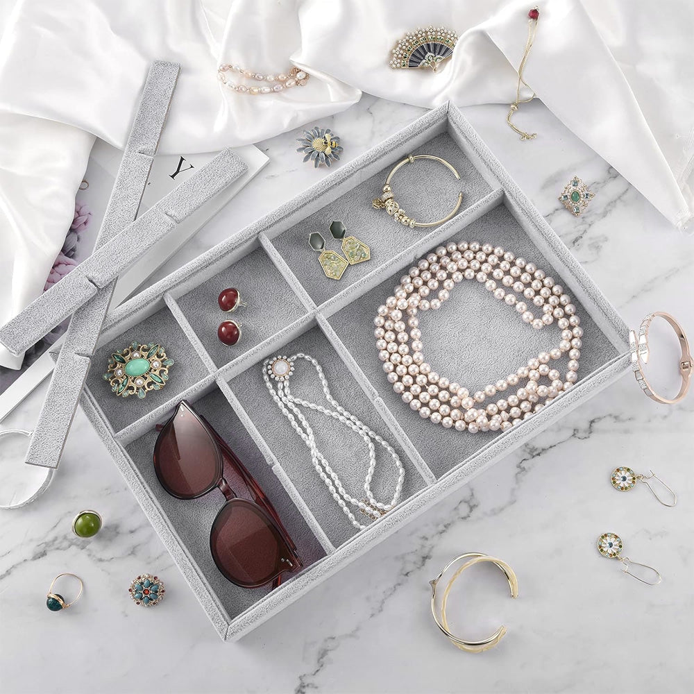 💍[مادة عالية الجودة]: صينية المجوهرات مصنوعة من لوح مركب قوي ملتوي من مخمل فاخر مع مقسمات حجرة قابلة للإزالة. ناعمة الملمس وتحمي مجوهراتك من الخدوش. ناعمة الملمس وتحمي مجوهراتك من الخدوش.