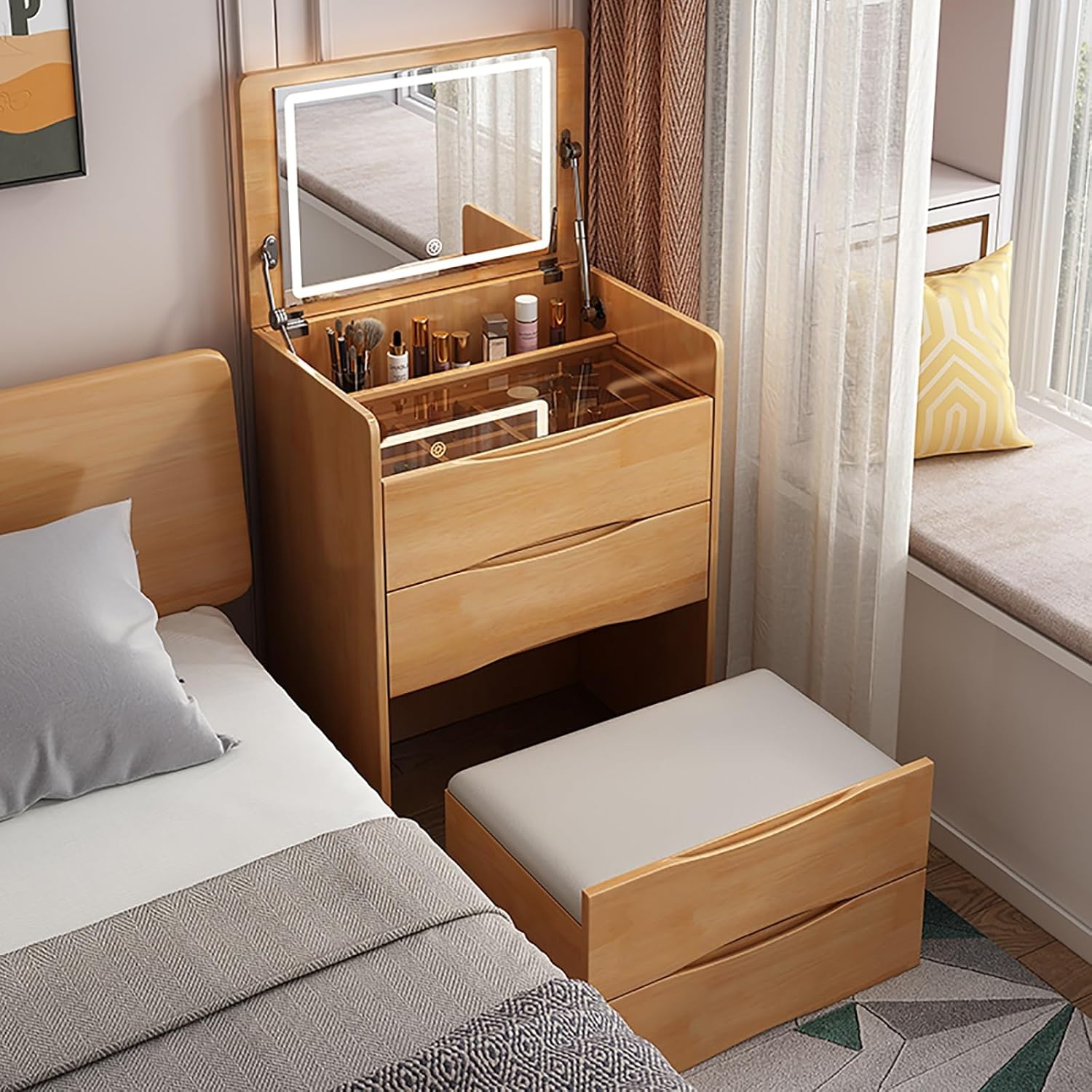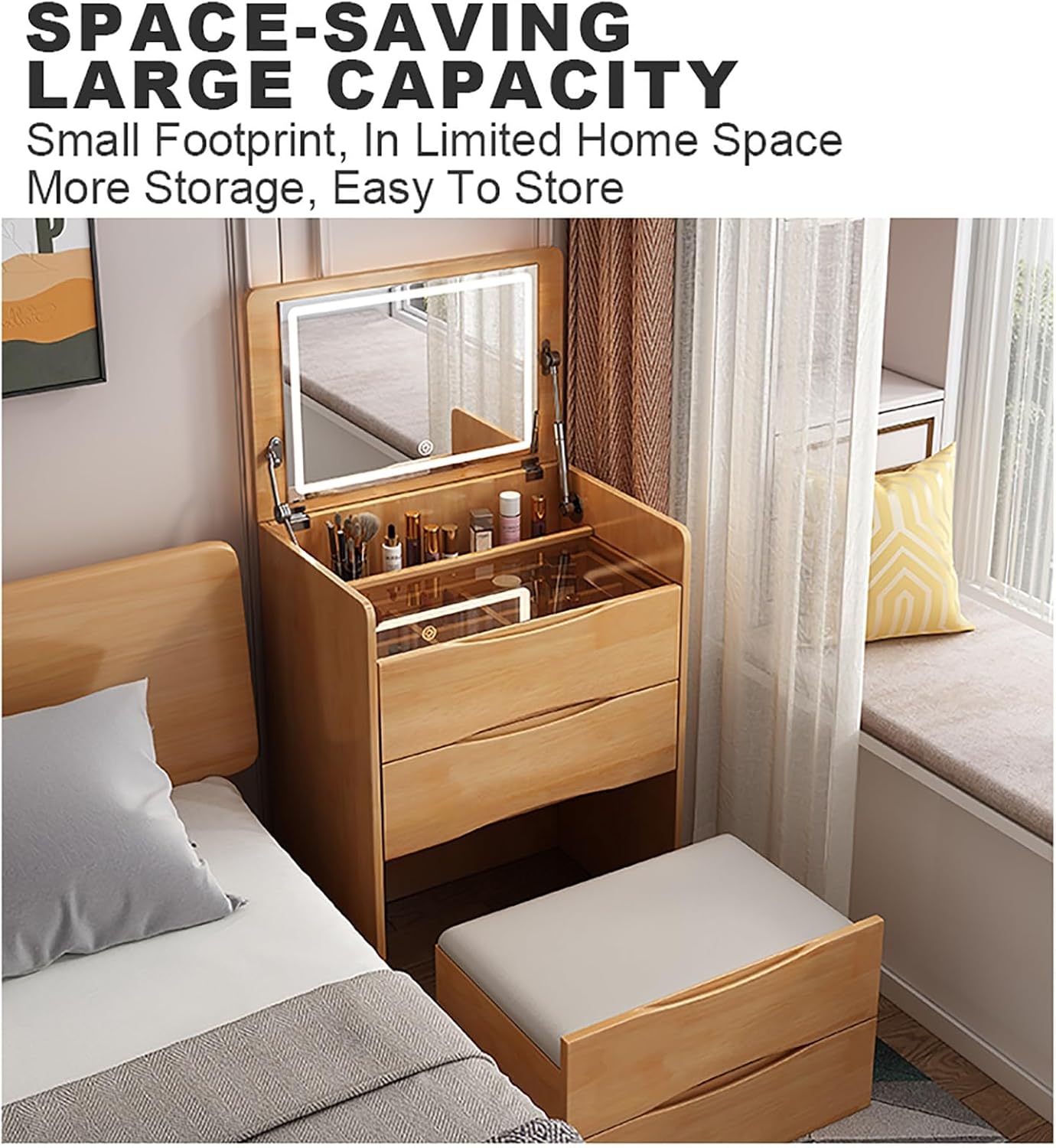 3. 【متعدد الوظائف】: مع تصميم مرآة قابلة للطي، يمكن أيضًا استخدام مكتب الزينة متعدد الاستخدامات هذا مع مرآة وأضواء كمكتب دراسة أو خزانة بجانب السرير، مما يزيد من فائدة المساحة في غرف النوم الصغيرة أو شقق الاستوديو.