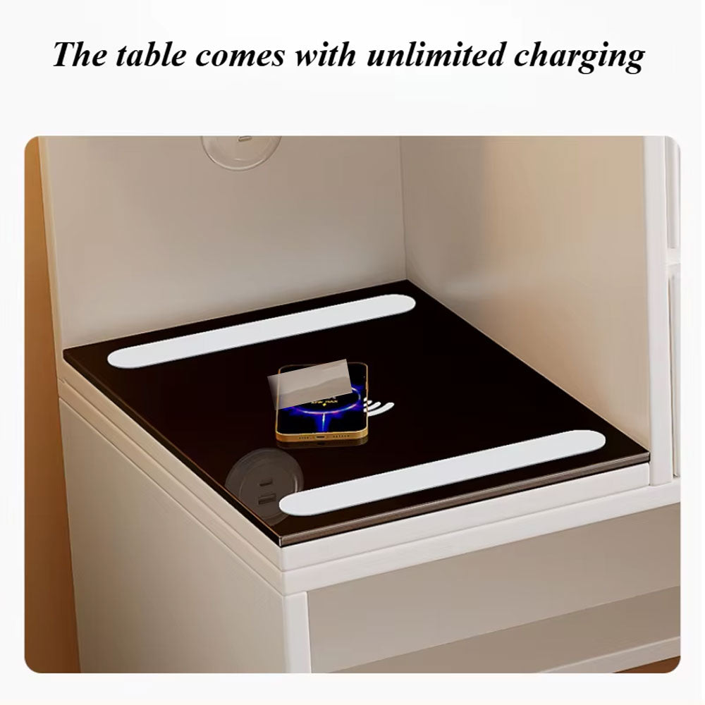 طاولة زينة مع مرآة وأضواء، طاولة مكياج مع مقعد لغرفة النوم، مرآة زينة ذكية قابلة للتعديل مضيئة بألوان متعددة، طاولة عريضة، أدراج، خزانة تخزين، تصميم قابل للتعديل مع وظيفة الشحن اللاسلكي