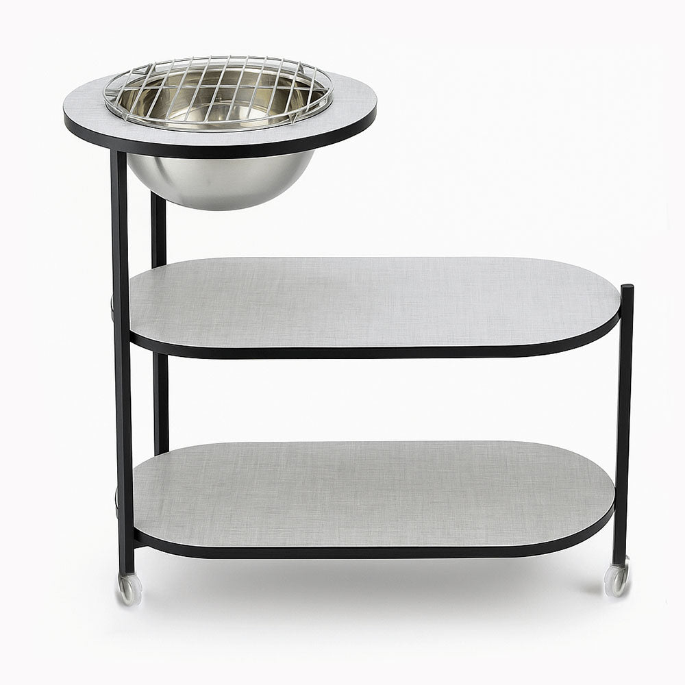 🔥 تصميم عملي وأنيق: طاولة بثلاثة مستويات ومساحة علوية تحتوي على وعاء شواء فحم مدمج مع شبكة شواء معدنية.