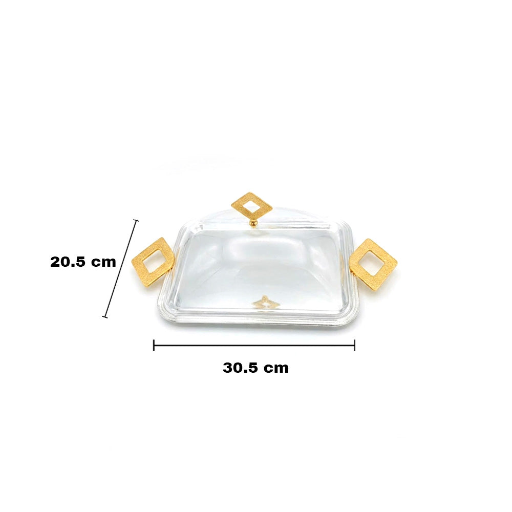 تتميز الصينية بغطاء شفاف مقبب يتيح رؤية كاملة لما بداخلها، مما يجعلها مثالية لاستقبال الضيوف أو لعرض البوفيهات. تضفي المقابض المربعة المزخرفة على الغطاء والجوانب مظهرًا فاخرًا وتسهل حملها. حجمها الصغير والواسع في الوقت نفسه يجعلها مناسبة للاستخدام اليومي والمناسبات الخاصة.