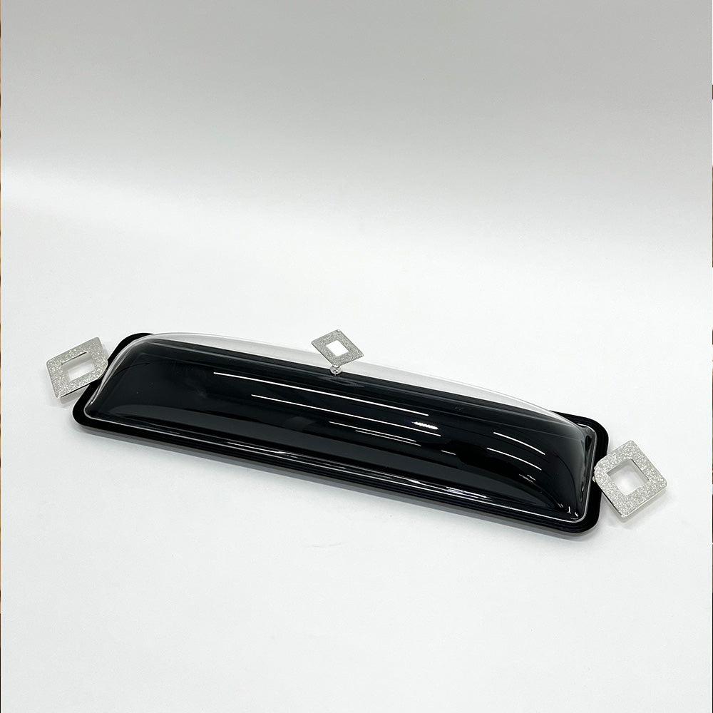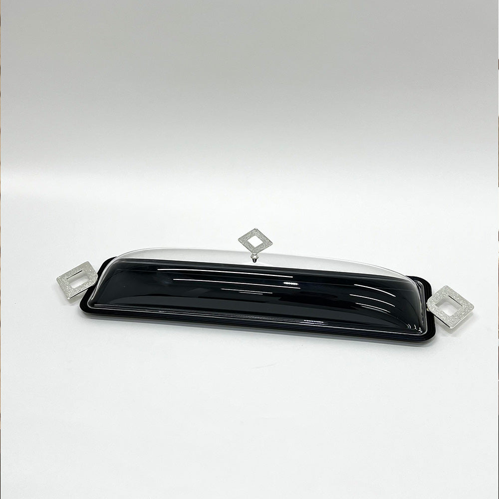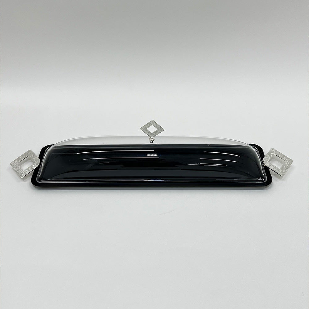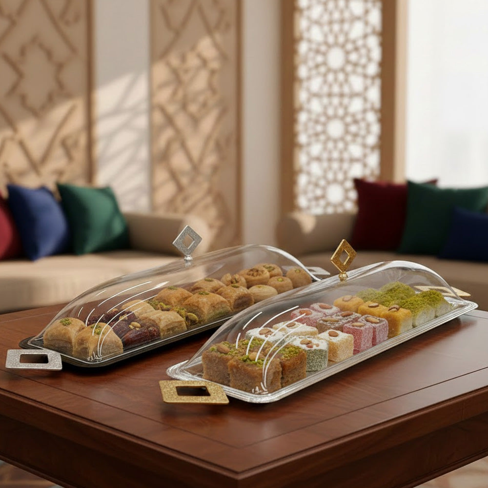 يتميز الوعاء بتصميمه الانسيابي الأنيق وشكله المستطيل العصري، مع غطاء شفاف يمنح رؤية واضحة للمحتوى ويحافظ على الحلويات طازجة ومحميّة. الإطار الخارجي مصمم بدقة ليعكس الذوق الفاخر، مع لمسات معدنية أنيقة في المقابض تضيف إحساسًا بالفخامة والتميز.