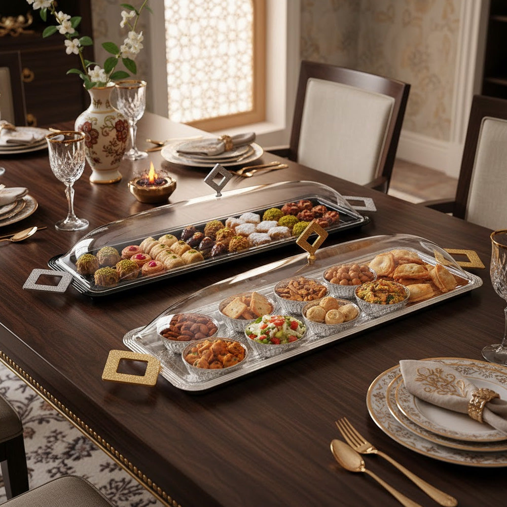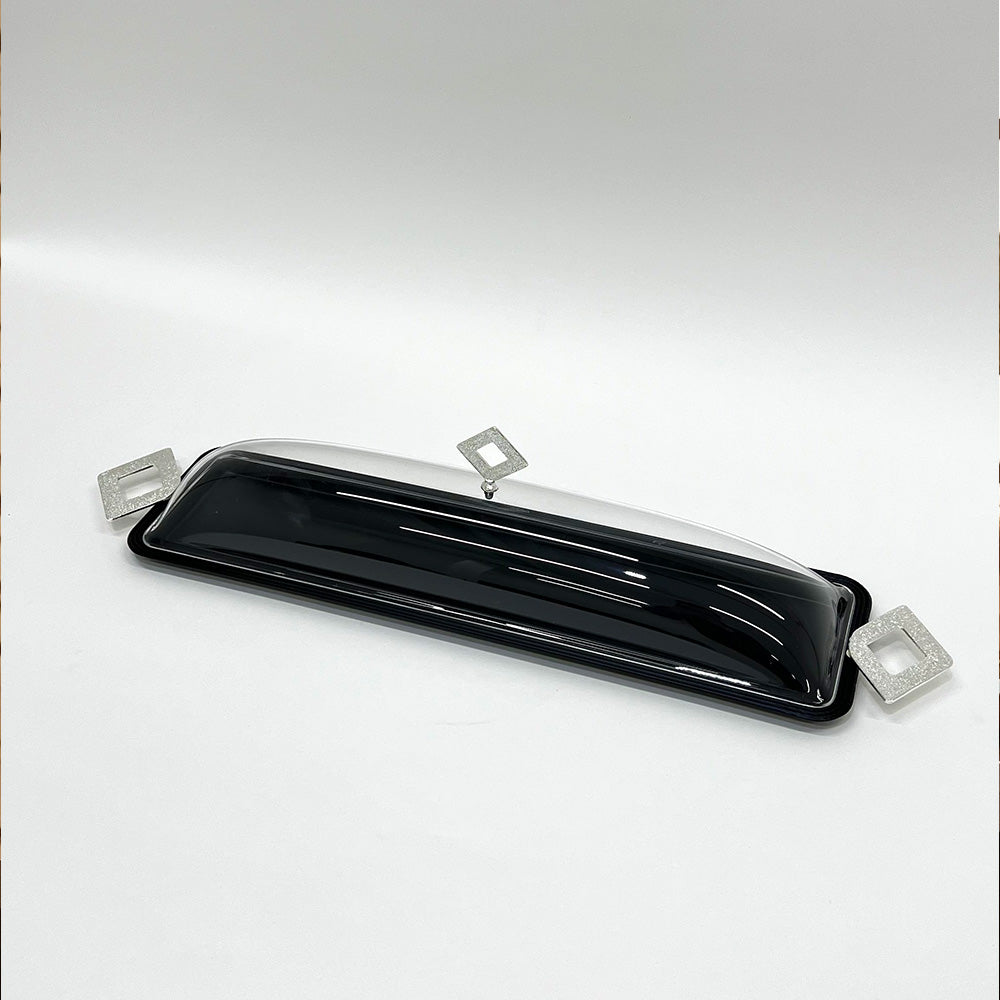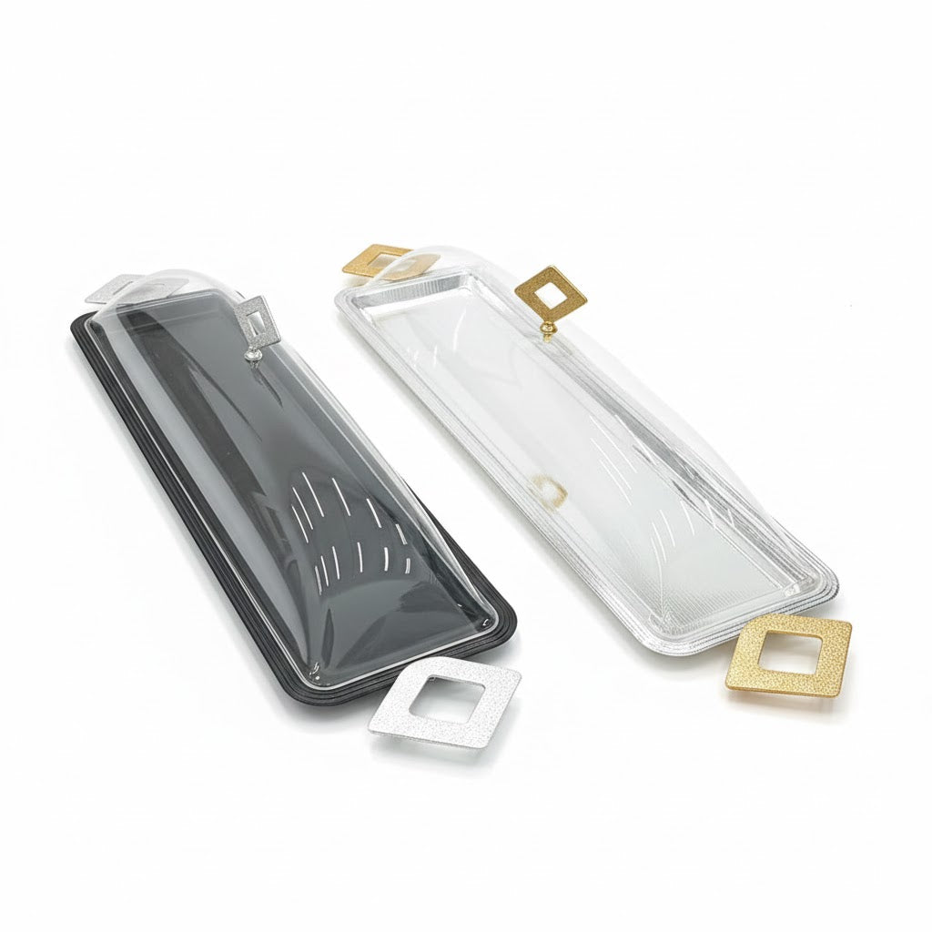 يتميز الوعاء بتصميمه الانسيابي الأنيق وشكله المستطيل العصري، مع غطاء شفاف يمنح رؤية واضحة للمحتوى ويحافظ على الحلويات طازجة ومحميّة. الإطار الخارجي مصمم بدقة ليعكس الذوق الفاخر، مع لمسات معدنية أنيقة في المقابض تضيف إحساسًا بالفخامة والتميز.
