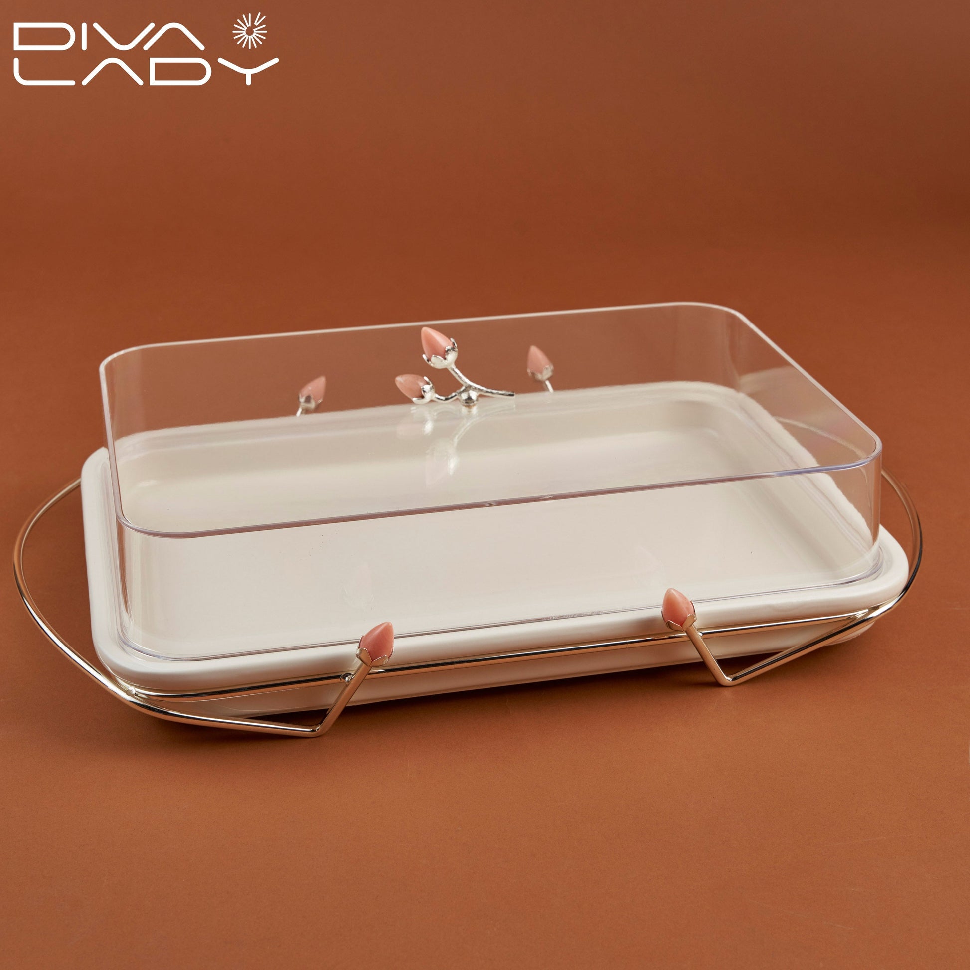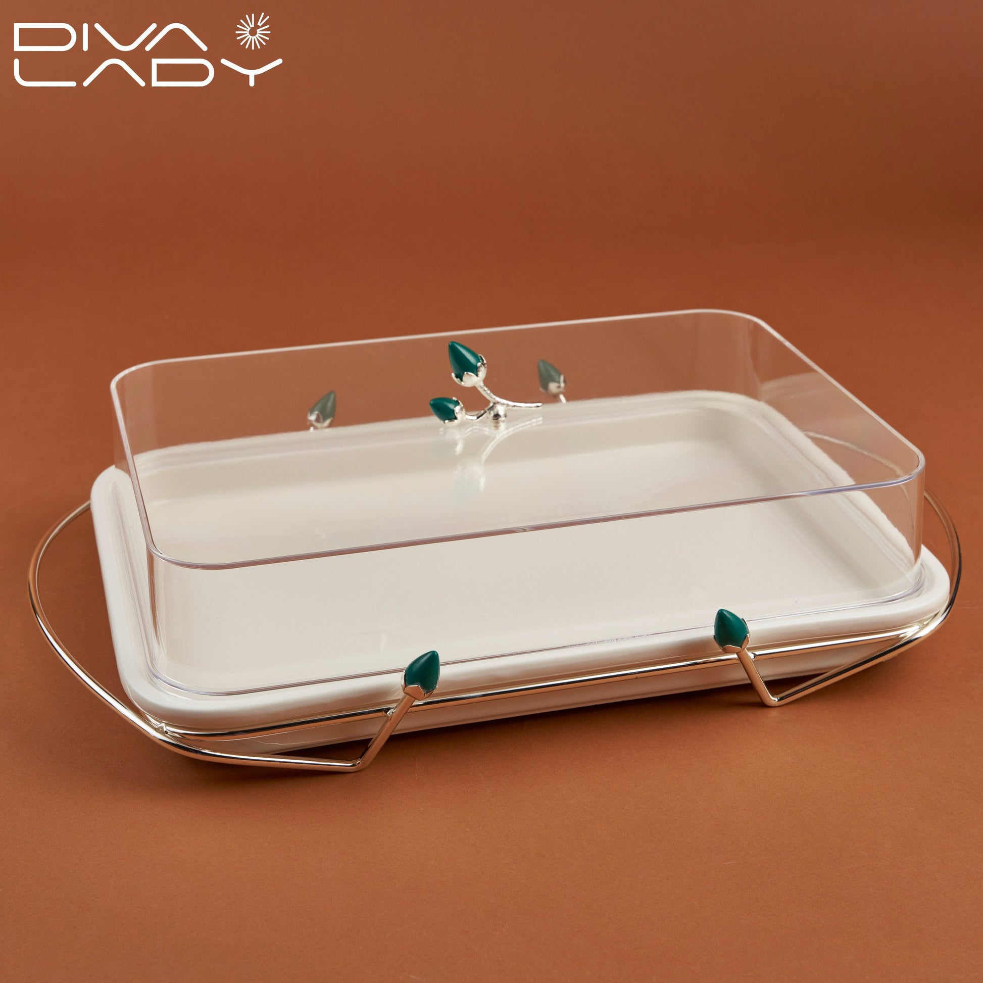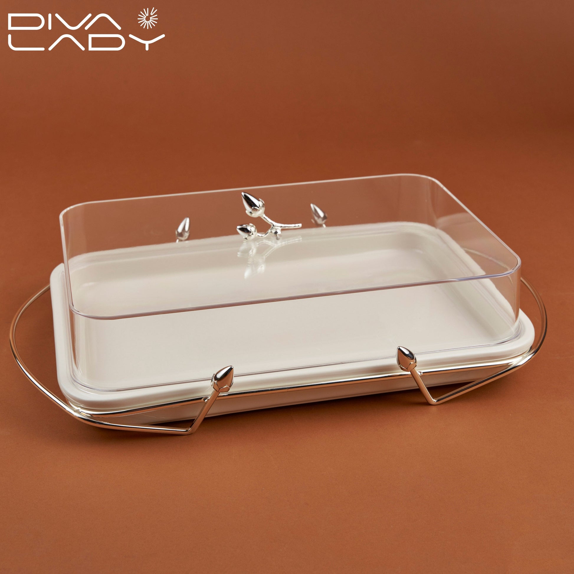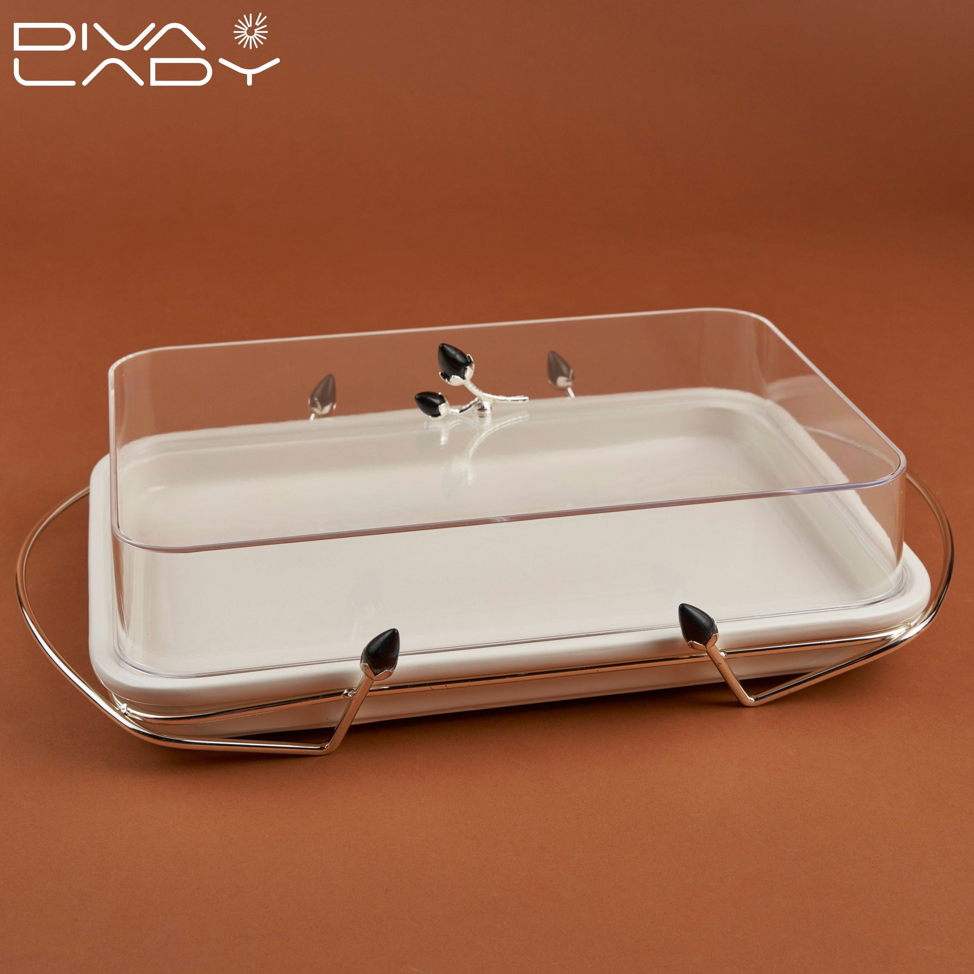يجعله متينًا وقابلًا للاستخدام اليومي أما الغطاء مصنوع من الاكرليك عالي الجودة مما يسمح برؤية محتويات الطبق بوضوح