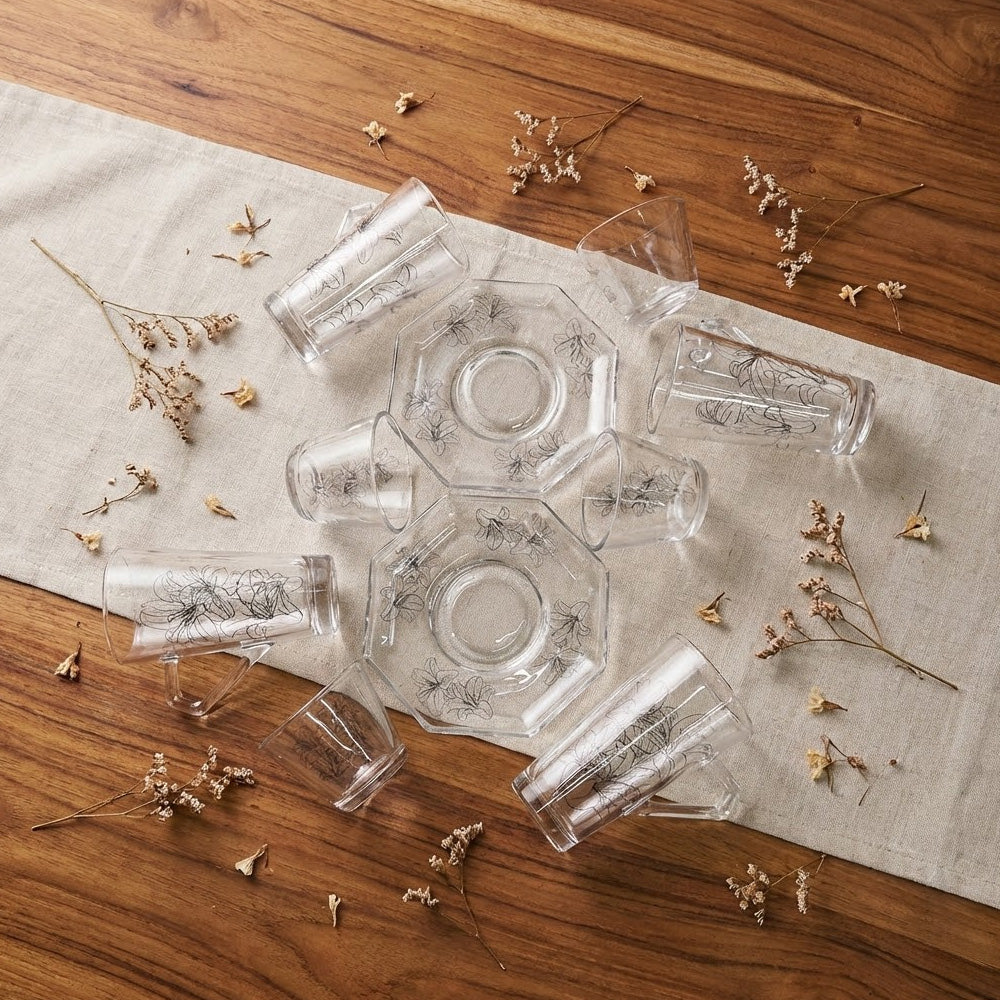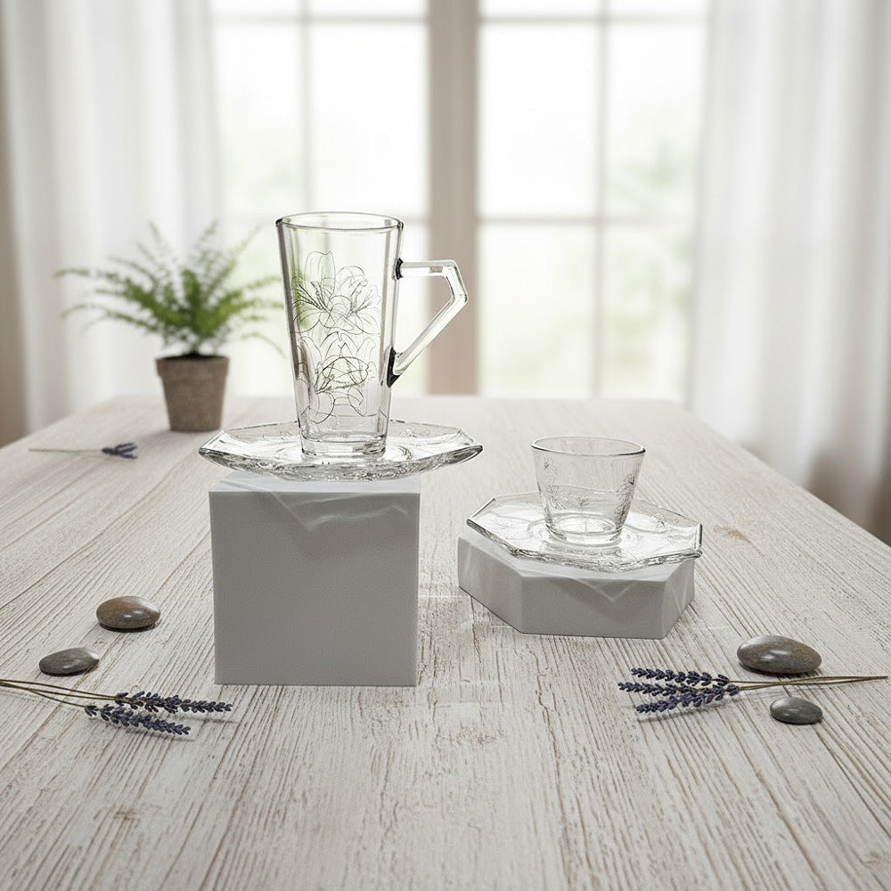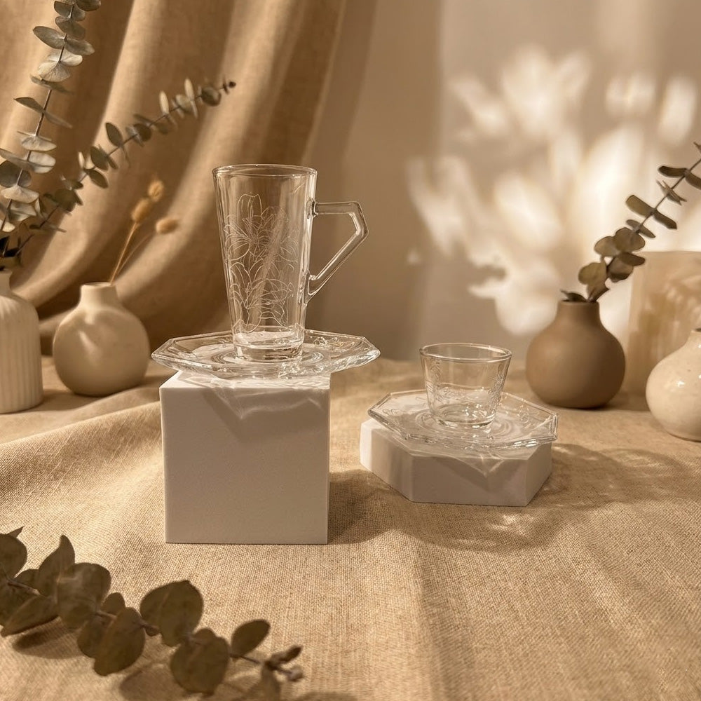 يتميز الطقم بزجاج شفاف عالي النقاء مع تصميم أنيق يناسب تقديم الشاي والقهوة العربية والتركية في الاستخدام اليومي والمناسبات الخاصة.