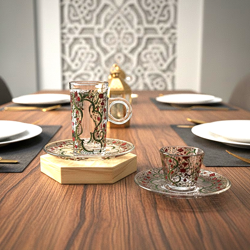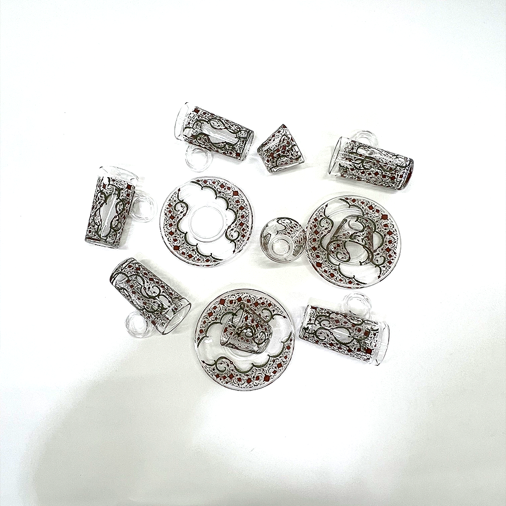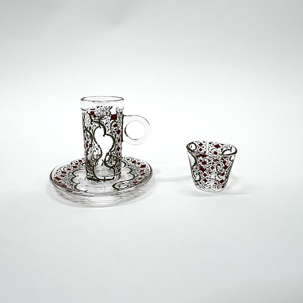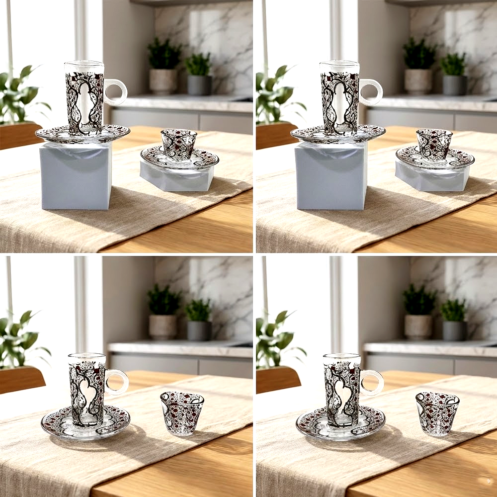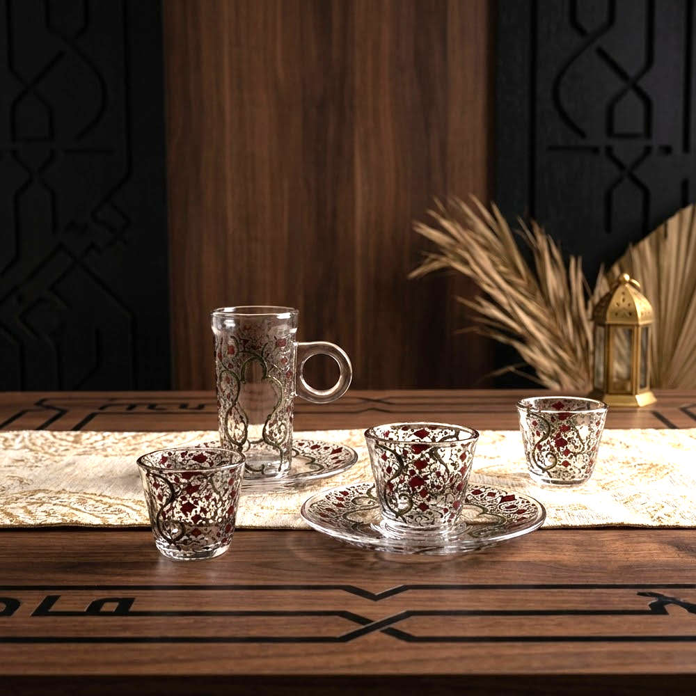 يتميز الطقم بزجاج شفاف عالي النقاء مع تصميم أنيق يناسب تقديم الشاي والقهوة العربية والتركية في الاستخدام اليومي والمناسبات الخاصة.