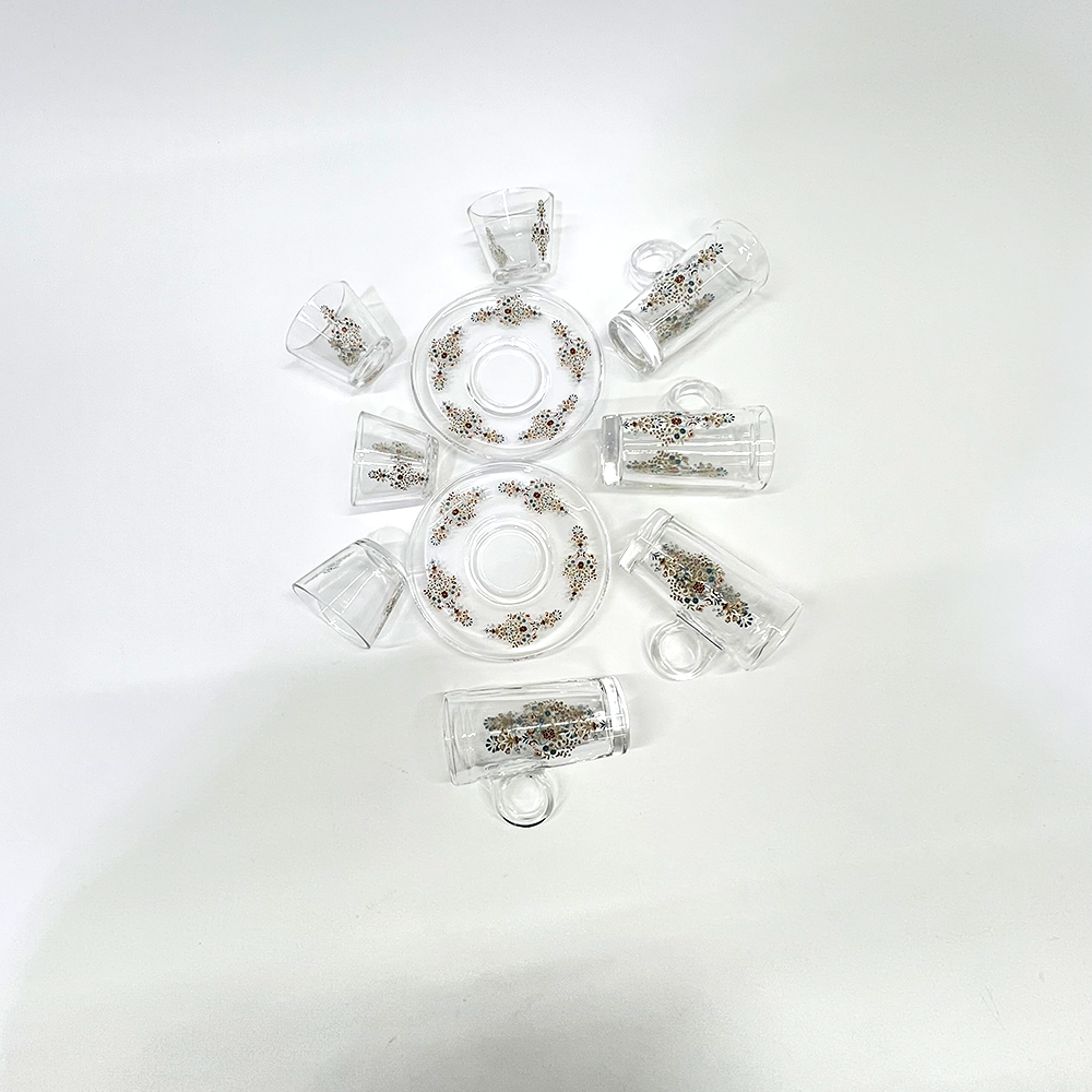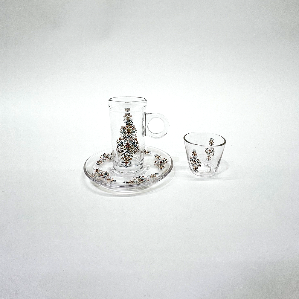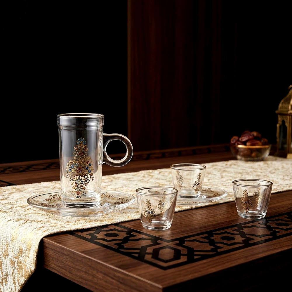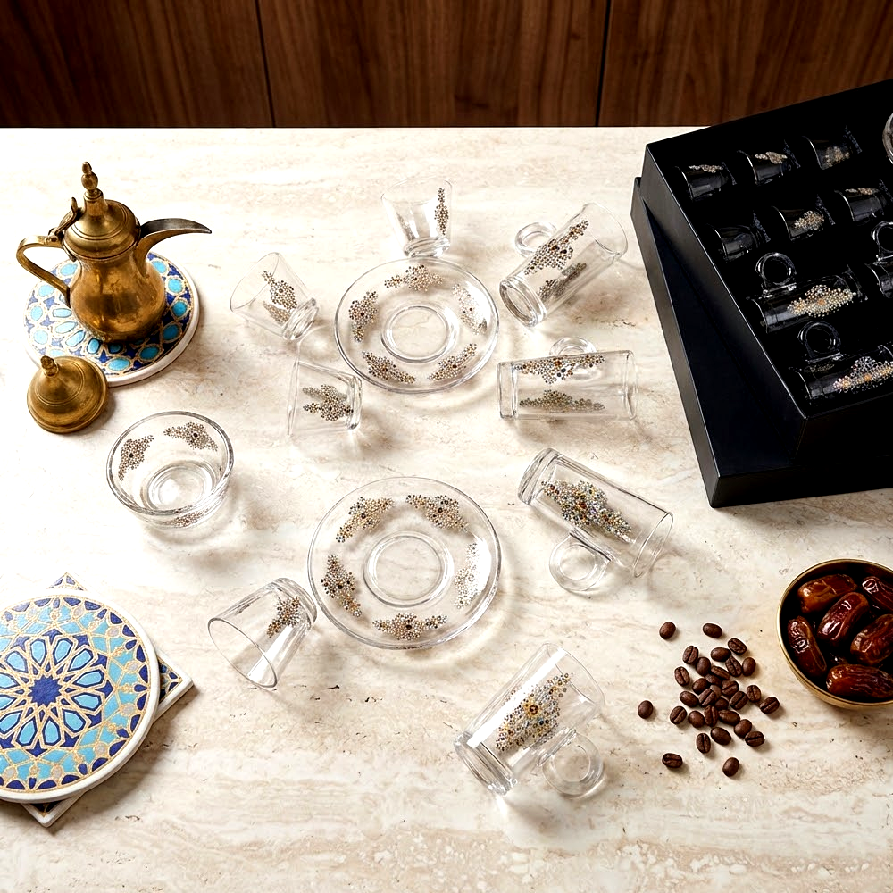 يتميز الطقم بزجاج شفاف عالي النقاء مع تصميم أنيق يناسب تقديم الشاي والقهوة العربية والتركية في الاستخدام اليومي والمناسبات الخاصة.