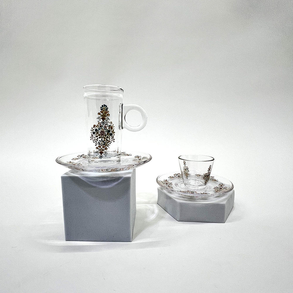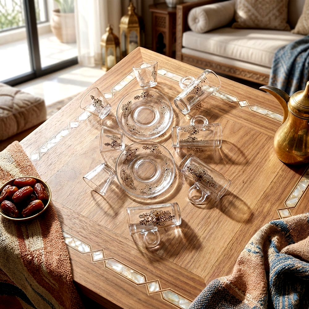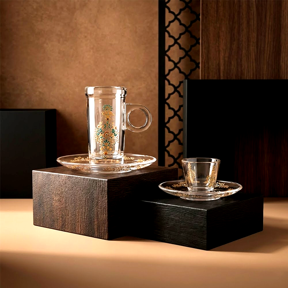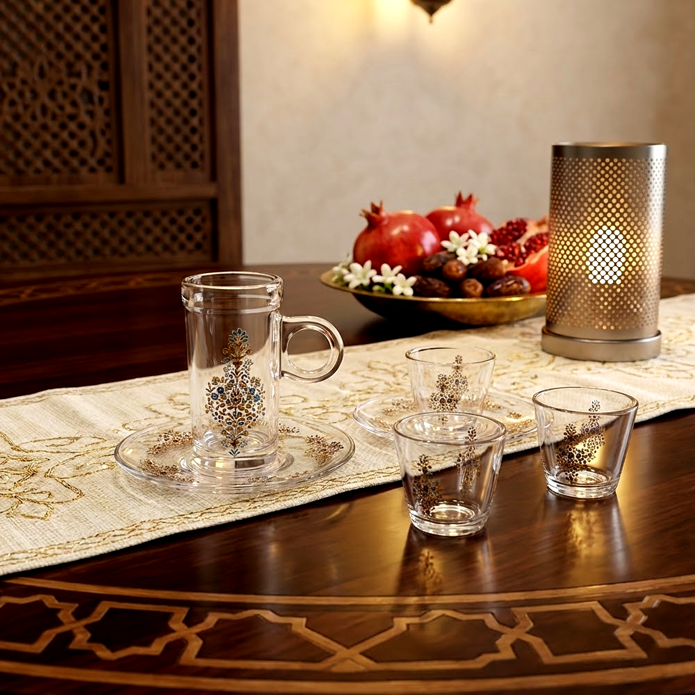 يتميز الطقم بزجاج شفاف عالي النقاء مع تصميم أنيق يناسب تقديم الشاي والقهوة العربية والتركية في الاستخدام اليومي والمناسبات الخاصة.
