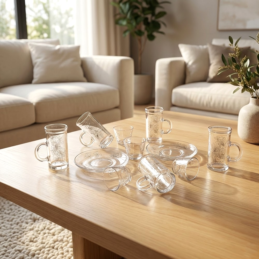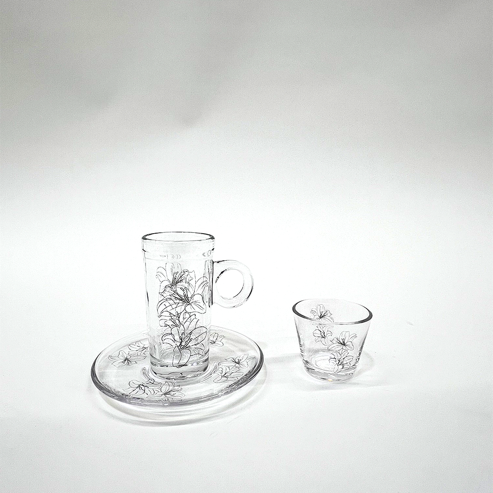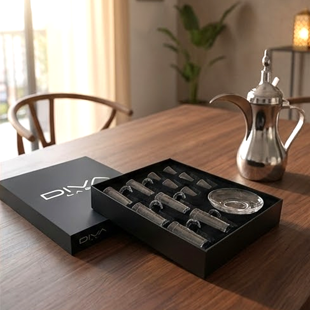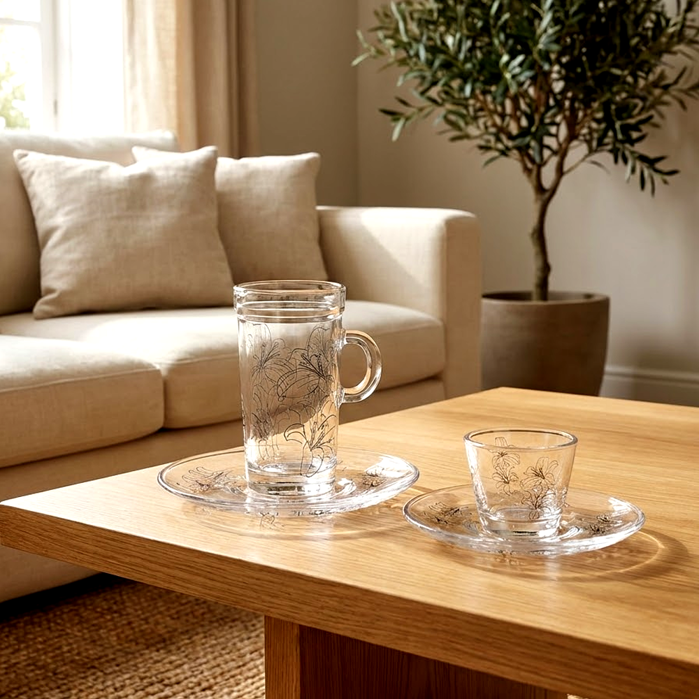يتميز الطقم بزجاج شفاف عالي النقاء مع تصميم أنيق يناسب تقديم الشاي والقهوة العربية والتركية في الاستخدام اليومي والمناسبات الخاصة.