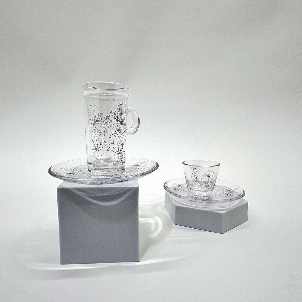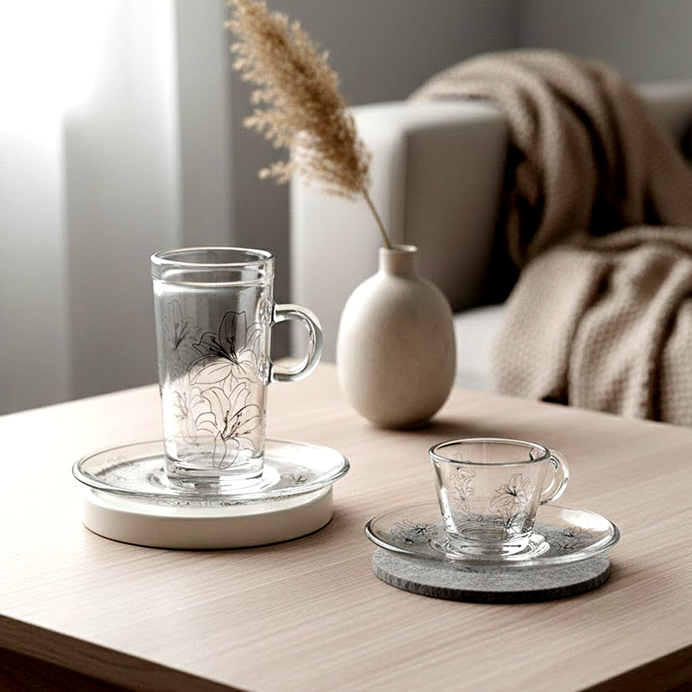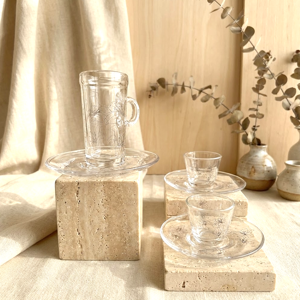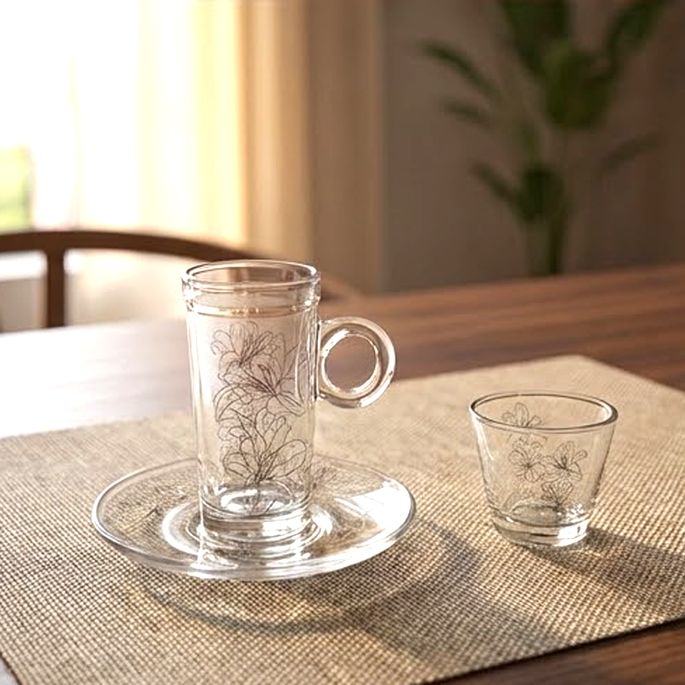 يتميز الطقم بزجاج شفاف عالي النقاء مع تصميم أنيق يناسب تقديم الشاي والقهوة العربية والتركية في الاستخدام اليومي والمناسبات الخاصة.