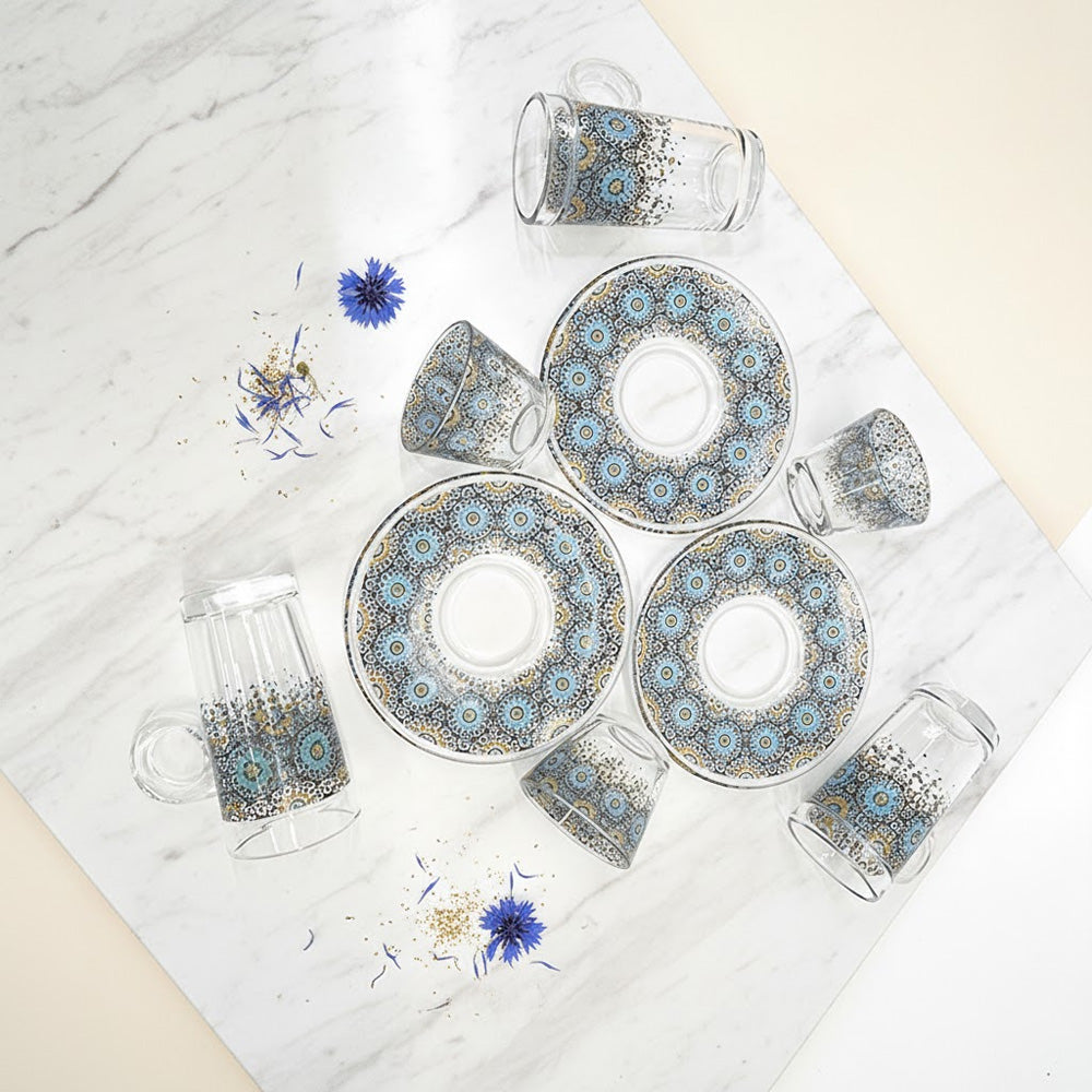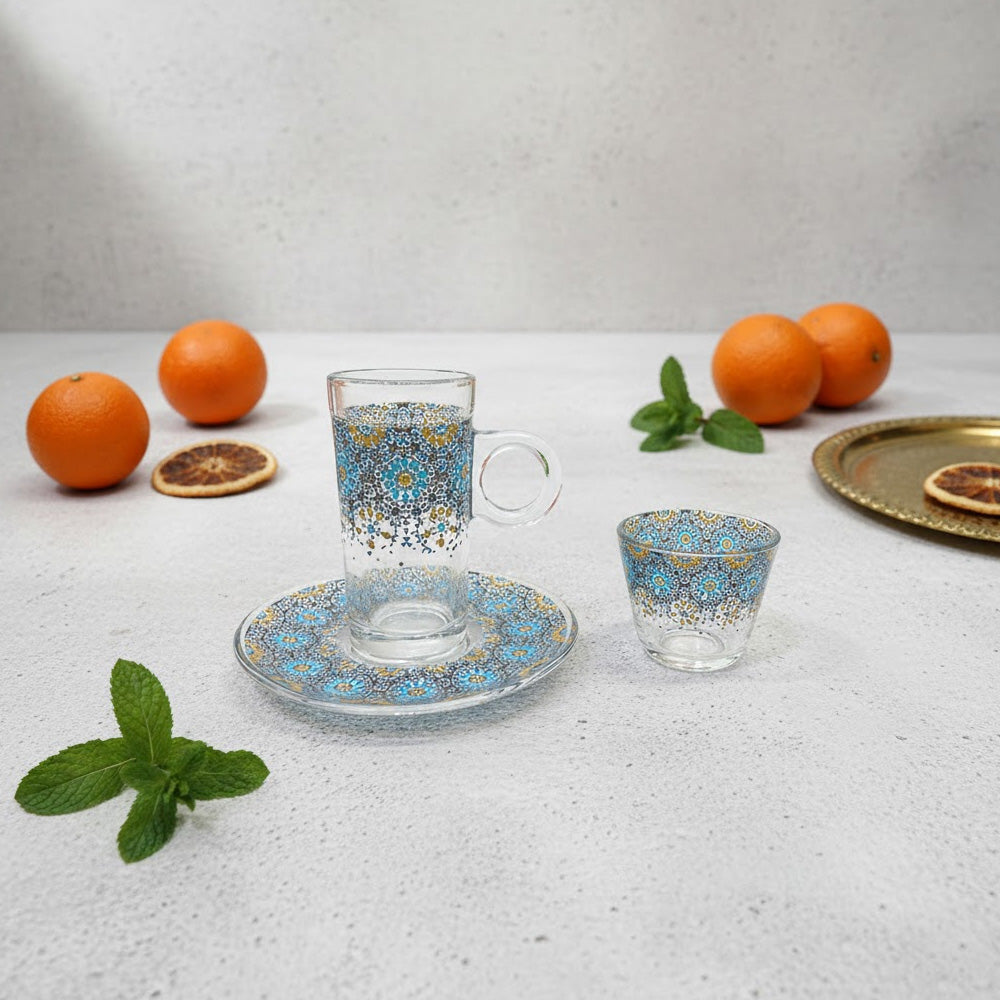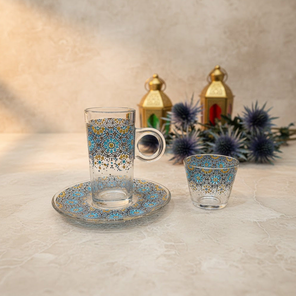 يتميز الطقم بزجاج شفاف عالي النقاء مع تصميم أنيق يناسب تقديم الشاي والقهوة العربية والتركية في الاستخدام اليومي والمناسبات الخاصة.