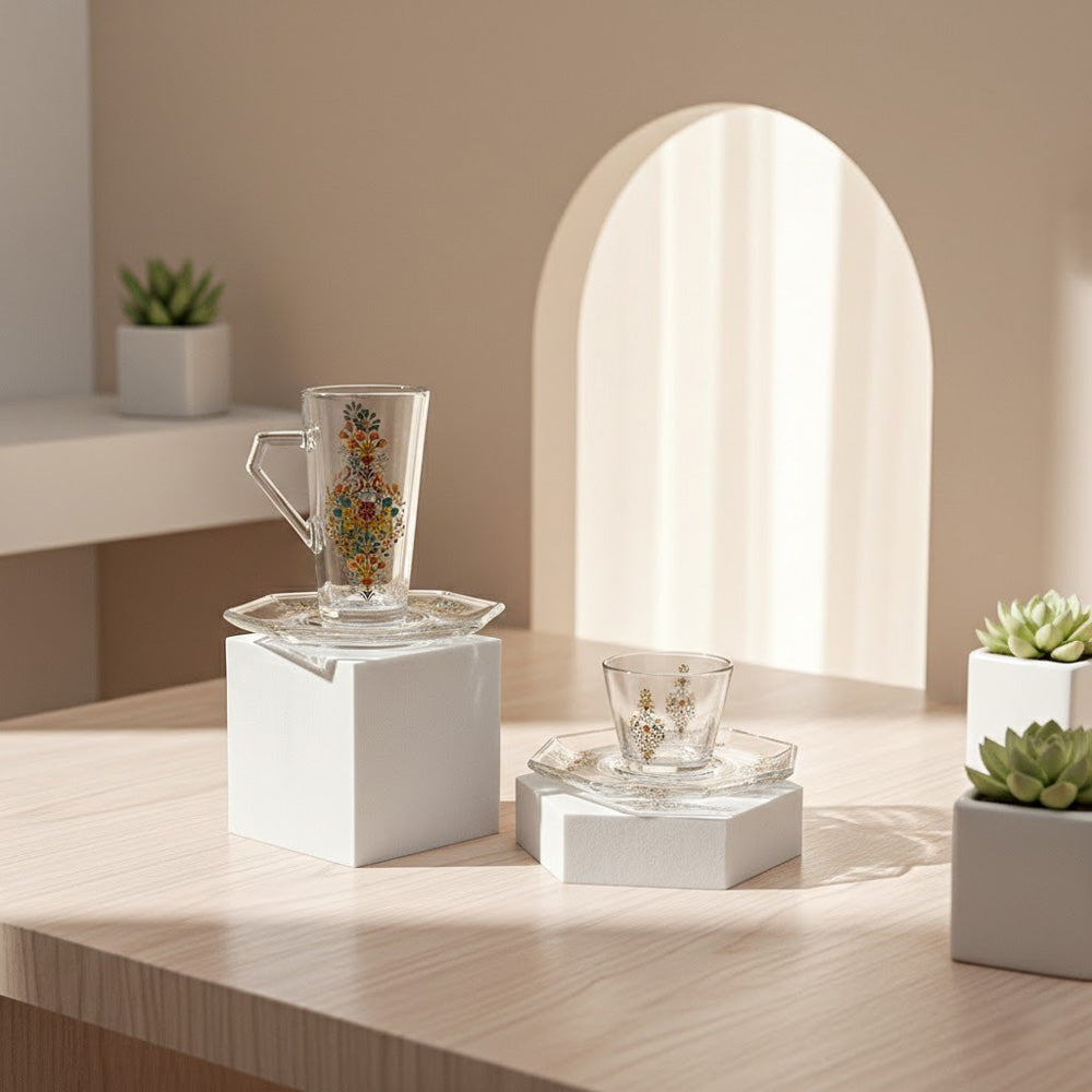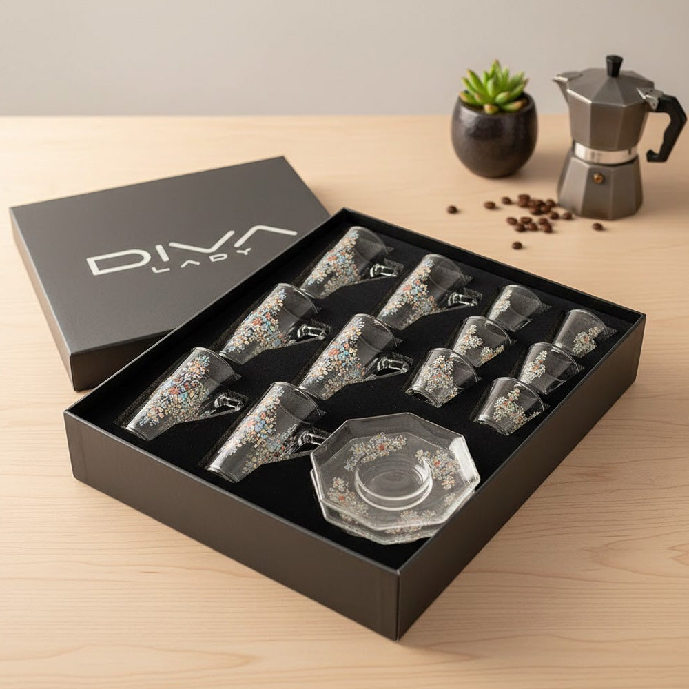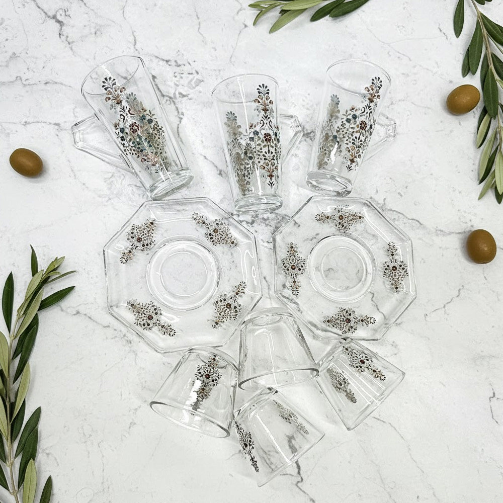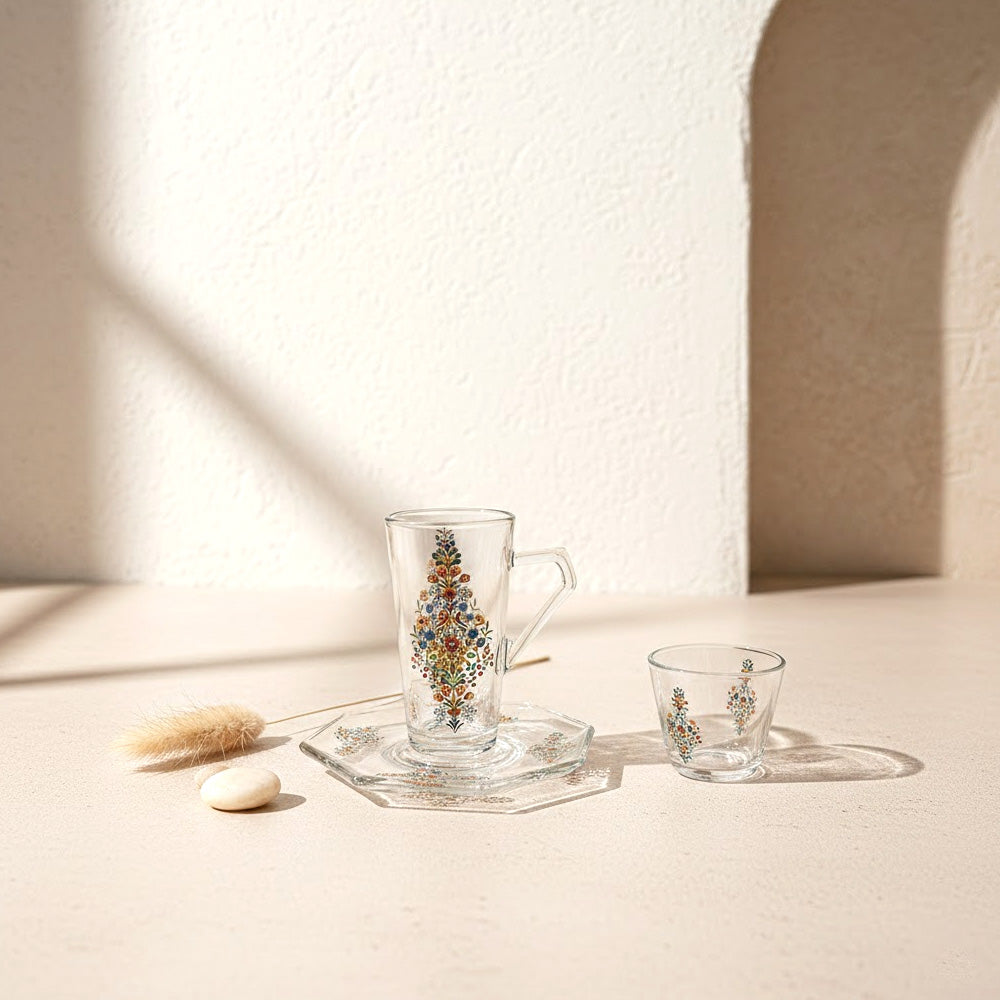 يتميز الطقم بزجاج شفاف عالي النقاء مع تصميم أنيق يناسب تقديم الشاي والقهوة العربية والتركية في الاستخدام اليومي والمناسبات الخاصة.