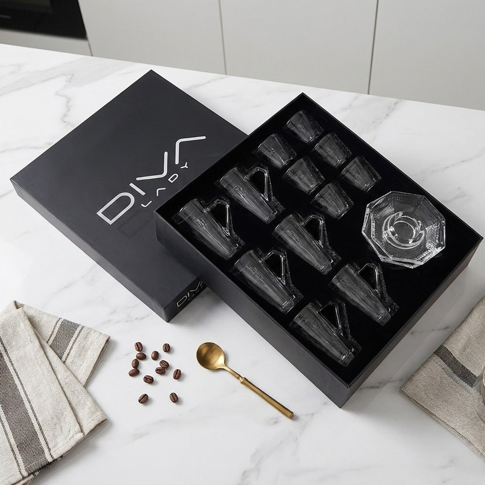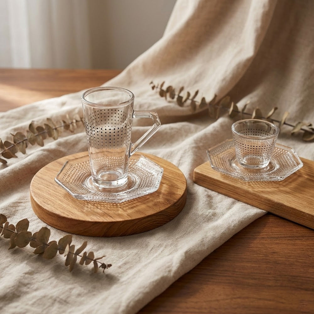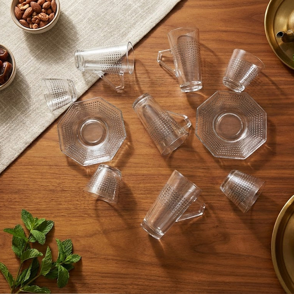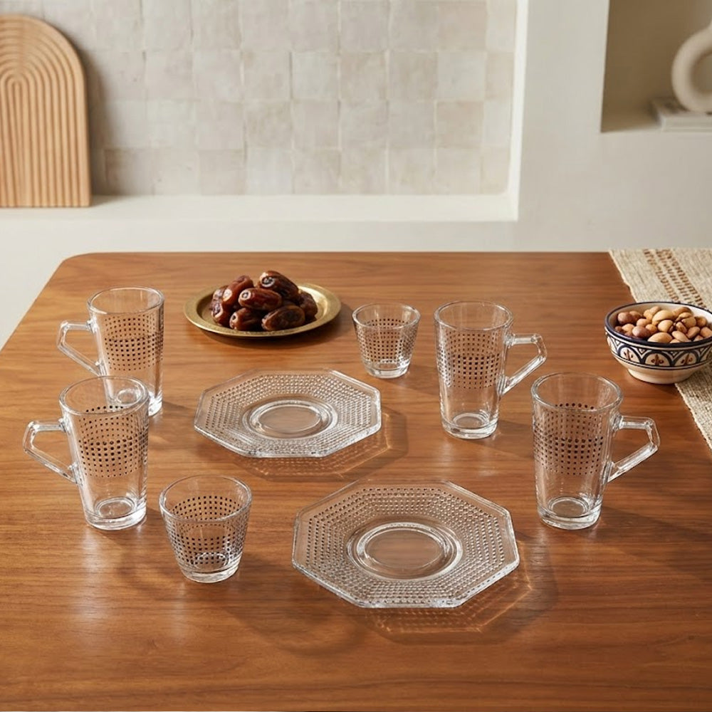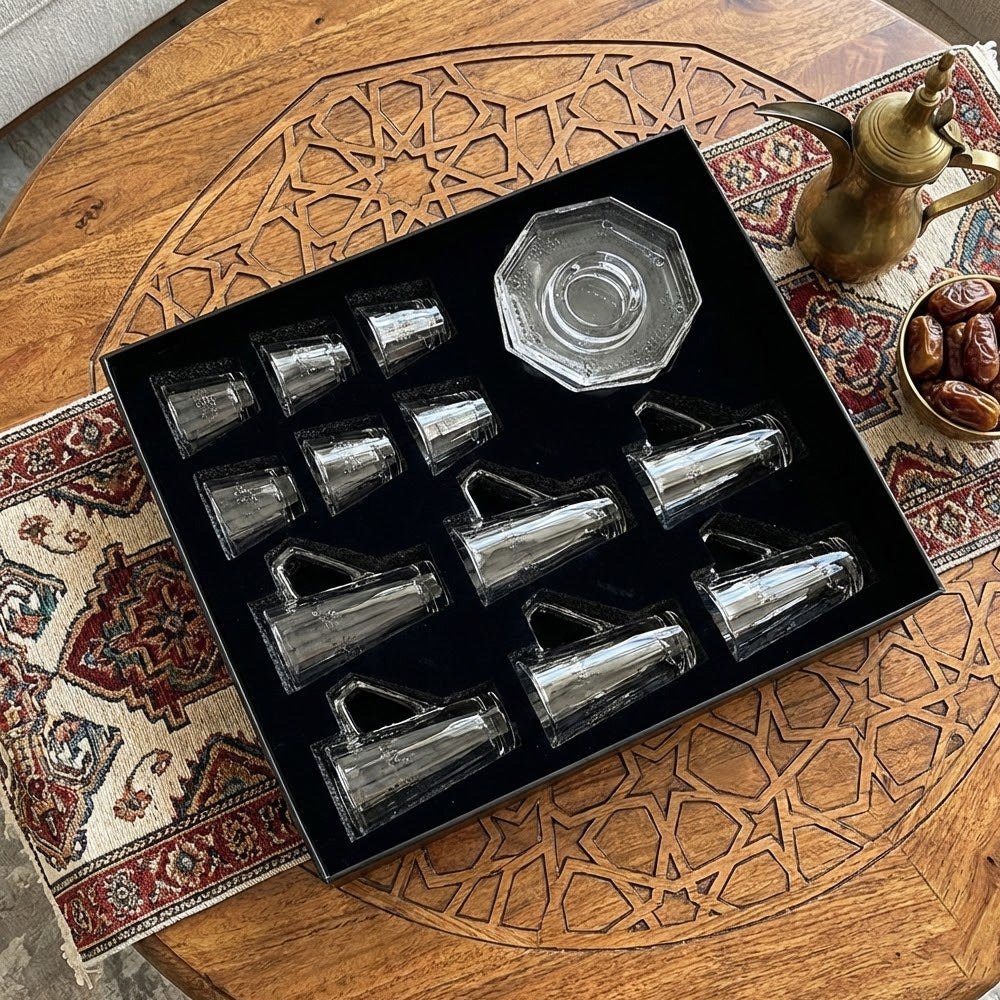 يتميز الطقم بزجاج شفاف عالي النقاء مع تصميم أنيق يناسب تقديم الشاي والقهوة العربية والتركية في الاستخدام اليومي والمناسبات الخاصة.