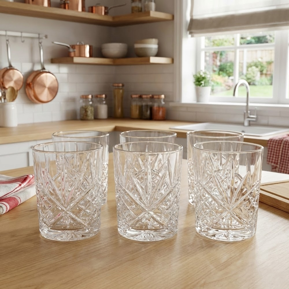 أضف لمسة فخامة إلى ضيافتك مع طقم كاسات زجاج بتصميم كريستالي أنيق يجمع بين الجمال والعملية. النقشة الهندسية تعكس الضوء بشكل رائع وتبرز ألوان المشروبات، مما يجعلها مثالية للتقديم اليومي والمناسبات الخاصة.