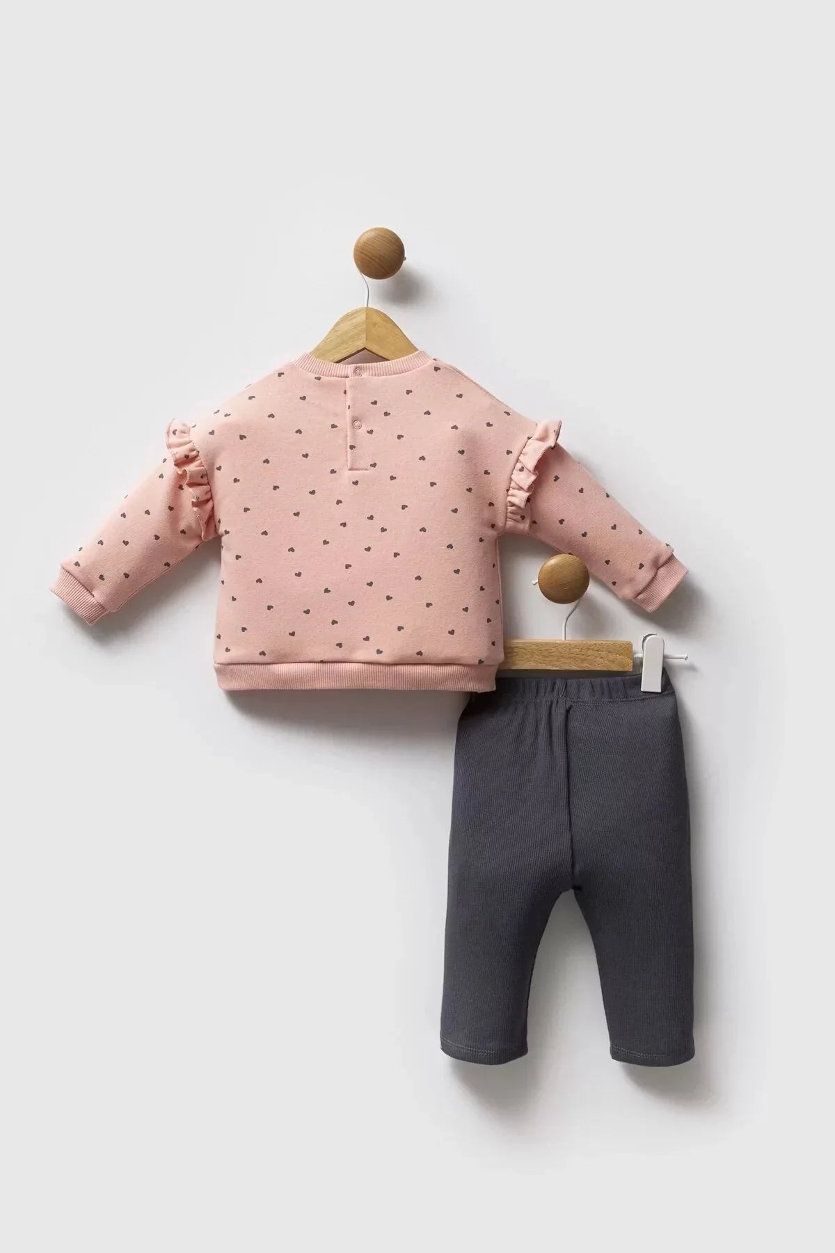 طقم أطفال ناعم ومريح جداً. بلوزة قطنية لطيفة بأكمام مكشكشة وسروال مريح. مثالي للاستخدام اليومي ولطيف على بشرة البيبي.