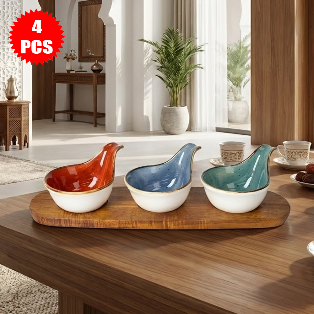 أضف لمسة فخامة وترتيب أنيق إلى مائدتك مع طقم التقديم الخشبي مع أوعية سيراميك ملونة، المصمم ليجمع بين الجمال العصري والعملية اليومية. يتكوّن الطقم من قاعدة خشب أكاسيا طبيعية مع 3 أوعية سيراميك بتصميم مميز يشبه الورقة، بألوان جذابة (أحمر، أزرق، أخضر) تضيف حيوية للمائدة.