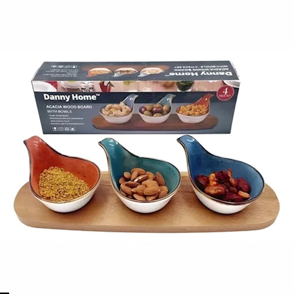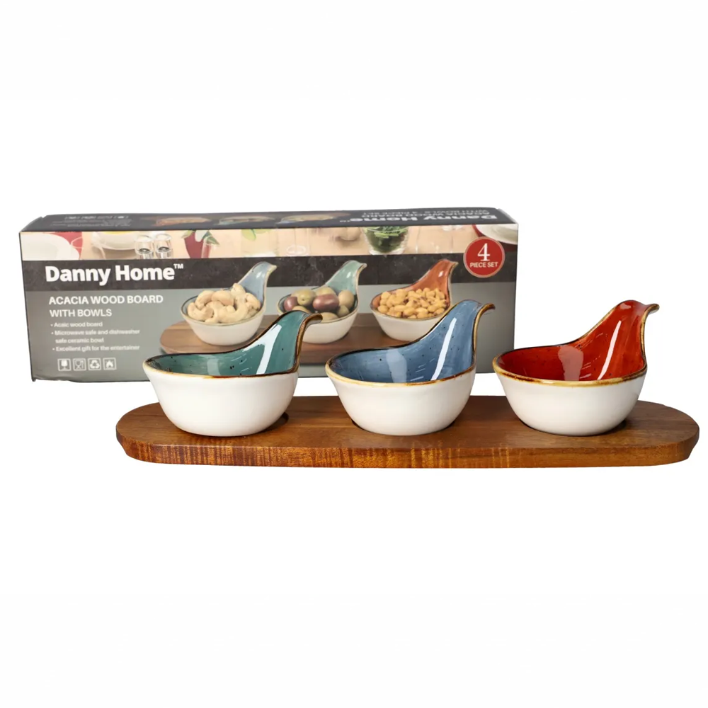 طقم تقديم خشب أكاسيا مع أوعية سيراميك ملونة – 4 قطع بتصميم أنيق وعصري