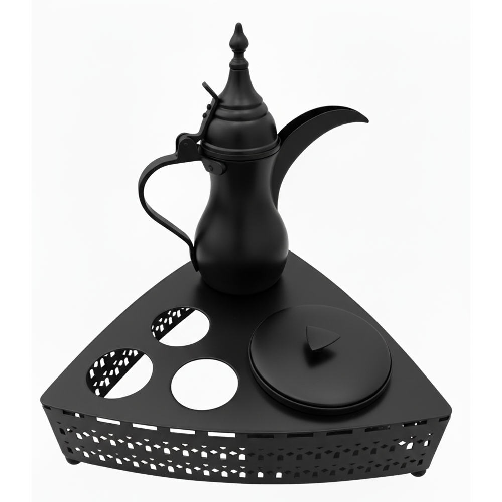 استمتع بتقديم القهوة العربية مع طقم الضيافة الفاخر الذي يتكون من صينية معدنية مثلثية بتصميم عصري أنيق، وعاء تمر مع غطاء محكم للحفاظ على الطعم الطازج، بالإضافة إلى دلة قهوة معدنية تقليدية.
