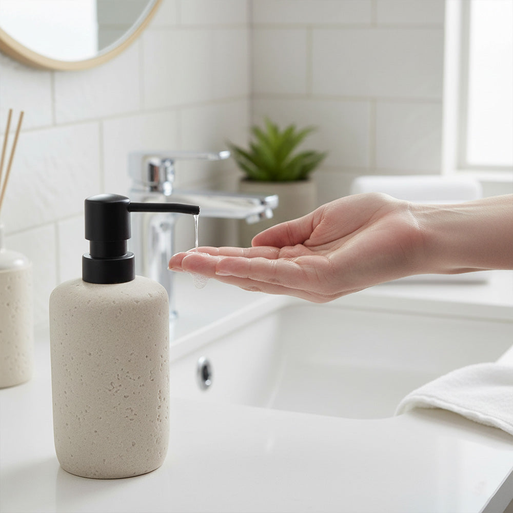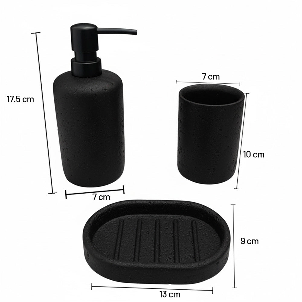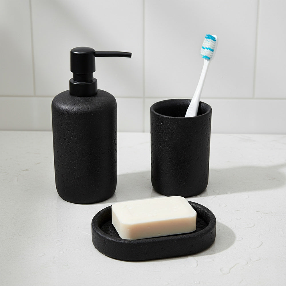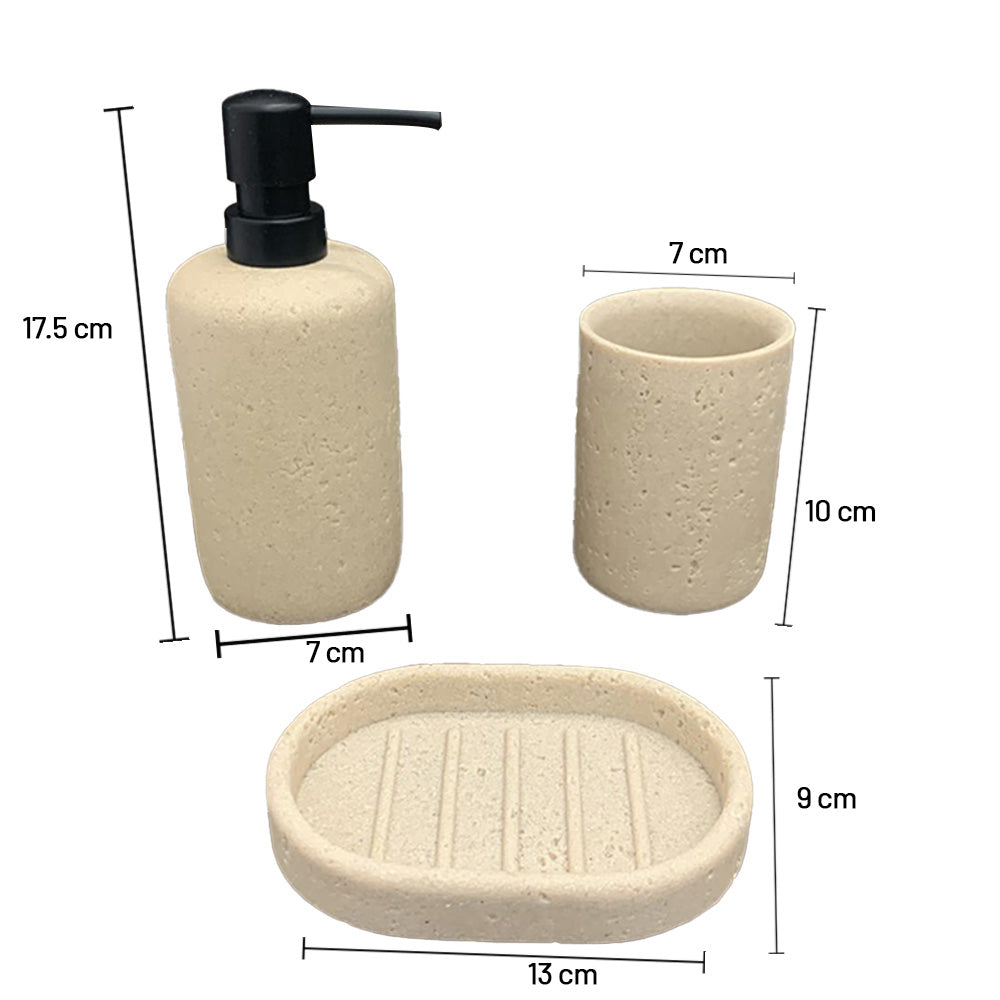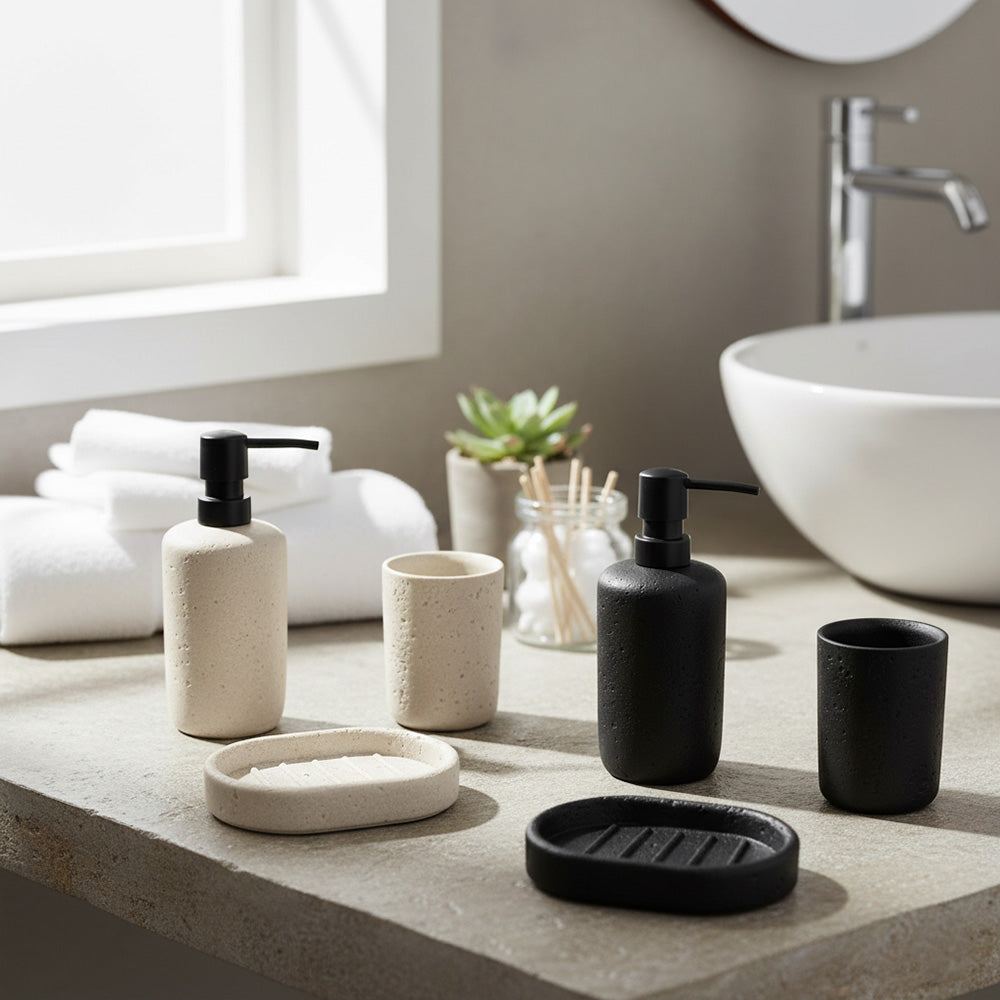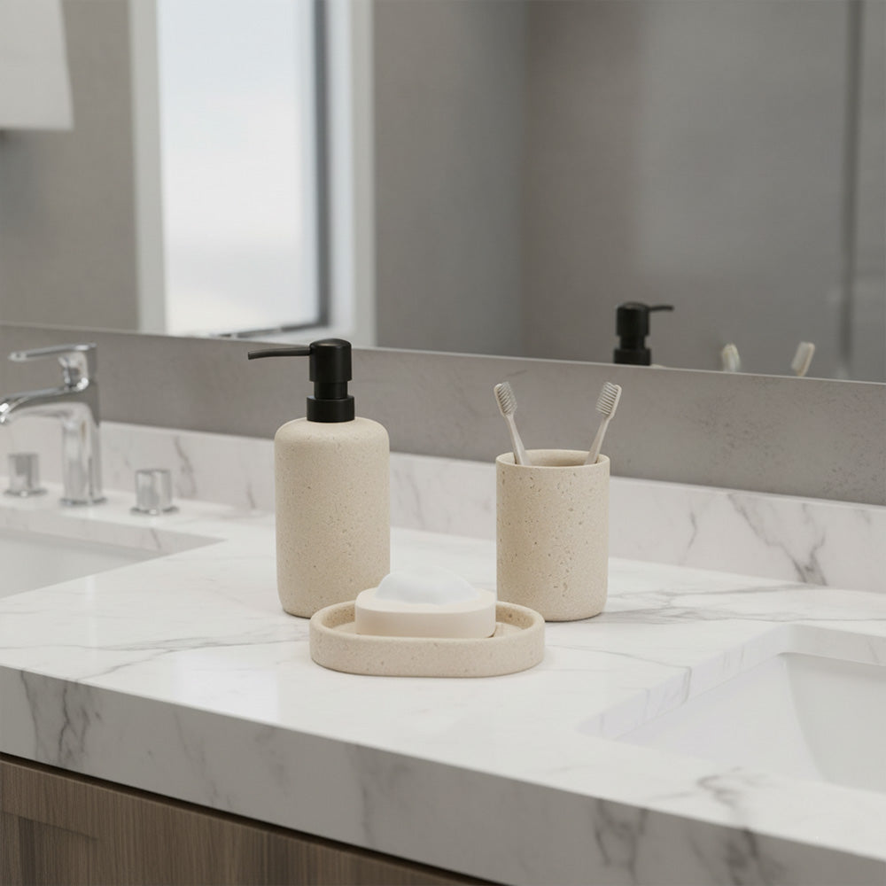 أضف لمسةً من الأناقة العصرية إلى حمامك مع طقم الإكسسوارات الرائع هذا، والمكون من ثلاث قطع، والمُصمم بلمسة حجرية. صُممت كل قطعة بلمسة نهائية طبيعية تشبه الحصى، لتضفي مظهرًا أنيقًا وبسيطًا مع توفير وظائف يومية عملية. يتضمن الطقم موزع صابون سائل، وكوبًا متعدد الاستخدامات، وطبق صابون - مثالي لتنظيم سطح طاولتك بأناقة.