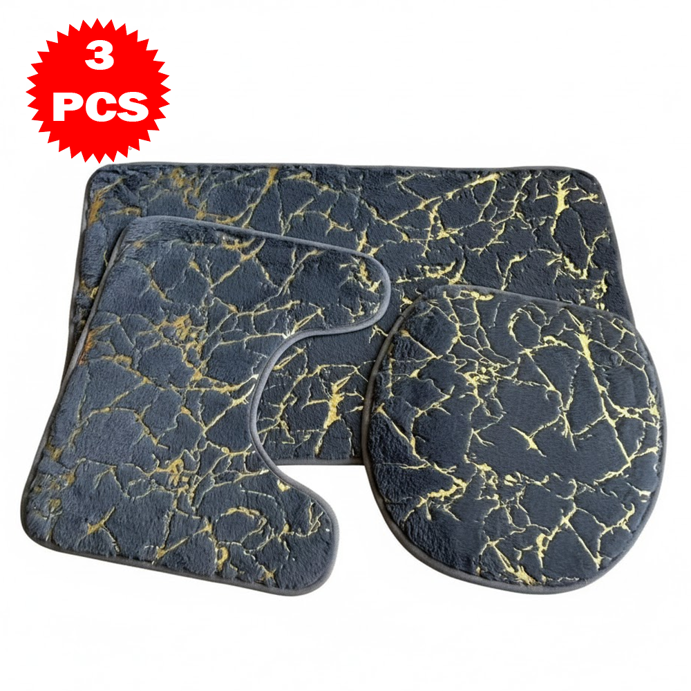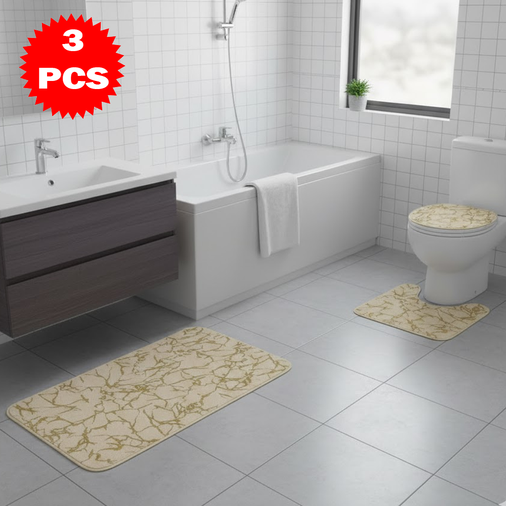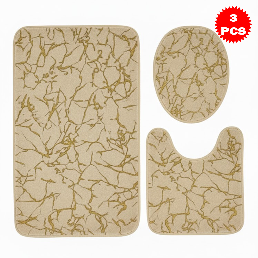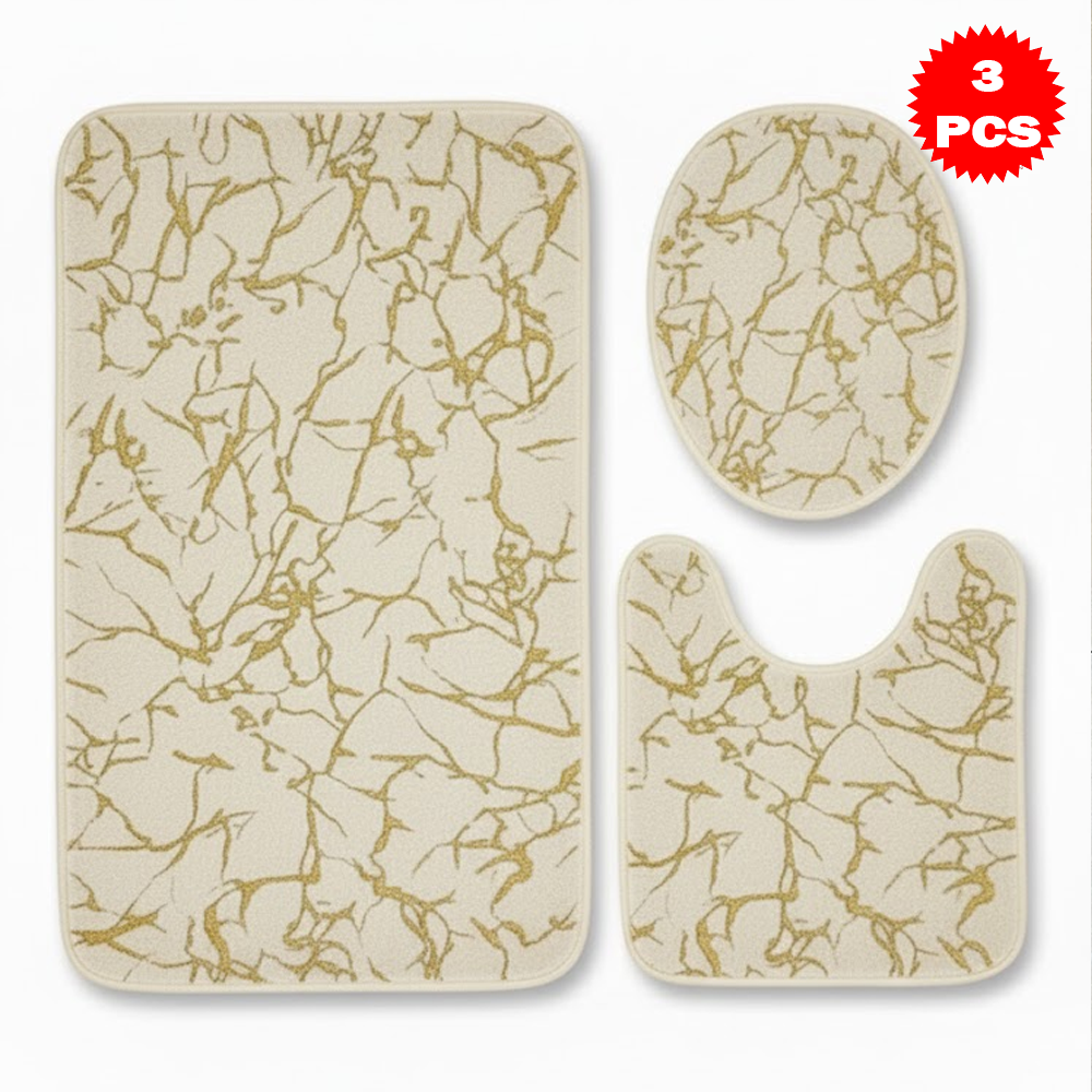 طقم سجاد حمّام فاخر 3 قطع بنقشة الرخام – مضاد للانزلاق | ناعم، ممتص للماء، وأنيق بلمسة فاخرة