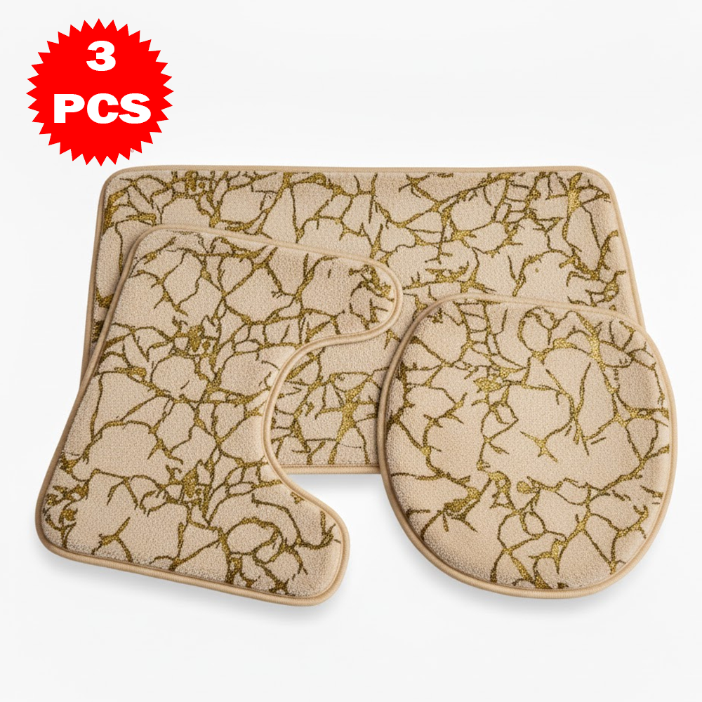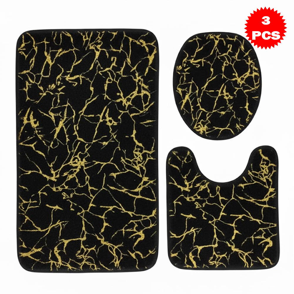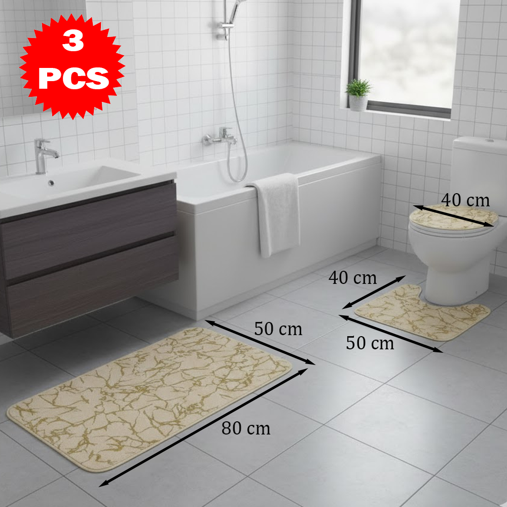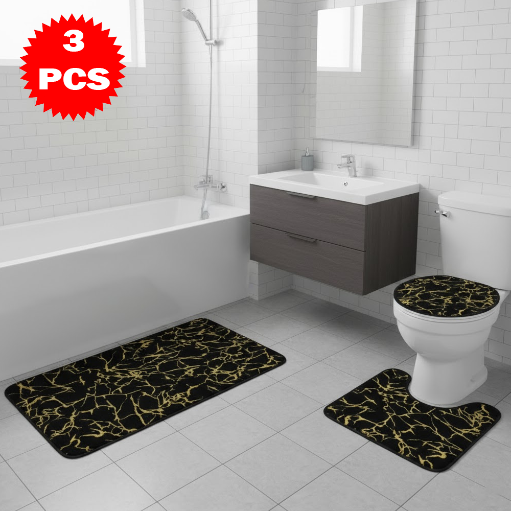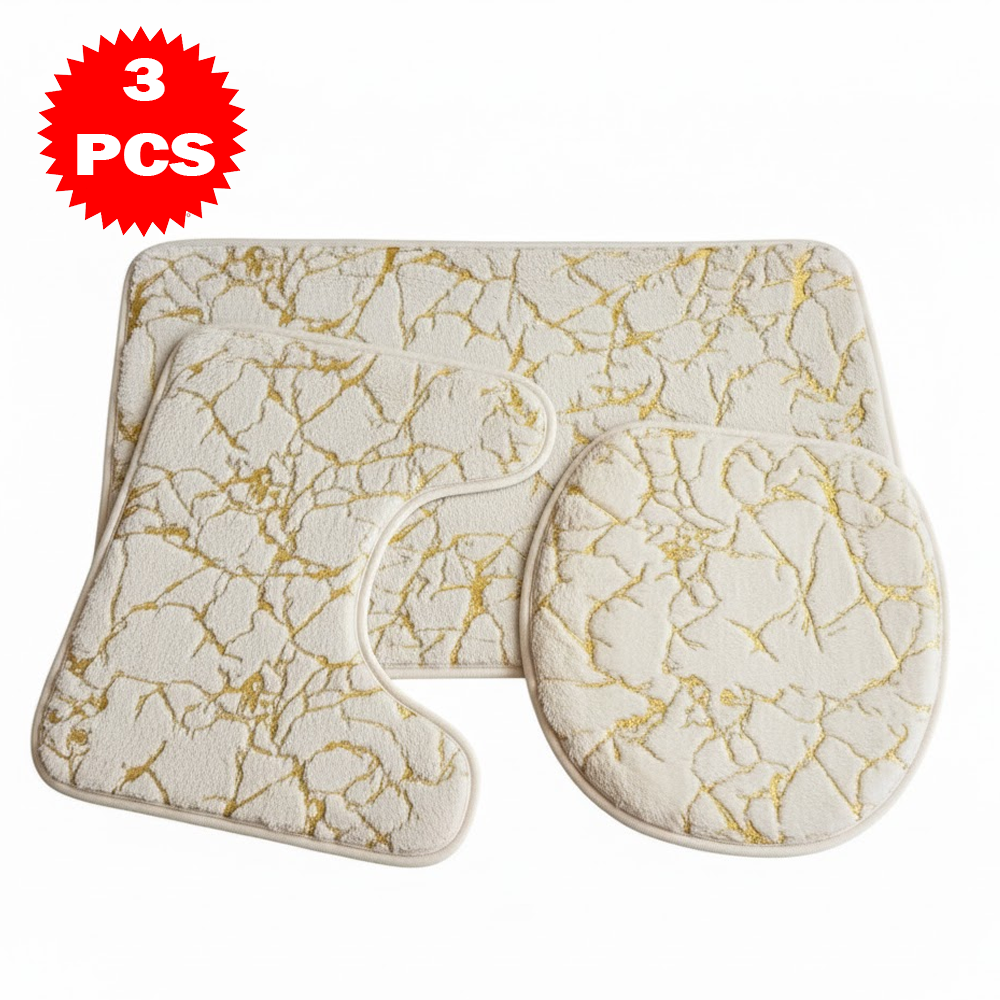 طقم سجاد حمّام فاخر 3 قطع بنقشة الرخام – مضاد للانزلاق | ناعم، ممتص للماء، وأنيق بلمسة فاخرة