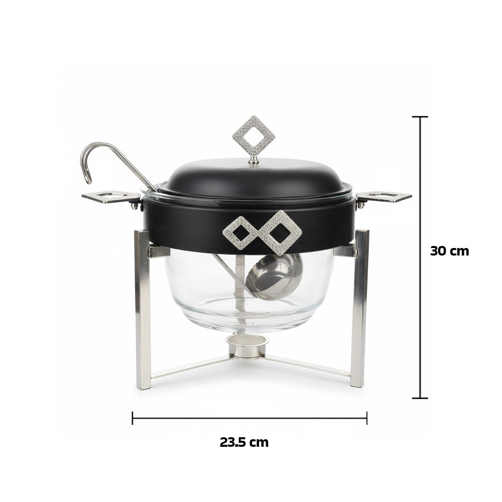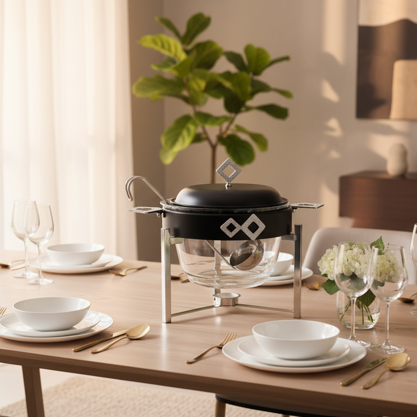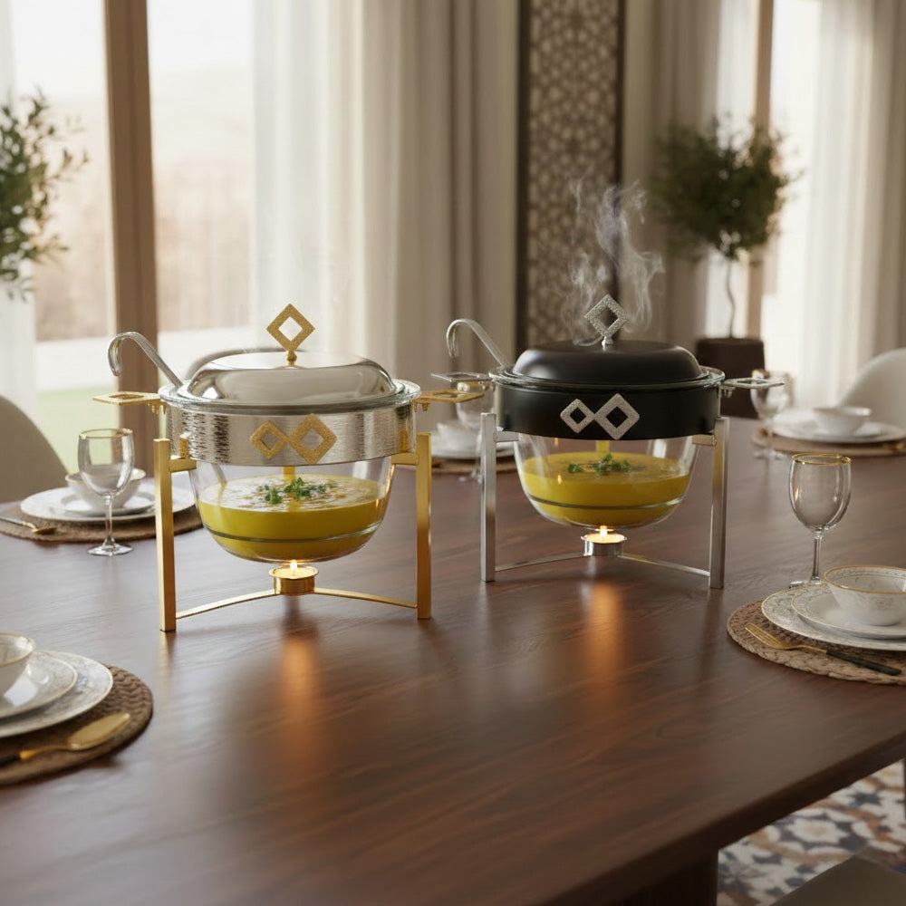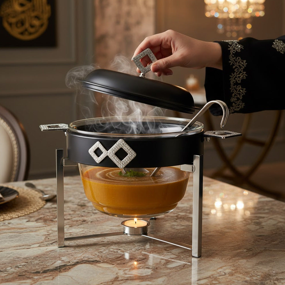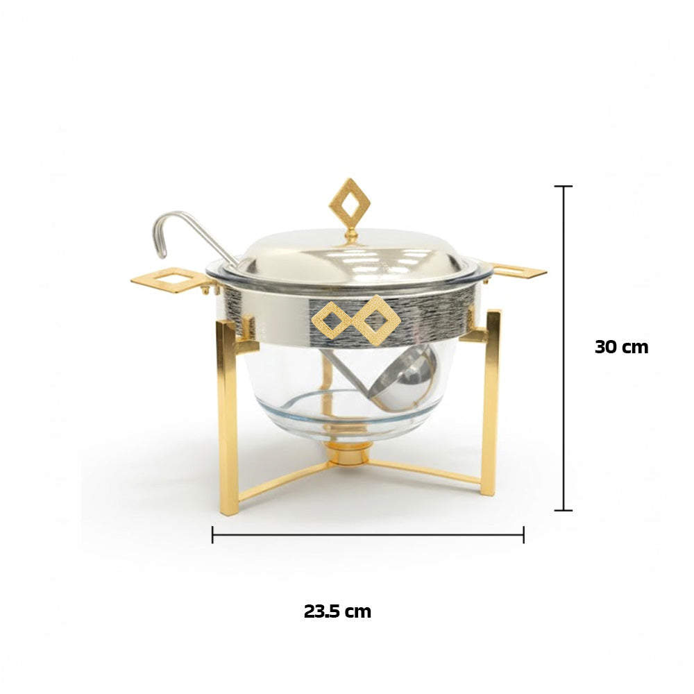 يوفر الحامل المعدني المتين دعماً ثابتاً، بينما يضمن الغطاء والمغرفة المتناسقان سهولة التقديم. تضيف اللمسات الهندسية الزخرفية لمسة عصرية راقية، مما يجعله مثالياً للعشاءات الرسمية والبوفيهات والمناسبات الخاصة.