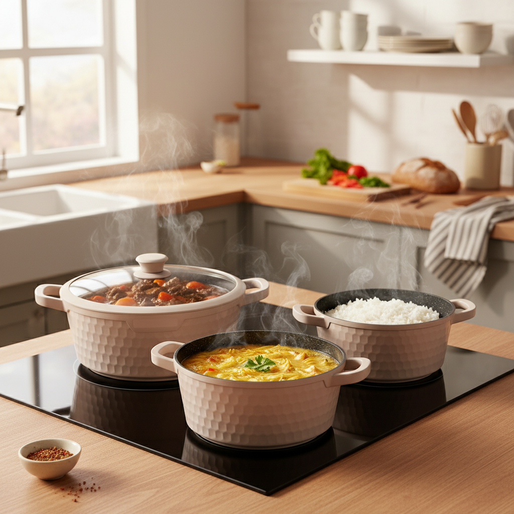 يحتوي كل قدر على غطاء زجاجي مقاوم للحرارة مع فتحة تهوية للبخار، مما يسمح لك بمراقبة عملية الطهي دون فقدان الرطوبة. توفر المقابض الجانبية المريحة قبضة محكمة ومريحة، مما يجعل هذا الطقم مثاليًا لليخنات والأرز والمعكرونة والشوربات والقلي السريع والطهي البطيء، وغيرها الكثير.
