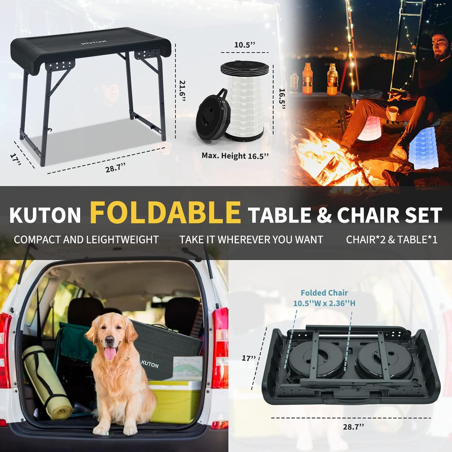 طقم طاولة وكراسي قابلة للطي مقاس 28 بوصة، هيكل محمول وقوي، خفيف الوزن، 11.5 رطل، عبوتان من كرسي قابل للطي مزود بإضاءة LED للتخييم في الهواء الطلق والنزهات والمشي لمسافات طويلة والتجمعات الداخلية، أسود