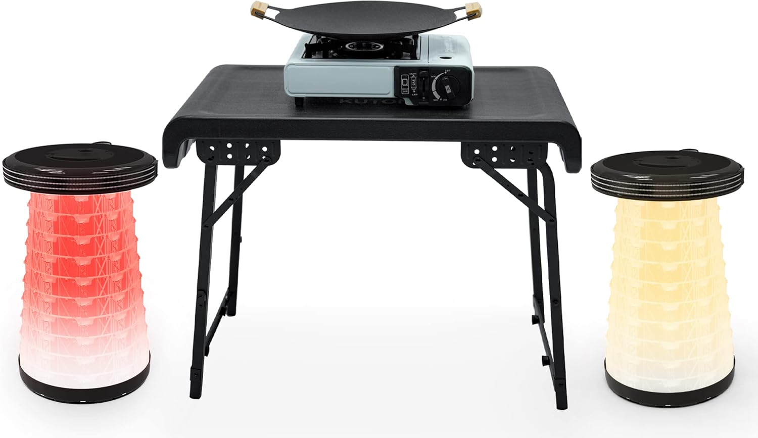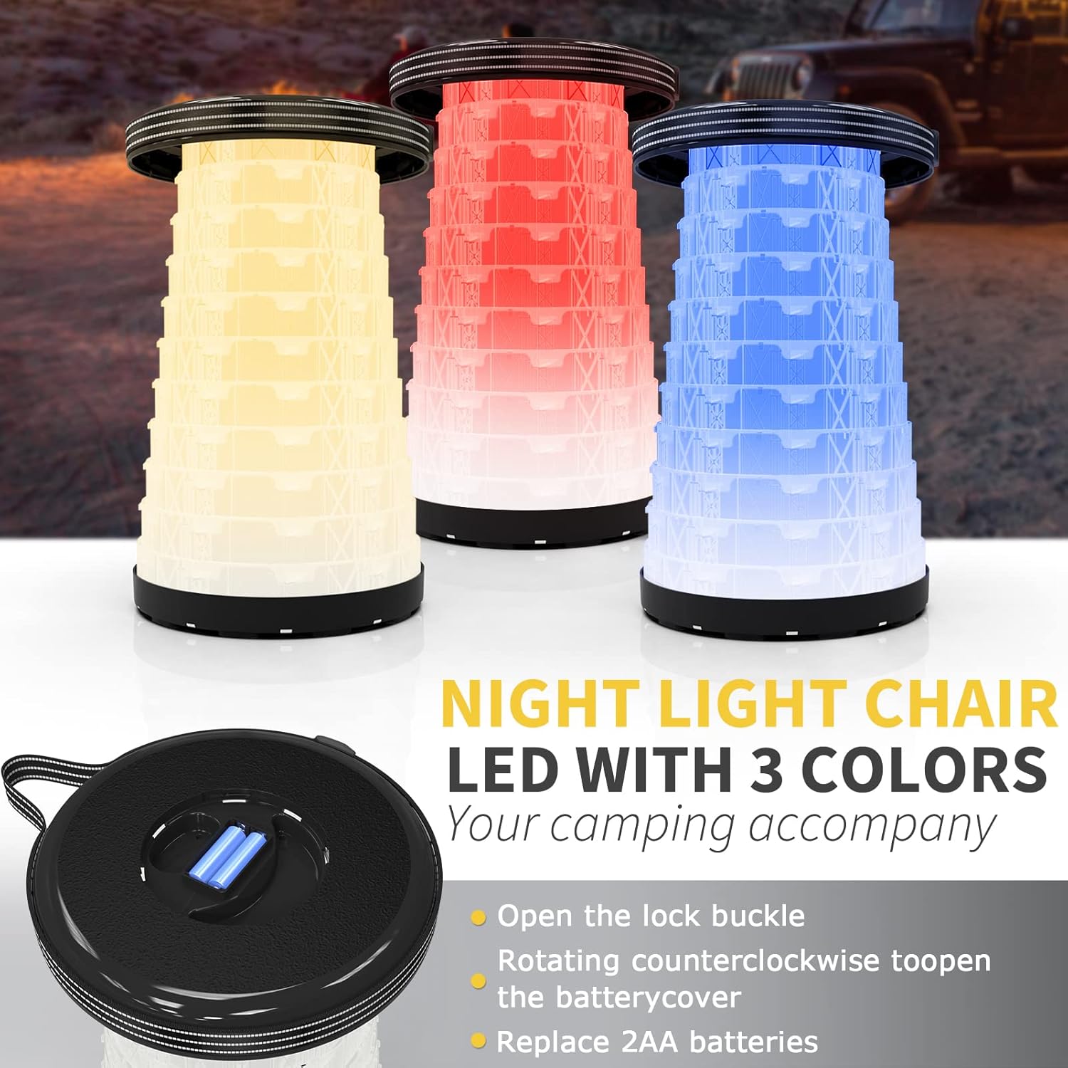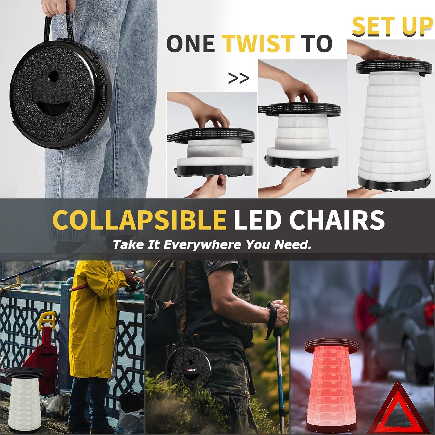 سهل الإعداد بدون أدوات - يستغرق الأمر بضع دقائق فقط لفضح الطاولة لخارج منزلك أو حدثك. افتح المزلاج وافتح جانب هذه الطاولة أثناء فتح حقيبتك. اسحب كل ساق للخارج واضغط على مزلاج الأمان لجعله ثابتًا قبل الاستخدام. ثم أخرج المقعد القابل للطي LED واضبطه على ارتفاعك. يمكنك استخدامه ليلاً أو نهارًا بفضل المقعد المحمول LED (لا يتم تضمين بطاريتين AA) مع 3 أوضاع إضاءة بعد الشحن. هناك ضوء دافئ وضوء وامض ملون وضوء تحذير للاختيار من بينها.