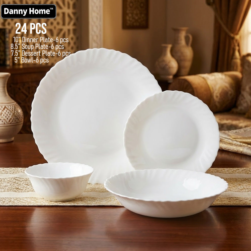 ارتقِ بتجربة تناول الطعام مع طقم عشاء داني هوم المكون من 24 قطعة، المصمم للاستخدام اليومي والمناسبات الخاصة على حد سواء. يتميز هذا الطقم الأبيض الأنيق بتصميم كلاسيكي خالد يُضفي لمسة جمالية على أي مائدة.