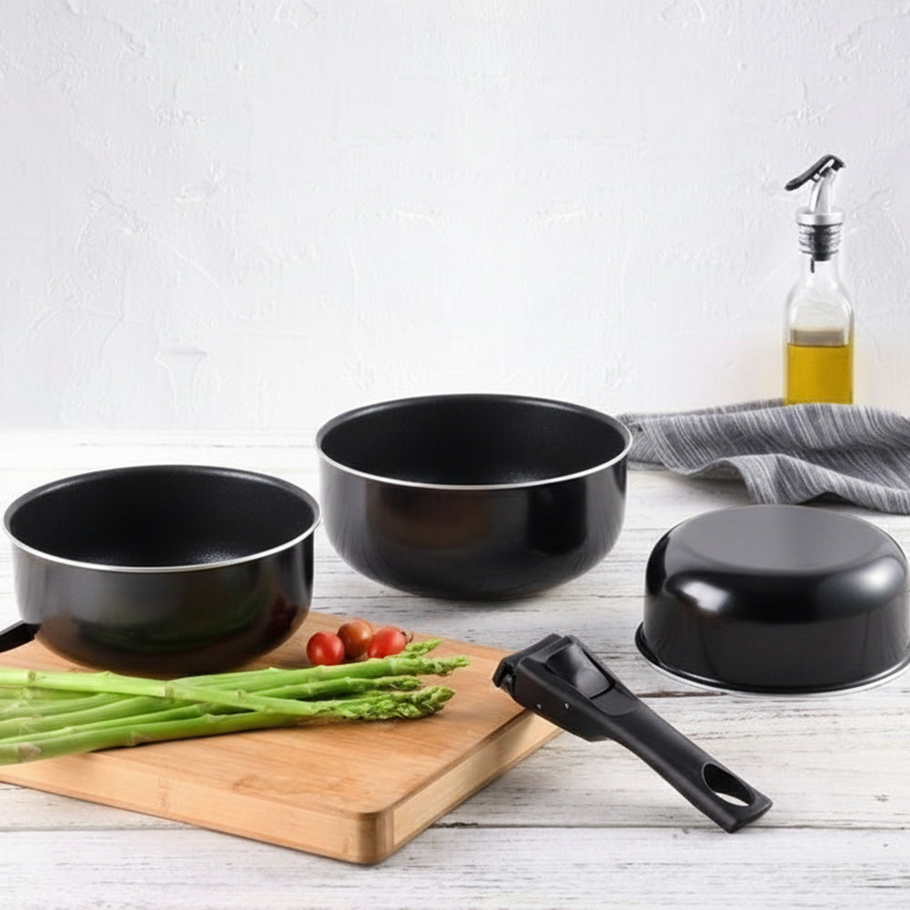 يُثبّت المقبض القابل للفصل بإحكام في كل مقلاة، مما يتيح لك الطهي والتقديم والتخزين بسهولة. مثالية لتحضير الصلصات والشوربات والمعكرونة والخضراوات، هذه المجموعة متعددة الاستخدامات متوافقة مع مختلف أنواع المواقد ومثالية للمطابخ الصغيرة والمركبات الترفيهية ورحلات التخييم.