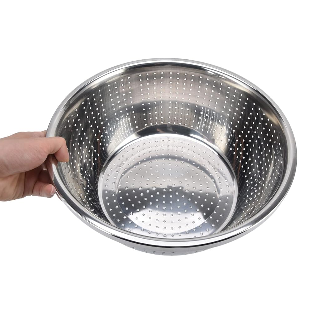 تصميم الثقوب المتناسق في المصفاة يسمح بتصريف الماء بسرعة وكفاءة، بينما يتميز الوعاء بعمق مناسب لتجميع السوائل أو الخلط بسهولة. كما أن الحواف الدائرية الناعمة تضمن استخدامًا آمنًا ومريحًا دون إيذاء اليدين.