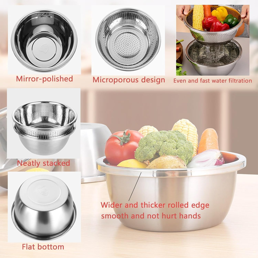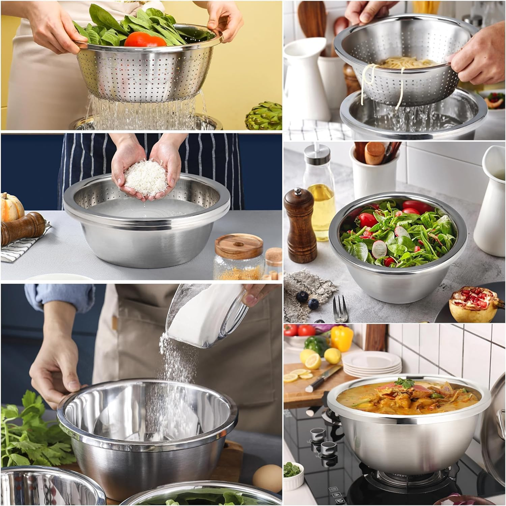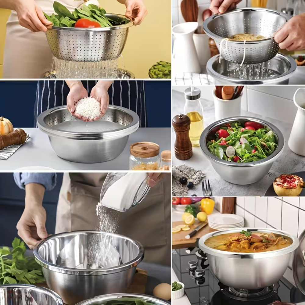 يأتي الطقم بثلاثة مقاسات مختلفة لتناسب الكميات الصغيرة والمتوسطة والكبيرة، مما يجعله مثاليًا لغسل الخضروات والفواكه، تصفية الأرز والمعكرونة، تحضير السلطات، خلط المكونات، وحتى استخدامه في بعض مهام الطهي.