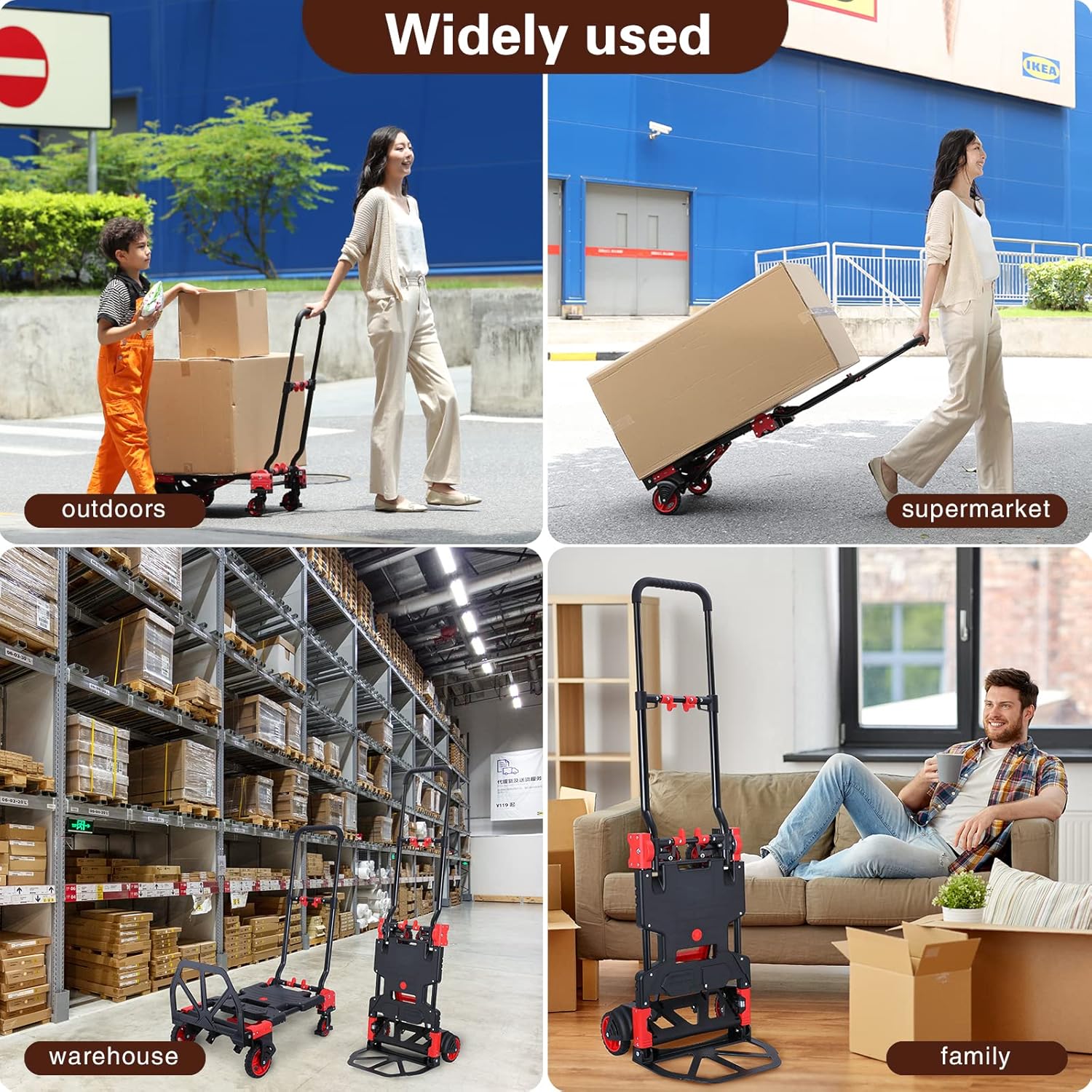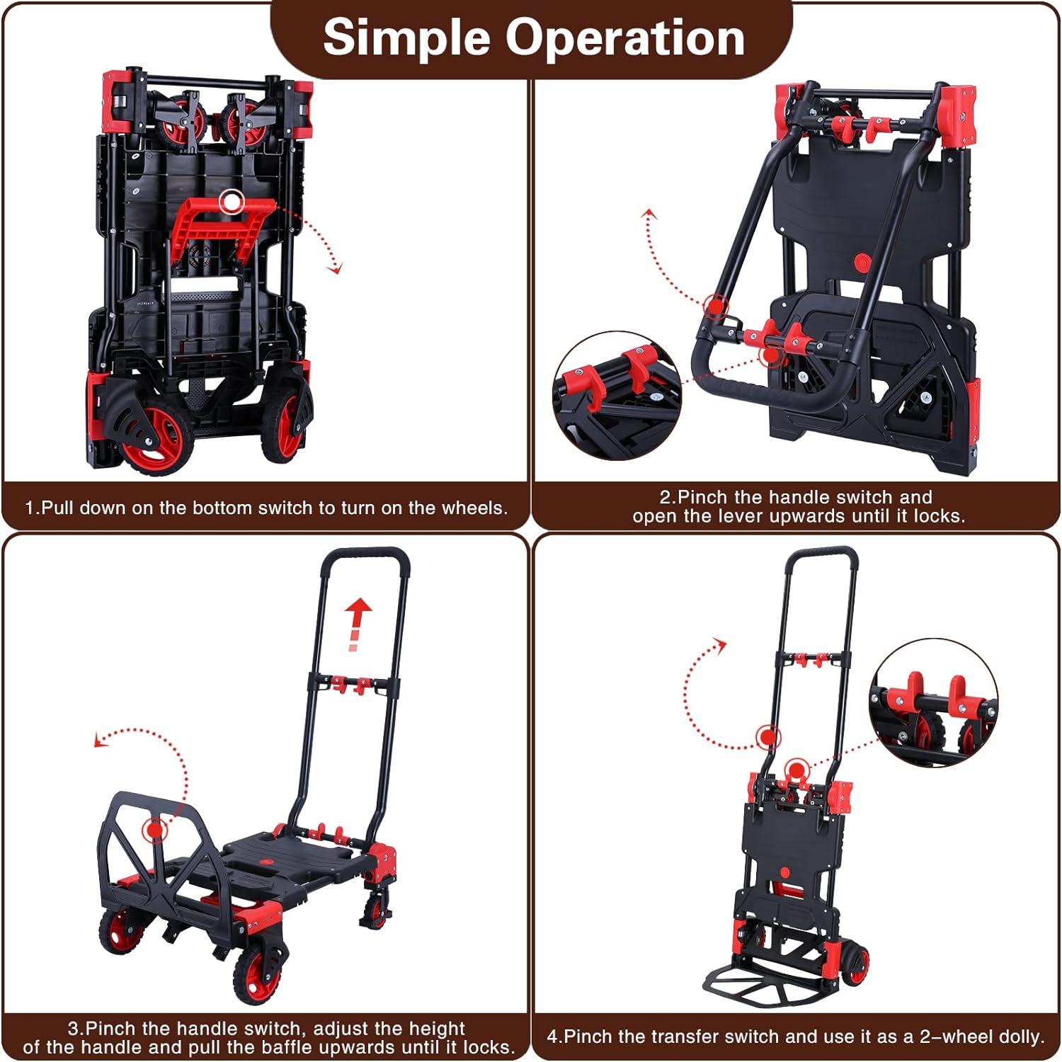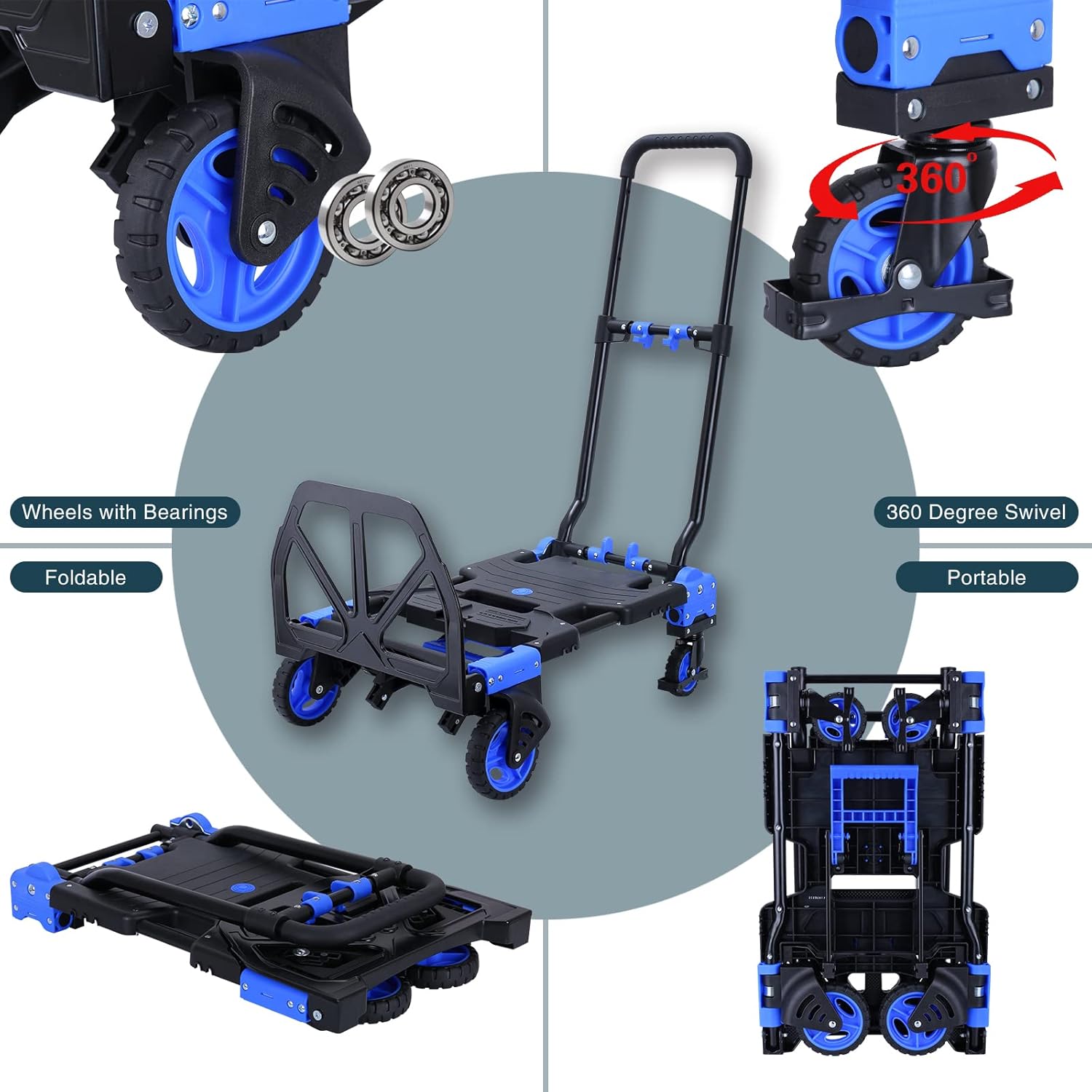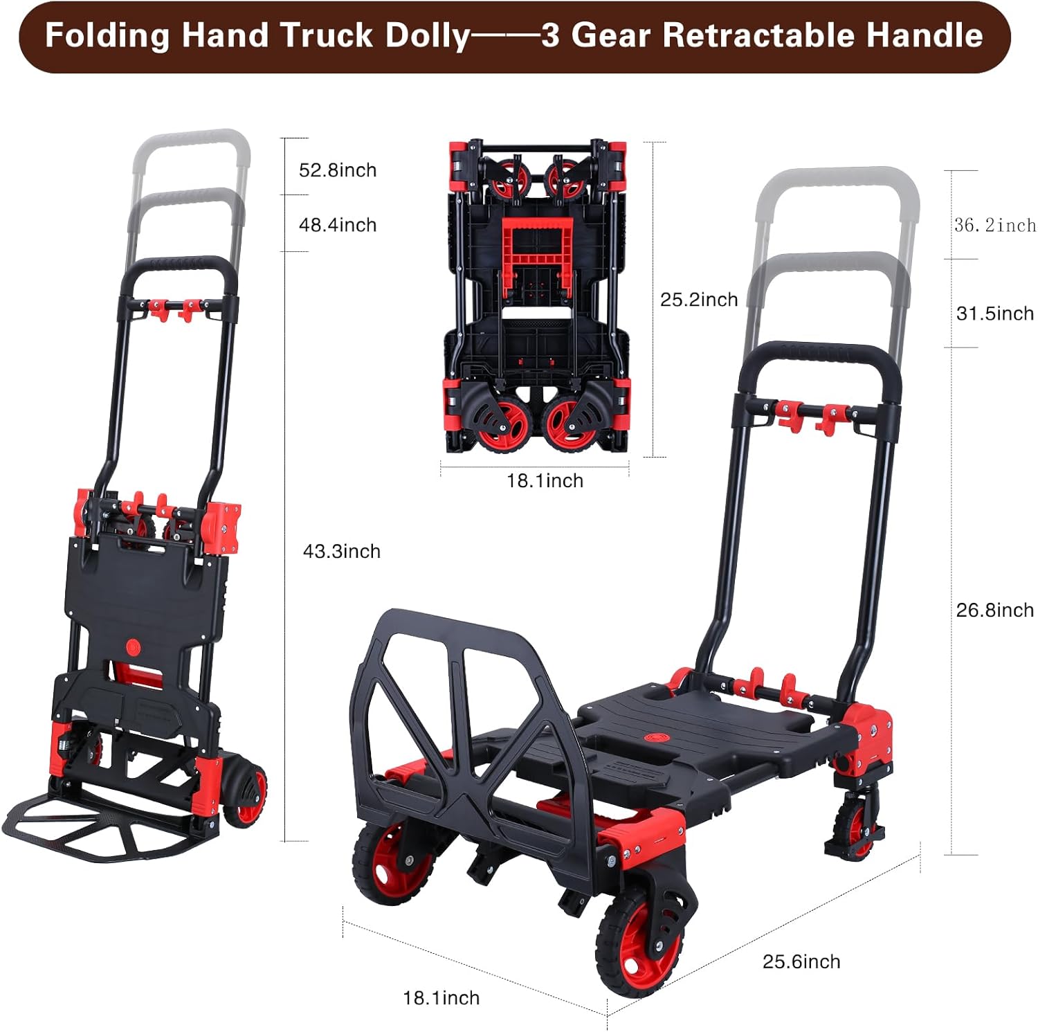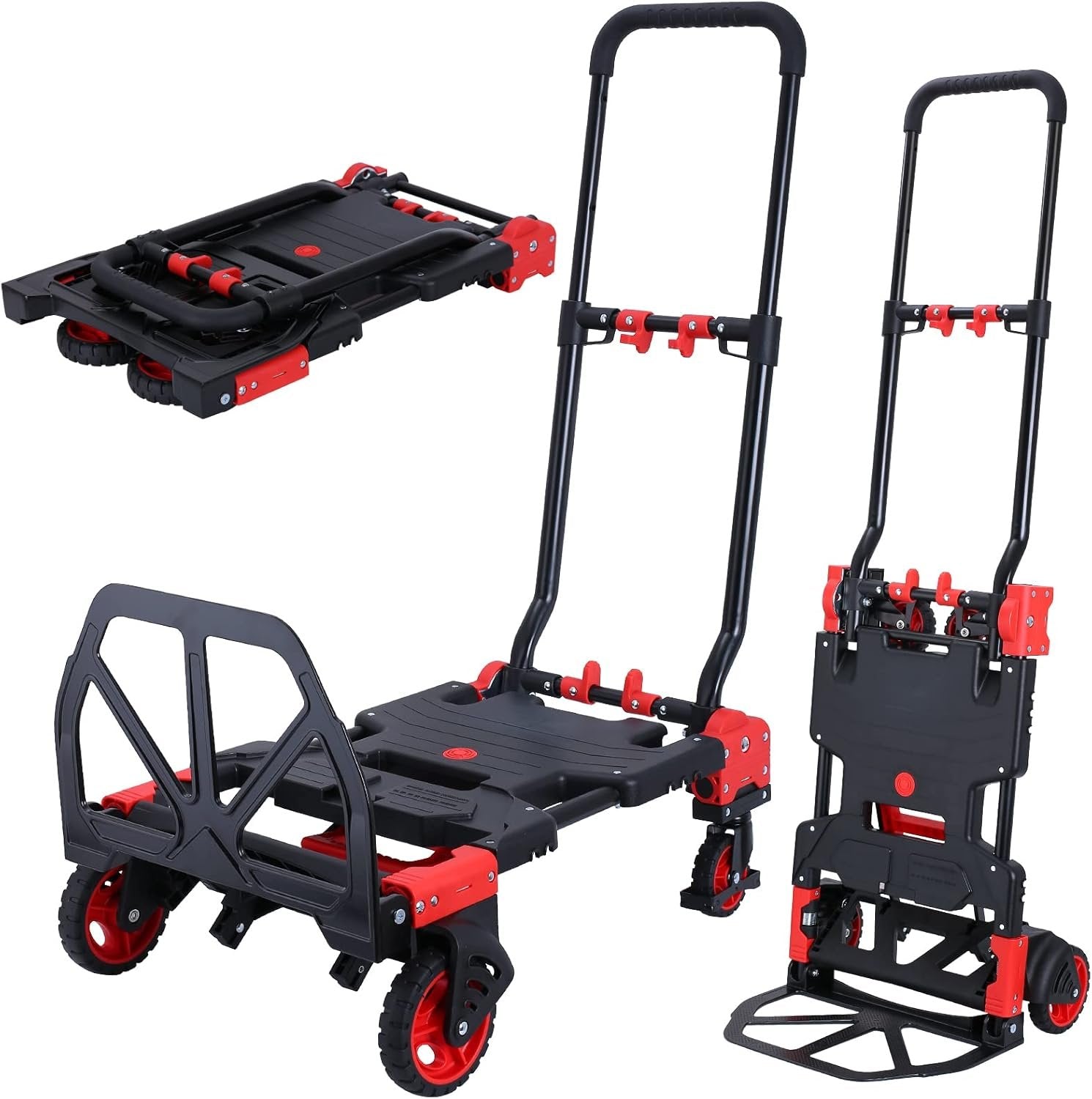2 في 1 عربة يدوية قابلة للطي دوللي 330LB حمل حمولة ، شاحنة يدوية قابلة للطي مع مقبض قابل للسحب و 4 عجلات مطاطية ، عربة يد قابلة للطي قابلة للطي للأمتعة / السفر / المكتب