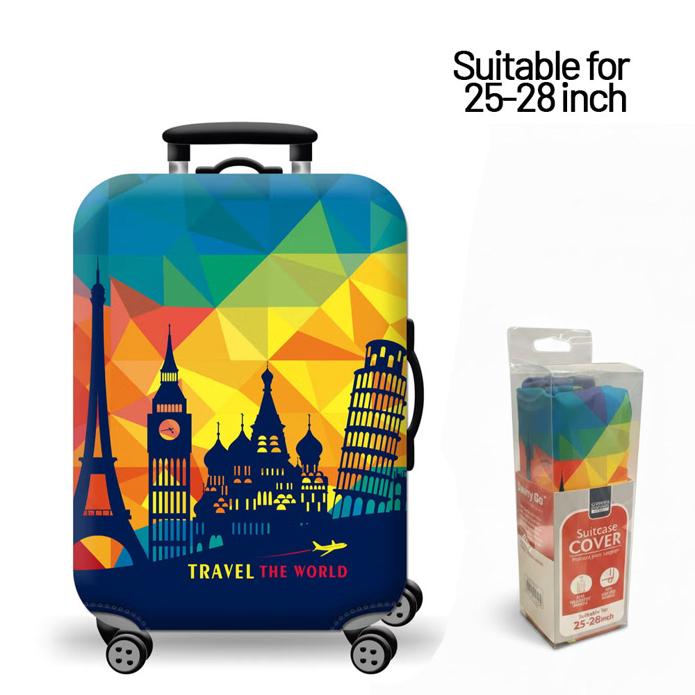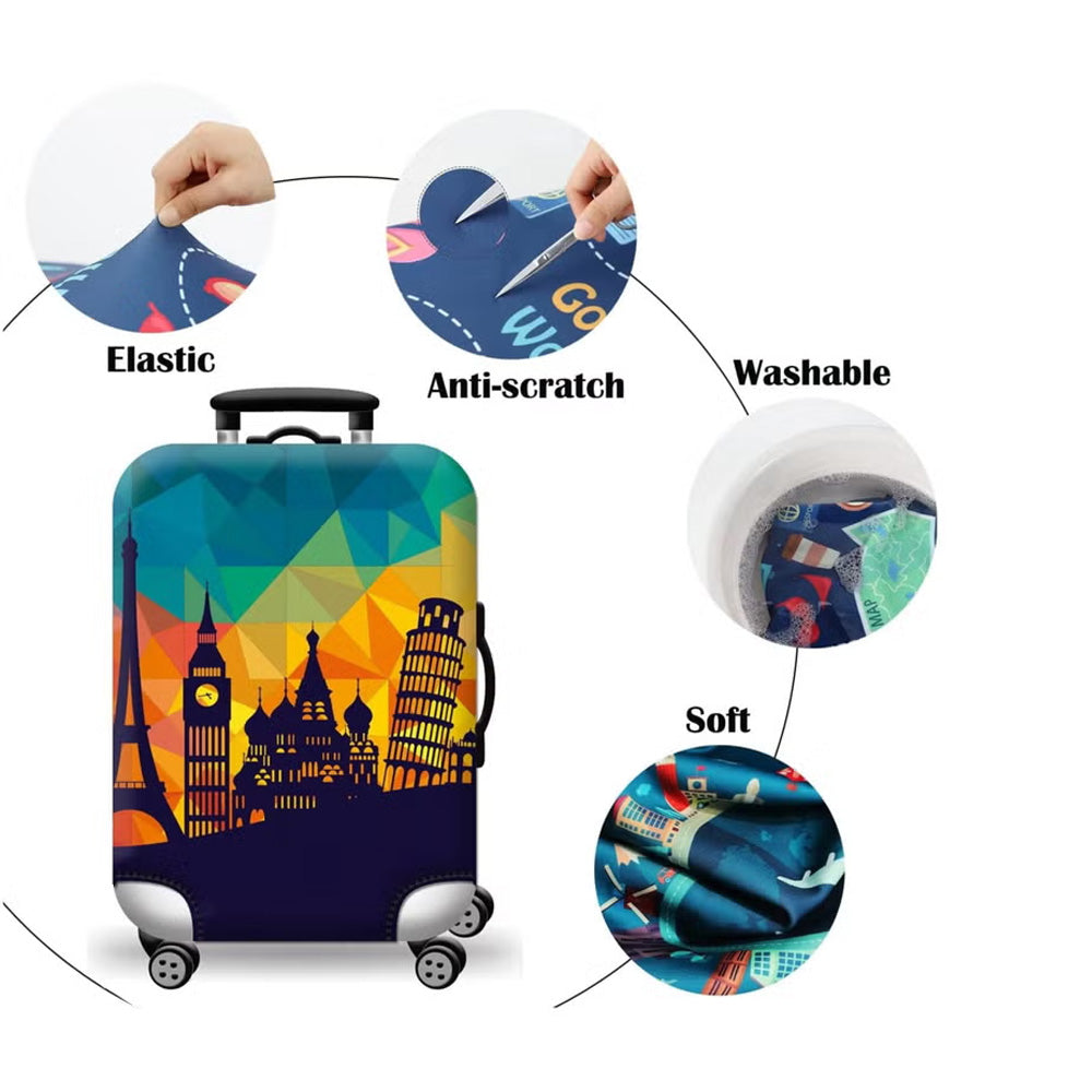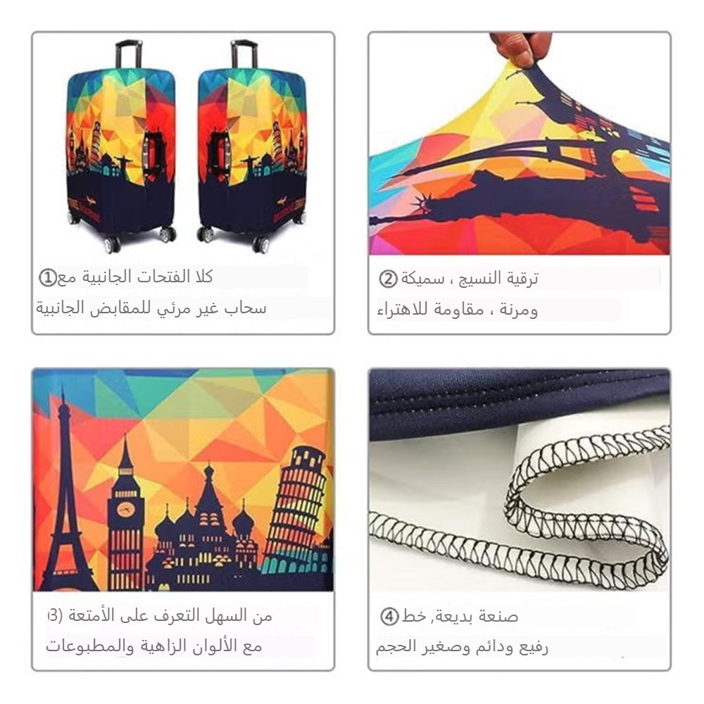 احمِ أمتعتك بأناقة مع غطاء حقيبة السفر النابض بالحياة والمرن هذا. مثالي لأي مسافر، فهو لا يحمي حقيبتك من الخدوش والأوساخ والتلف فحسب، بل يضفي عليها لمسةً من الألوان الزاهية. مثالي للحقائب متوسطة الحجم (25-28 بوصة)، يتميز بتصميم مشرق مستوحى من السفر، مزين بمعالم من جميع أنحاء العالم، مما يسهل رؤيته على حزام الأمتعة.