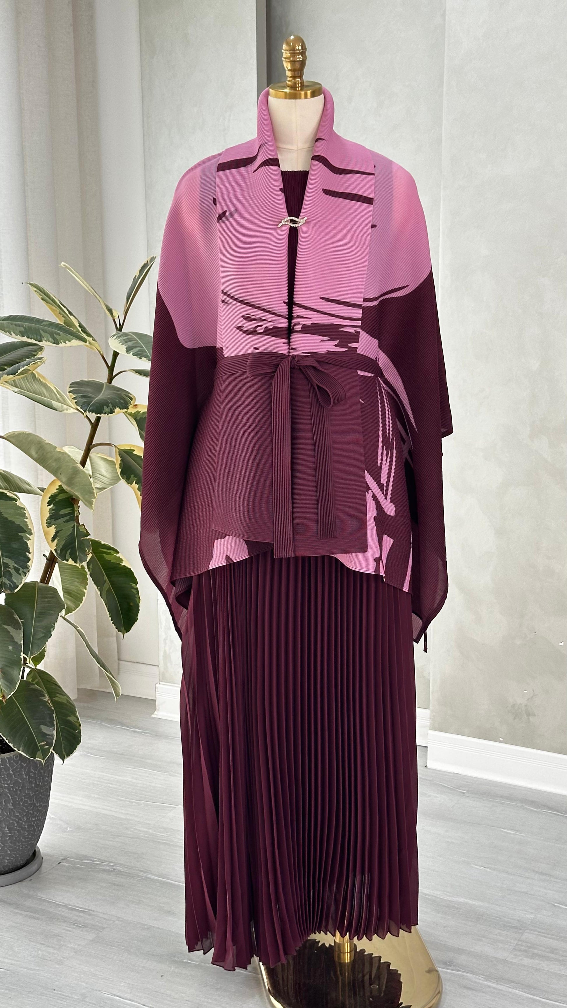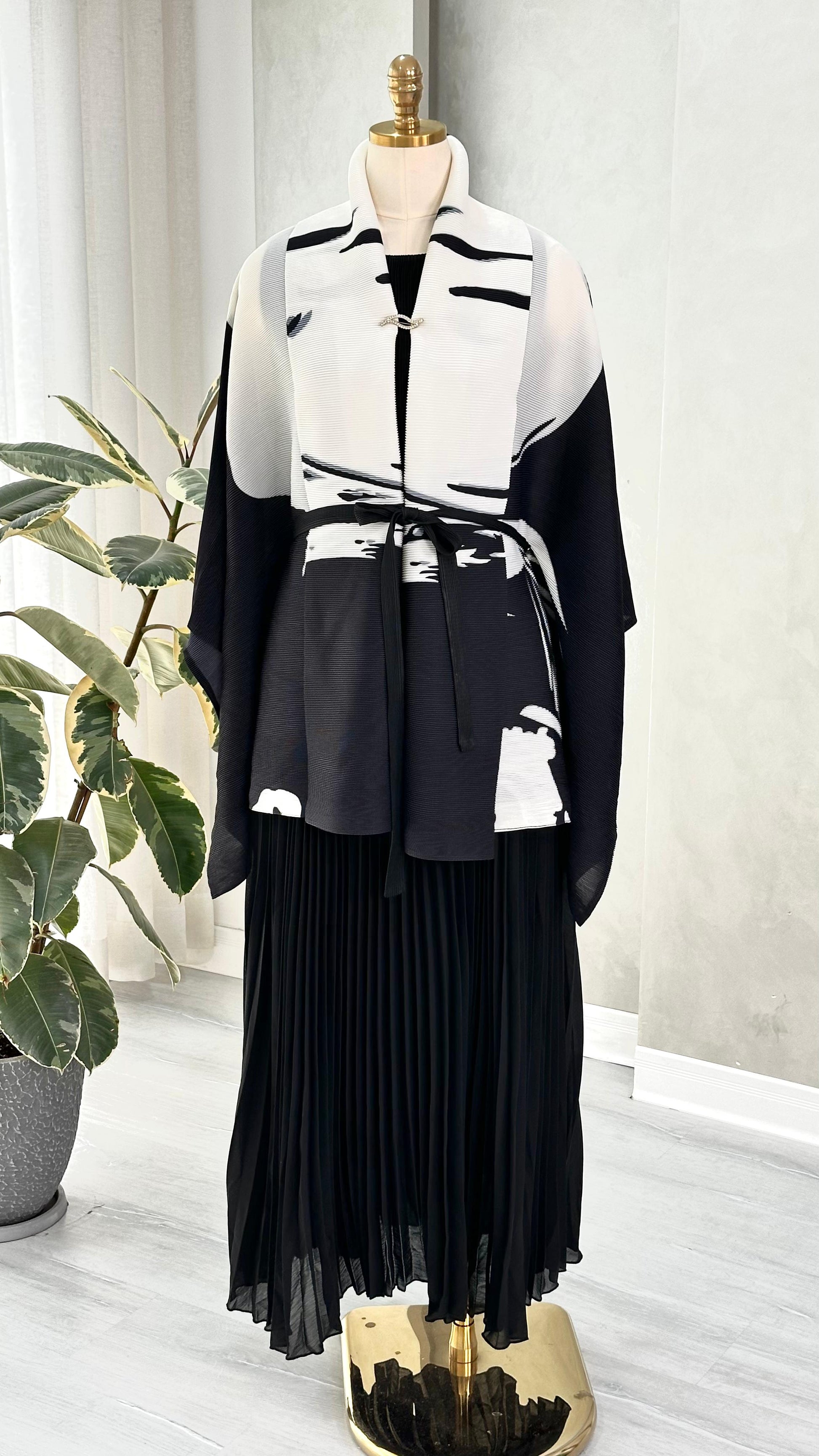 - **الجزء العلوي**: سترة واسعة ذات تصميم يشبه الكيمونو، بأكمام عريضة وطويلة تنسدل بحرية. تحتوي على حزام يربط حول الخصر ليحدد القوام ويضفي لمسة أنيقة. النقشة على القماش هندسية وعصرية، وتغطي كامل السترة بشكل متناسق.