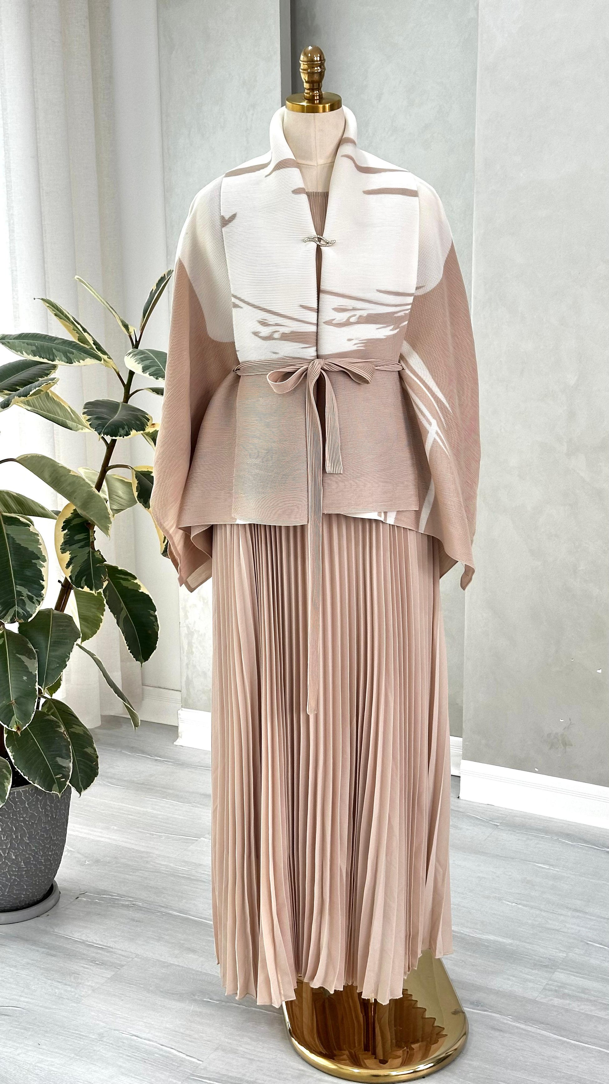 - **الجزء السفلي**: تنورة طويلة ذات طيات دقيقة تبدأ من الخصر وتمتد حتى الأسفل، مما يمنحها حركة انسيابية وأناقة كلاسيكية. التنورة مصممة لتكون فضفاضة وتنساب بسلاسة مع الحركة.