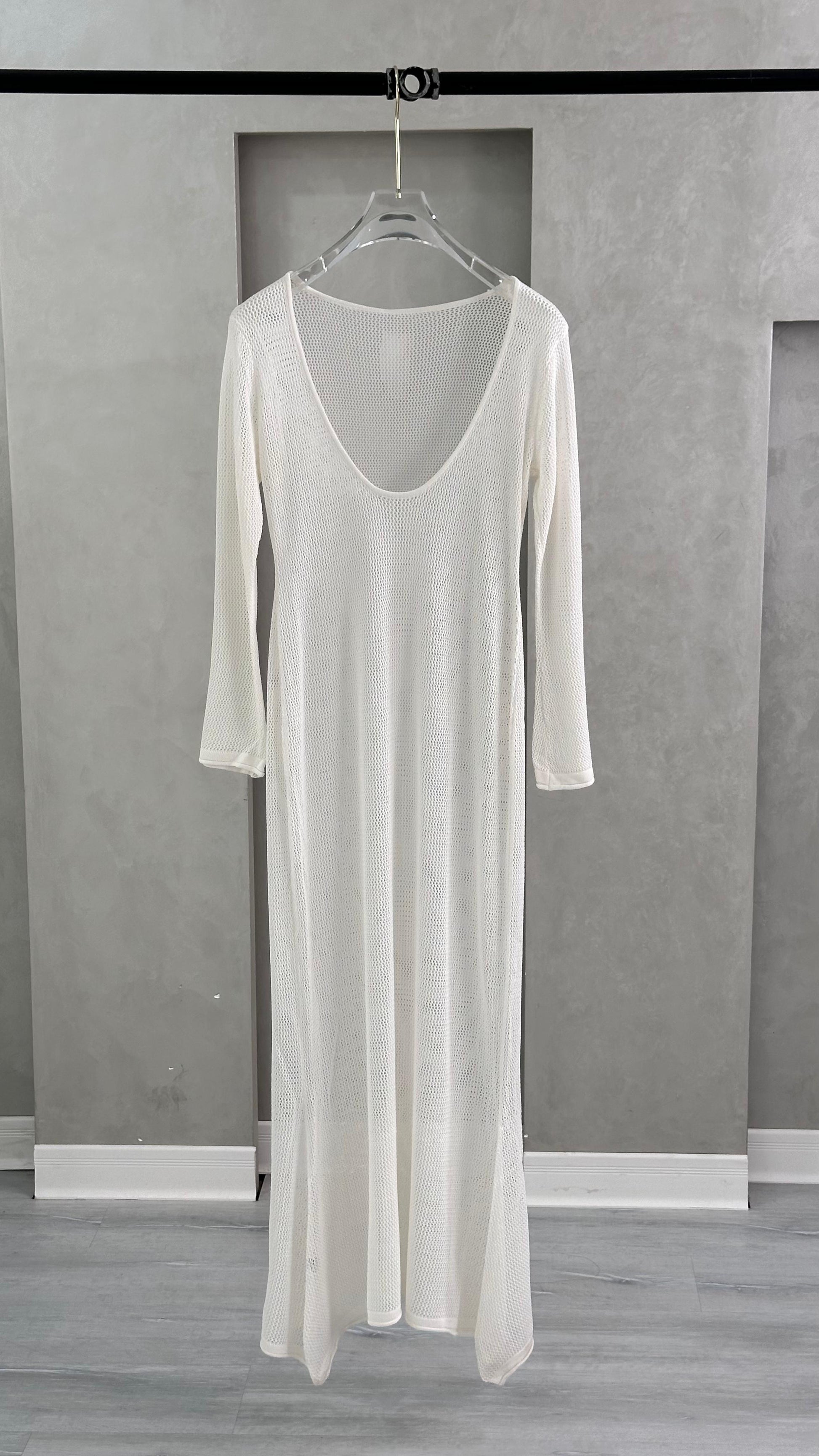 فستان طويل بتصميم بسيط وناعم. قصّته مستقيمة وملامسة للجسم من الأعلى مع اتساع خفيف عند الأسفل. يتميز بفتحة رقبة واسعة وعميقة على شكل حرف U، وأكمام طويلة تنسدل بشكل مستقيم. طوله يصل تقريبًا إلى الأرض ويمنح مظهرًا انسيابيًا وهادئًا.
