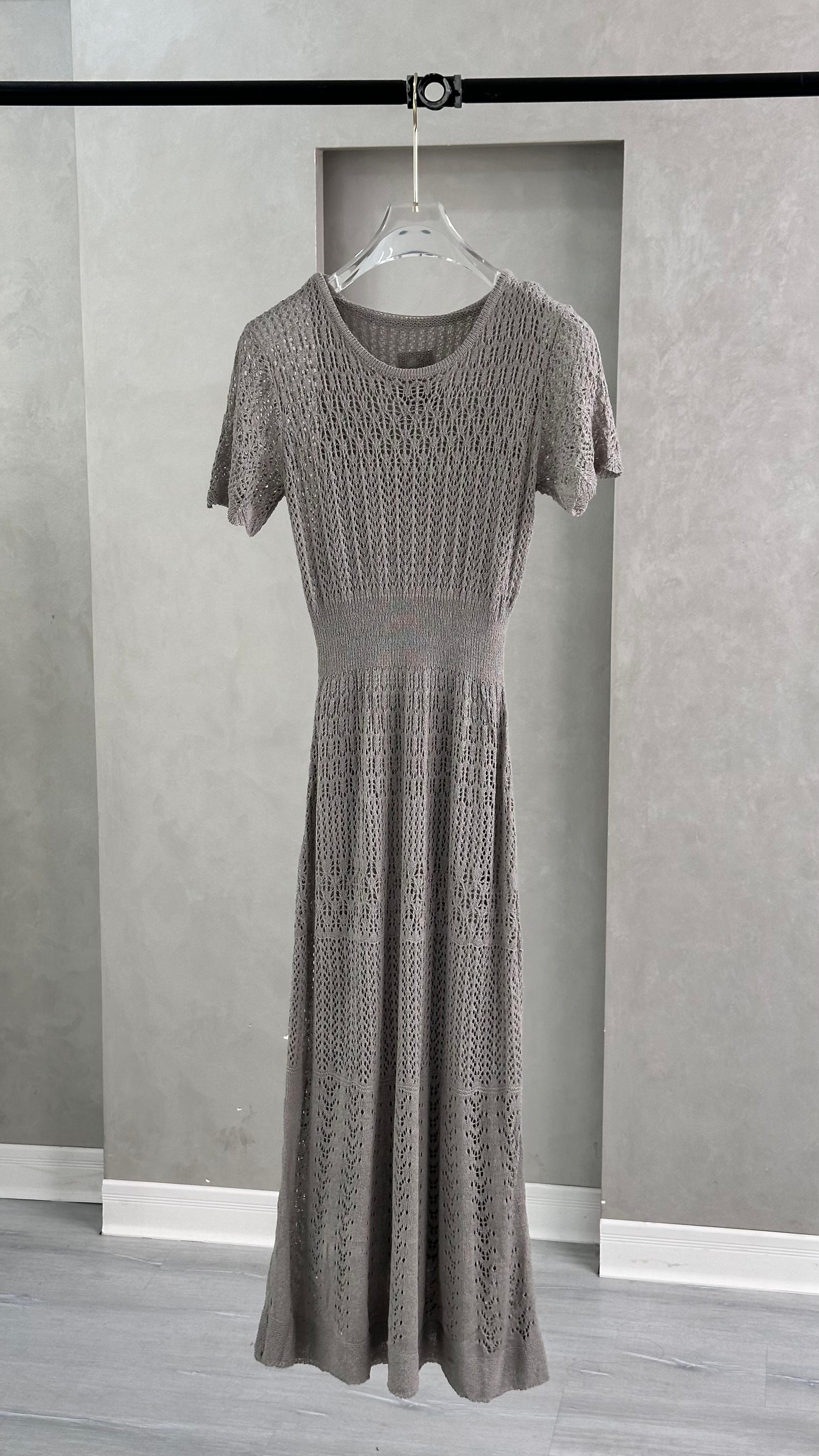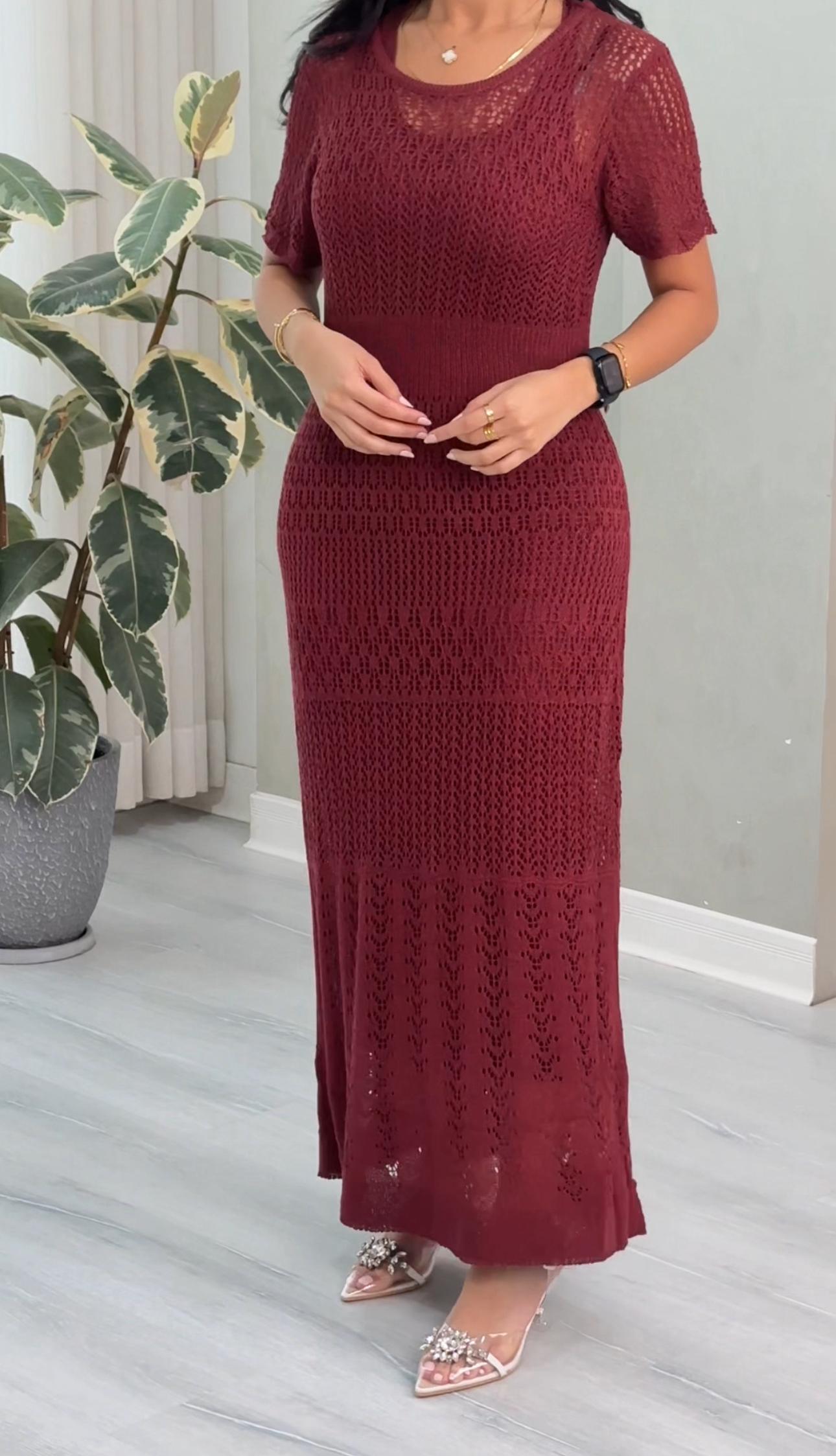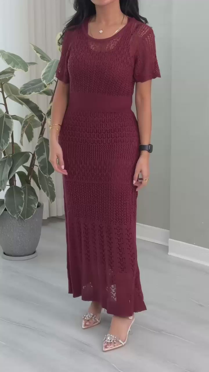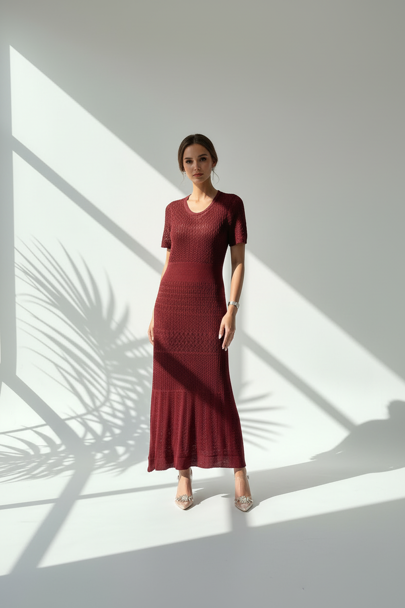 فستان طويل بأكمام قصيرة وياقة دائرية، مصنوع من خيوط محاكة بتفاصيل متكررة تمنحه ملمساً زخرفياً ومظهر شبه شفاف. يُنسّق مع إكسسوارات ناعمة وحذاء بكعب مزين بعناصر لامعة.