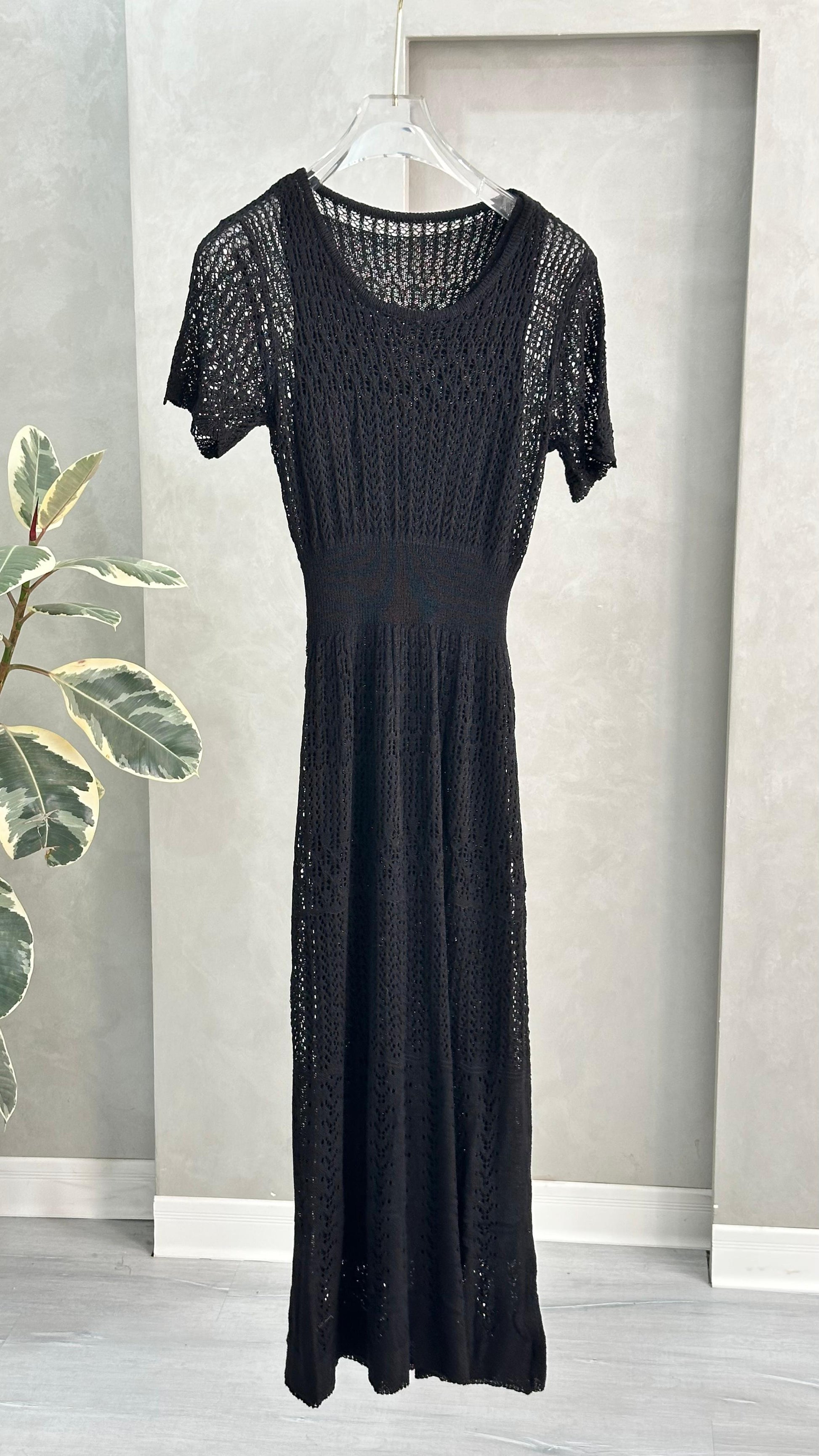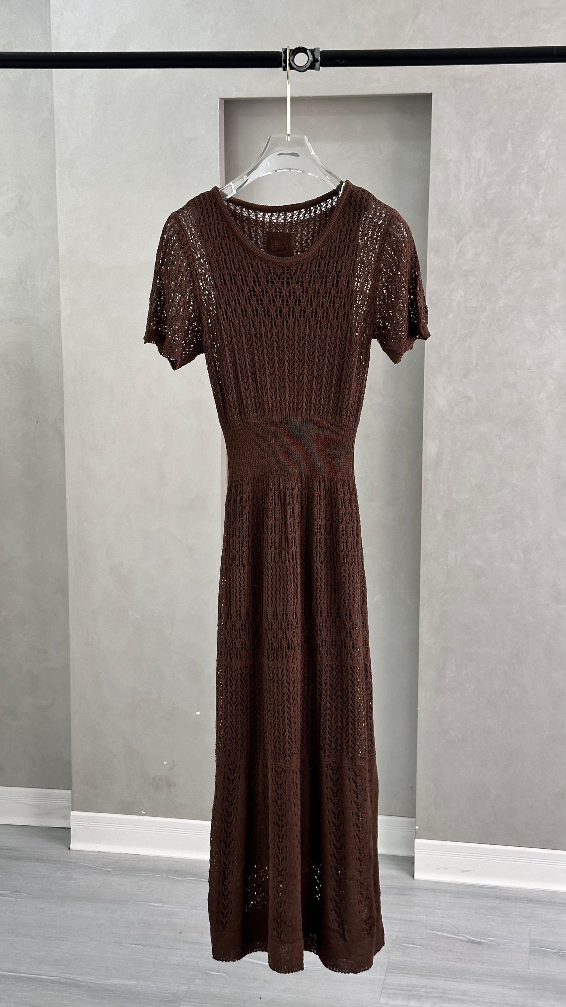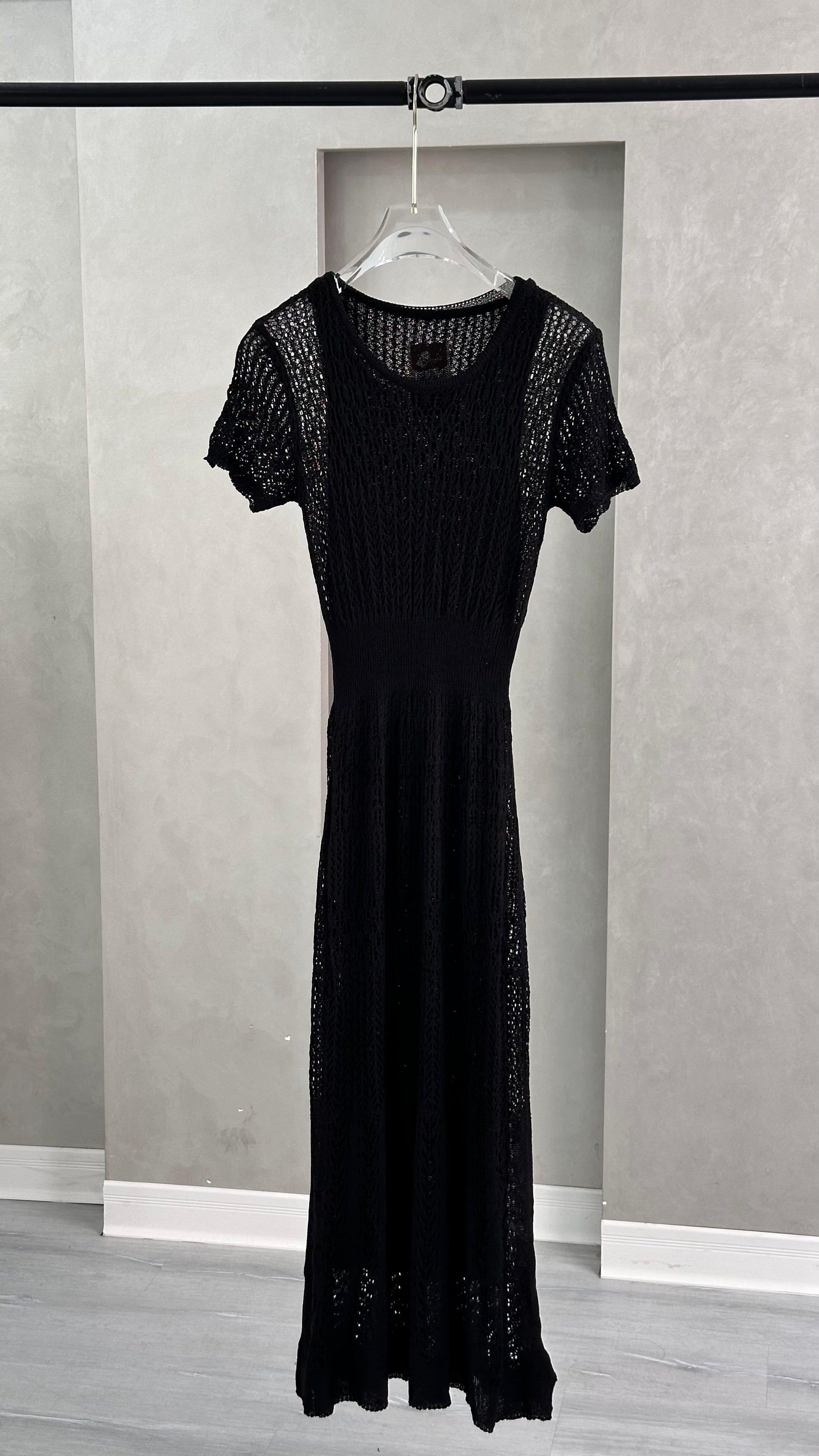 فستان طويل بأكمام قصيرة وياقة دائرية، مصنوع من خيوط محاكة بتفاصيل متكررة تمنحه ملمساً زخرفياً ومظهر شبه شفاف. يُنسّق مع إكسسوارات ناعمة وحذاء بكعب مزين بعناصر لامعة.